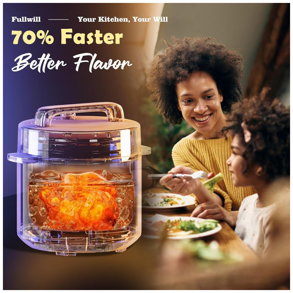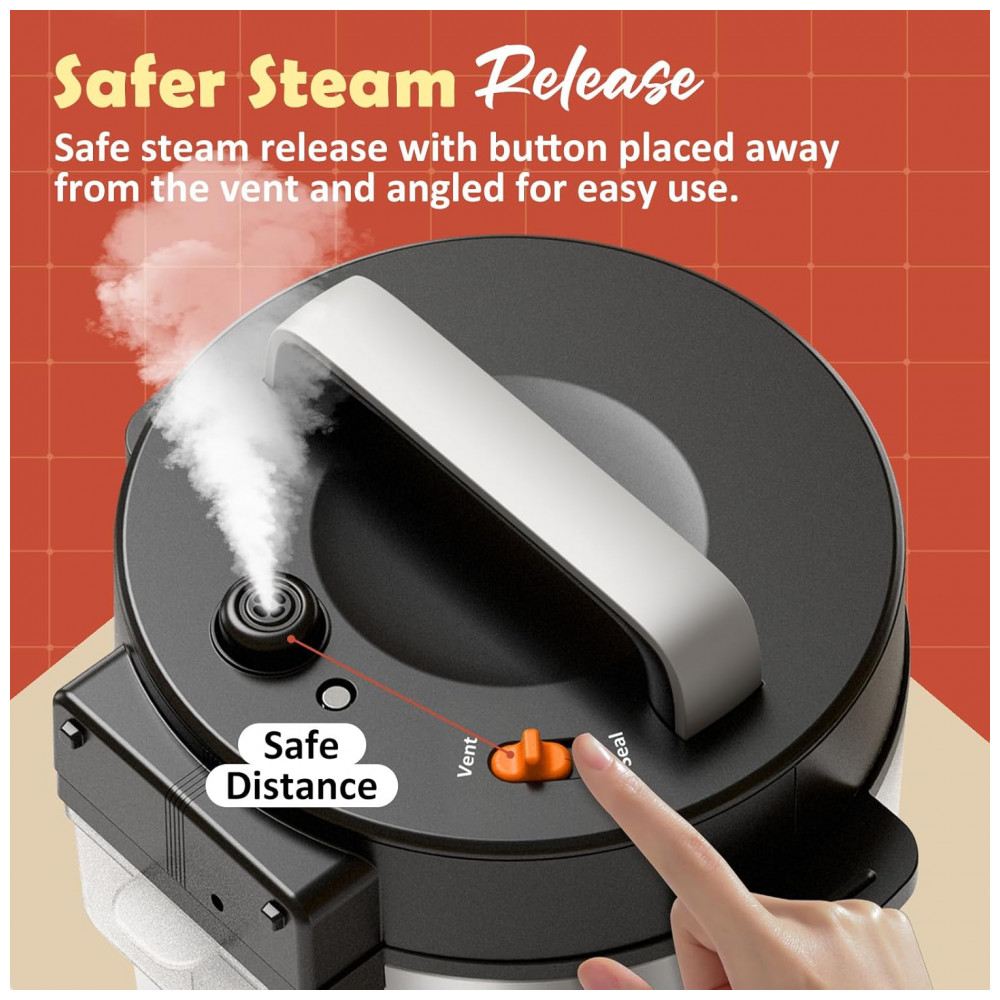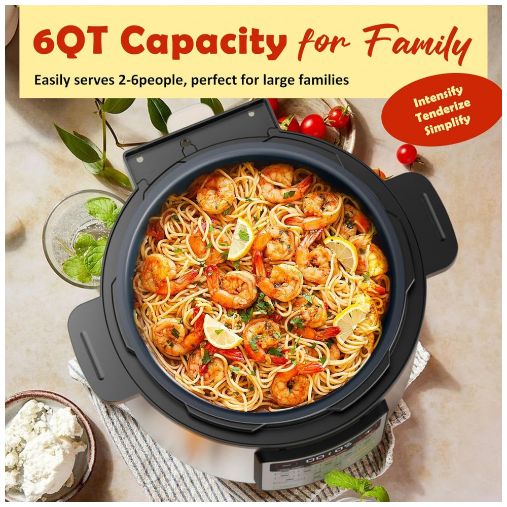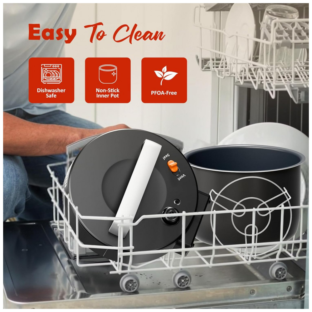 Desfrute de 9 eletrodomésticos em 1 com a Panela de Pressão Fullwill: panela de pressão, panela de cozimento lento, panela de arroz, fabricante de iogurte, fabricante de bolo, frigideira para refogar, cozinha a vapor, aquecedor de comida e preparador de sopas. Com 12 programas pré-definidos personalizáveis, incluindo cozimento rápido, cozimento lento, aves, vapor, mingau, sopa, feijão/chili, bolo, carne/guisado, arroz/grãos, refogar e iogurte, oferecendo máxima versatilidade para diversas necessidades culinárias. Cozinha refeições até 70 mais rápido que os métodos tradicionais, economizando energia e tempo, ideal para estilos de vida agitados. Possui mais de 10 recursos de segurança, proteção contra superaquecimento, trava de segurança de tampa e controle de pressão. O botão SealVent está posicionado longe da válvula de liberação de vapor, e o design de liberação de vapor inclinado para trás garante uma liberação mais segura, sem riscos de queimaduras. Design saudável sem PFOA, com uma panela interna antiaderente livre de produtos químicos nocivos. Fácil de limpar, com estrutura em aço inoxidável resistente a impressões digitais e tampa, panela interna e acessórios próprios para lava-louças, garantindo uma limpeza sem esforço. Com capacidade familiar de 6 litros, perfeita para preparar refeições para famílias ou grandes eventos.
