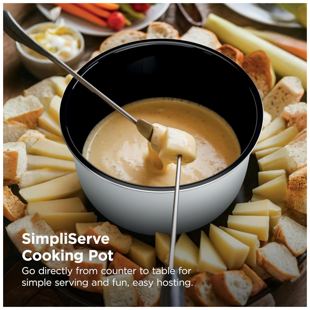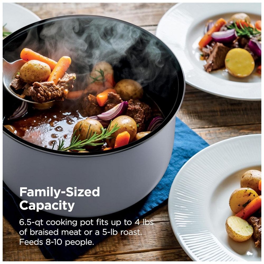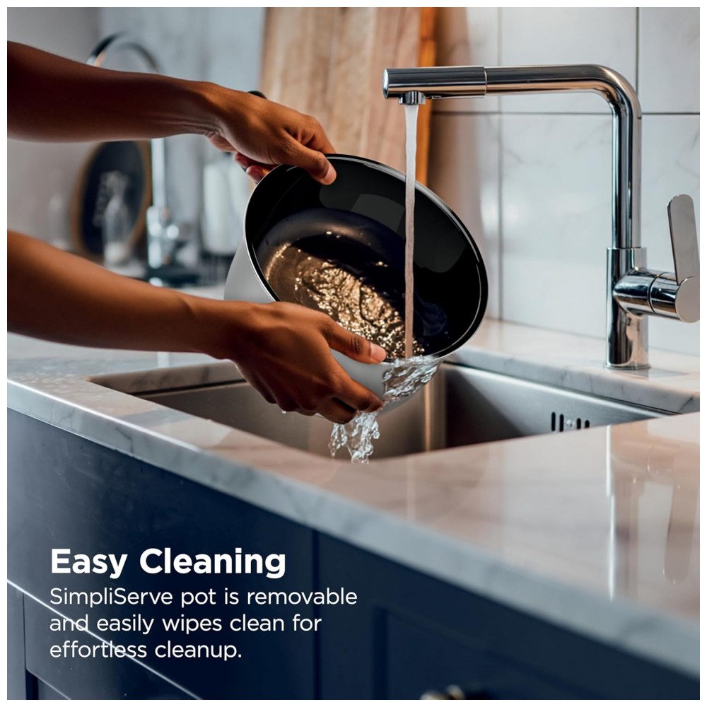 Acompanha cuba SimpliServe Pot com revestimento cerâmico antiaderente livre de PFAS, projetada para ser removida diretamente da base e utilizada como peça de servir sobre a mesa. A tampa com travamento de segurança, válvula de alívio de pressão e conjunto de vedação foram dimensionados para uso doméstico, com operação por botões e visor digital na parte frontal para seleção de modos e ajustes de tempo.