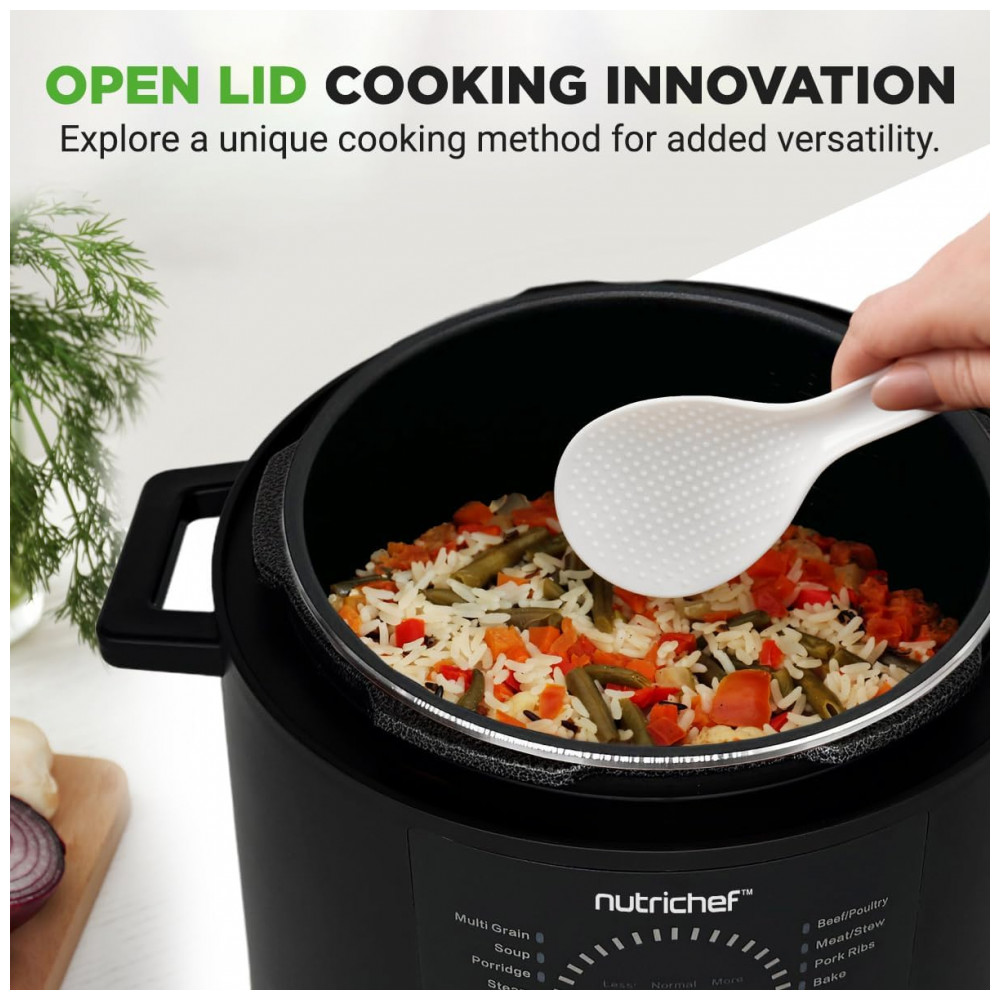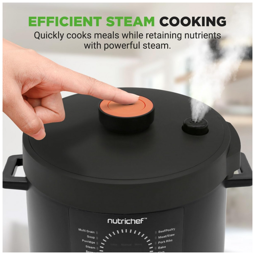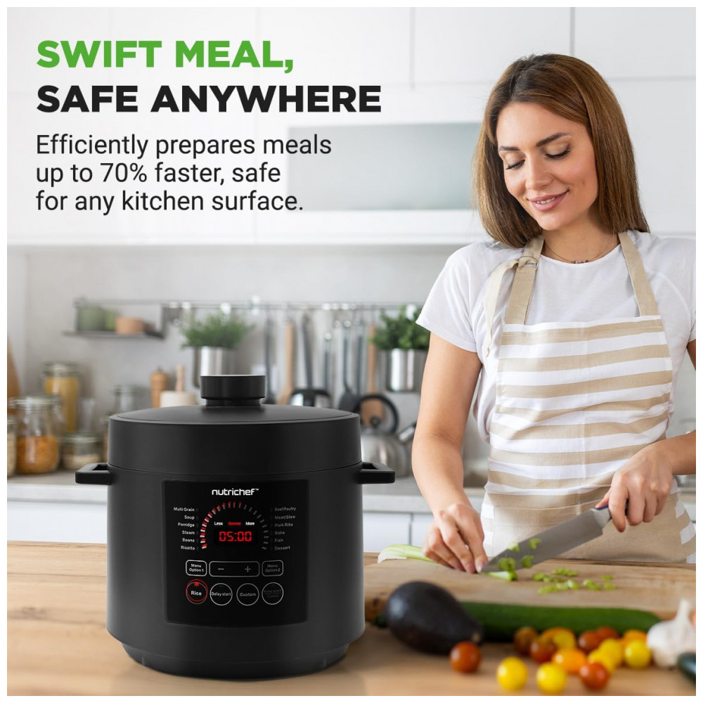 Desfrute de uma culinária versátil com a Panela de Pressão Elétrica NutriChef, que oferece 9 modos predefinidos. Cozinhe, asse, coza a vapor, doure, refogue e faça guisados com precisão, simplificando o preparo das refeições com opções versáteis. Controle digital inteligente permite programar o cozimento com ajuste de tempo e temperatura no visor LED digital e painel de controle sensível ao toque. A cocção sob pressão mantém os sabores naturais, enquanto o exclusivo modo Open Lid adiciona versatilidade. Prepare refeições até 70% mais rápido com a panela de pressão elétrica de 5,7 litros. Temporizador ajustável de até 240 minutos para uma preparação eficiente adaptada ao seu estilo de vida agitado. Design seguro e resistente a manchas, garantindo uma utilização sem preocupações. A embalagem vem com uma xícara de medição e colher de arroz para uma preparação conveniente. Adquira já a Panela de Pressão Elétrica NutriChef, uma adição confiável ao seu arsenal culinário.