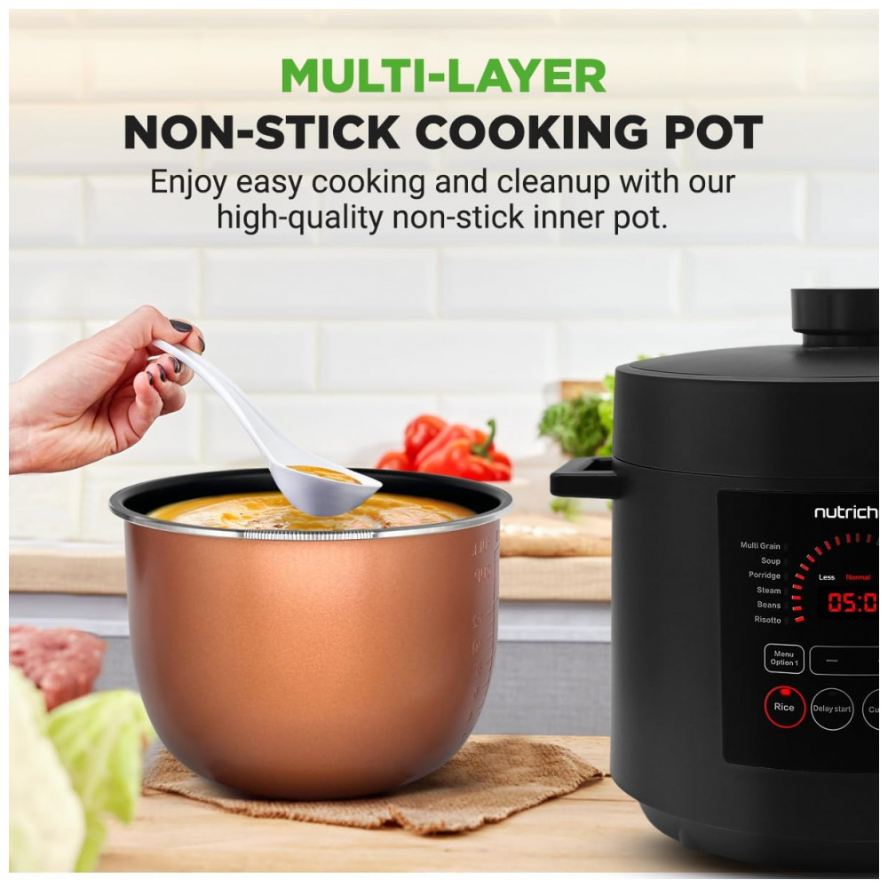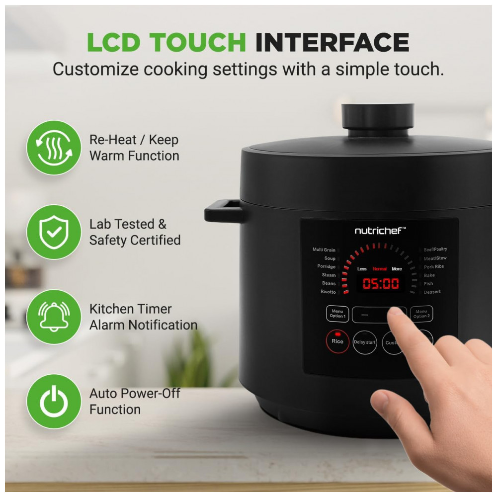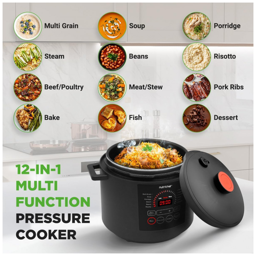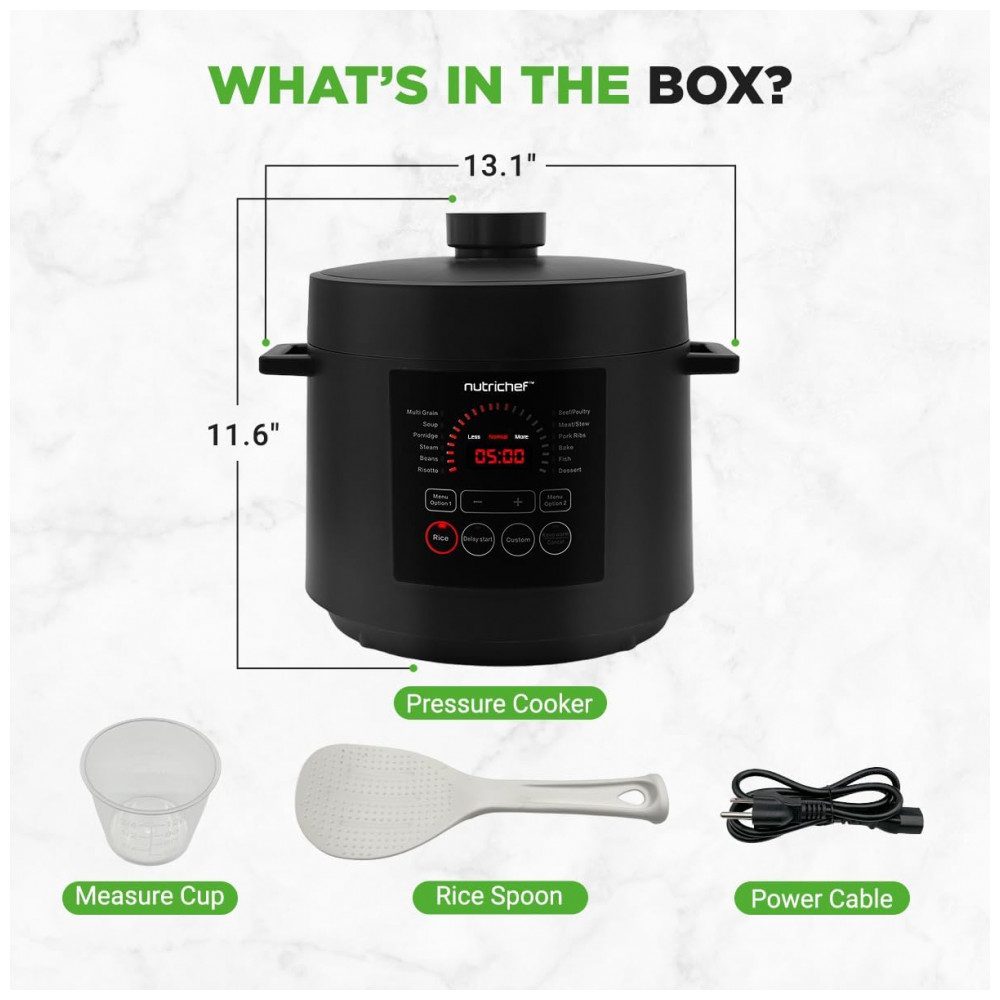 Desfrute de uma culinária versátil com a Panela de Pressão Elétrica NutriChef, que oferece 9 modos predefinidos. Cozinhe, asse, coza a vapor, doure, refogue e faça guisados com precisão, simplificando o preparo das refeições com opções versáteis. Controle digital inteligente permite programar o cozimento com ajuste de tempo e temperatura no visor LED digital e painel de controle sensível ao toque. A cocção sob pressão mantém os sabores naturais, enquanto o exclusivo modo Open Lid adiciona versatilidade. Prepare refeições até 70% mais rápido com a panela de pressão elétrica de 5,7 litros. Temporizador ajustável de até 240 minutos para uma preparação eficiente adaptada ao seu estilo de vida agitado. Design seguro e resistente a manchas, garantindo uma utilização sem preocupações. A embalagem vem com uma xícara de medição e colher de arroz para uma preparação conveniente. Adquira já a Panela de Pressão Elétrica NutriChef, uma adição confiável ao seu arsenal culinário.