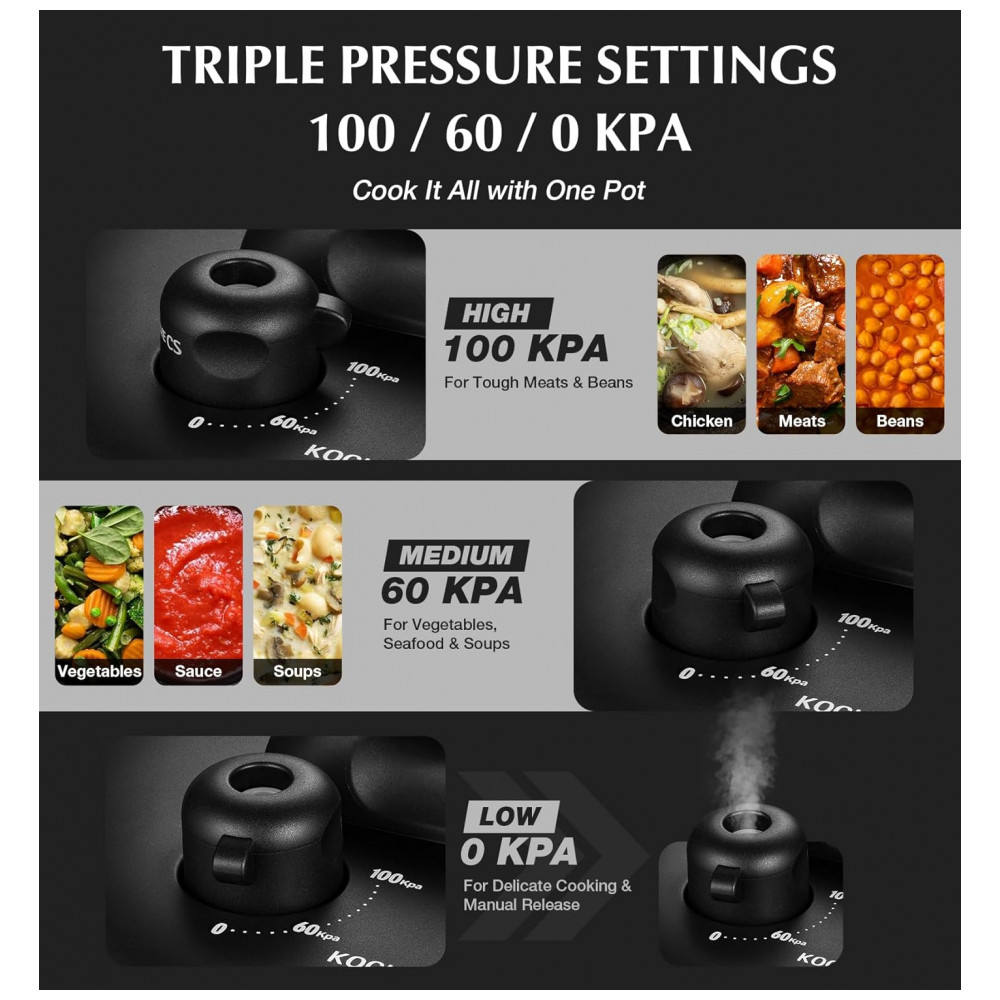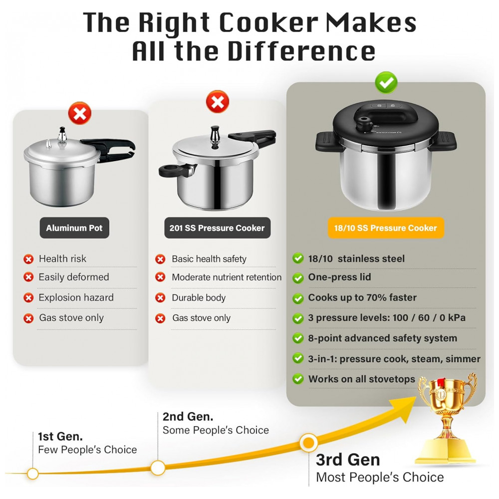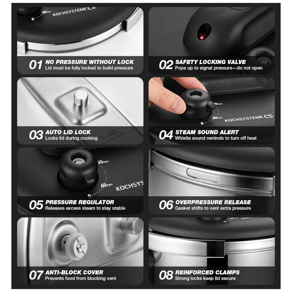 Operação OnePress sem Esforço – Destrave e trave a tampa da panela de pressão com apenas uma mão, sem torções, sem esforço. O design de pressão para travar sem emendas torna a panela de pressão rápida e fácil de usar, mesmo quando suas mãos estão ocupadas. Adeus mecanismos complicados, olá controle intuitivo. Economize até 70% do tempo de cozimento – Cozinhe de forma mais inteligente, não mais longa. Esta panela de pressão de alta performance em aço inoxidável reduz o tempo de cozimento em até 70% em comparação com panelas tradicionais e supera muitas outras panelas de pressão para fogão. Perfeito para amaciar cortes difíceis, cozinhar feijão ou fazer ensopados em uma fração do tempo. Aço Inoxidável Premium 18/10 de Grau Alimentício – Fabricada em aço inoxidável 304 com uma mistura de cromo-níquel 18/10, esta panela de pressão resiste à ferrugem, corrosão e descoloração muito melhor do que o aço inoxidável 201 ou alumínio. A panela de pressão mantém os sabores puros, mantém o brilho e oferece durabilidade duradoura para anos de cozimento seguro e saudável. 3 Configurações de Pressão Ajustáveis (100, 60, 0 kPa) – Oferece 100 kPa para carnes difíceis, 60 kPa para refeições do dia a dia como arroz e ensopados, e 0 kPa para cozinhar delicadamente peixes, ovos e muito mais. Sistema de Proteção de Segurança 8 em 1 – Equipado com 8 recursos avançados de segurança para garantir um cozimento seguro toda vez: a pressão só aumenta quando a tampa está travada, uma válvula de auto-travamento impede a abertura sob pressão, e um apito alerta de vapor sinaliza quando desligar o calor. Recursos adicionais incluem um regulador de pressão, ventilação de sobpressão, escudo antibloqueio e grampos de tampa reforçados – tudo projetado para operação sem preocupações. Versatilidade 3 em 1 – Panela de Pressão, Vaporizador, Panela de Cozimento Lento – Esta panela de pressão de aço inoxidável de 6,3 litros faz mais do que apenas cozinhar sob pressão. A panela de 6,3 litros vem com uma grade de vapor e uma tampa de vidro, permitindo alternar facilmente entre cozinhar sob pressão, cozinhar no vapor dumplings ou legumes, ou cozinhar lentamente sopas e molhos – tudo em um único e elegante eletrodoméstico. Base de Aço Inoxidável Trilaminar Pronta para Indução – Construída para durabilidade e desempenho, a base de aço inoxidável trilaminar da olla a presion oferece aquecimento rápido, uniforme e excelente resistência ao empenamento. Compatível com indução, gás, elétrico e cerâmico – perfeita para qualquer configuração de cozinha. A tampa da panela de pressão não é segura para lava-louças. Capacidade Familiar de 6,3 litros- Espaçosa o suficiente para um frango, ideal para famílias de 2 a 4 pessoas. Seja para preparar refeições com antecedência, cozinhar sopa ou fazer jantares durante a semana, este tamanho acomoda tudo com espaço de sobra.