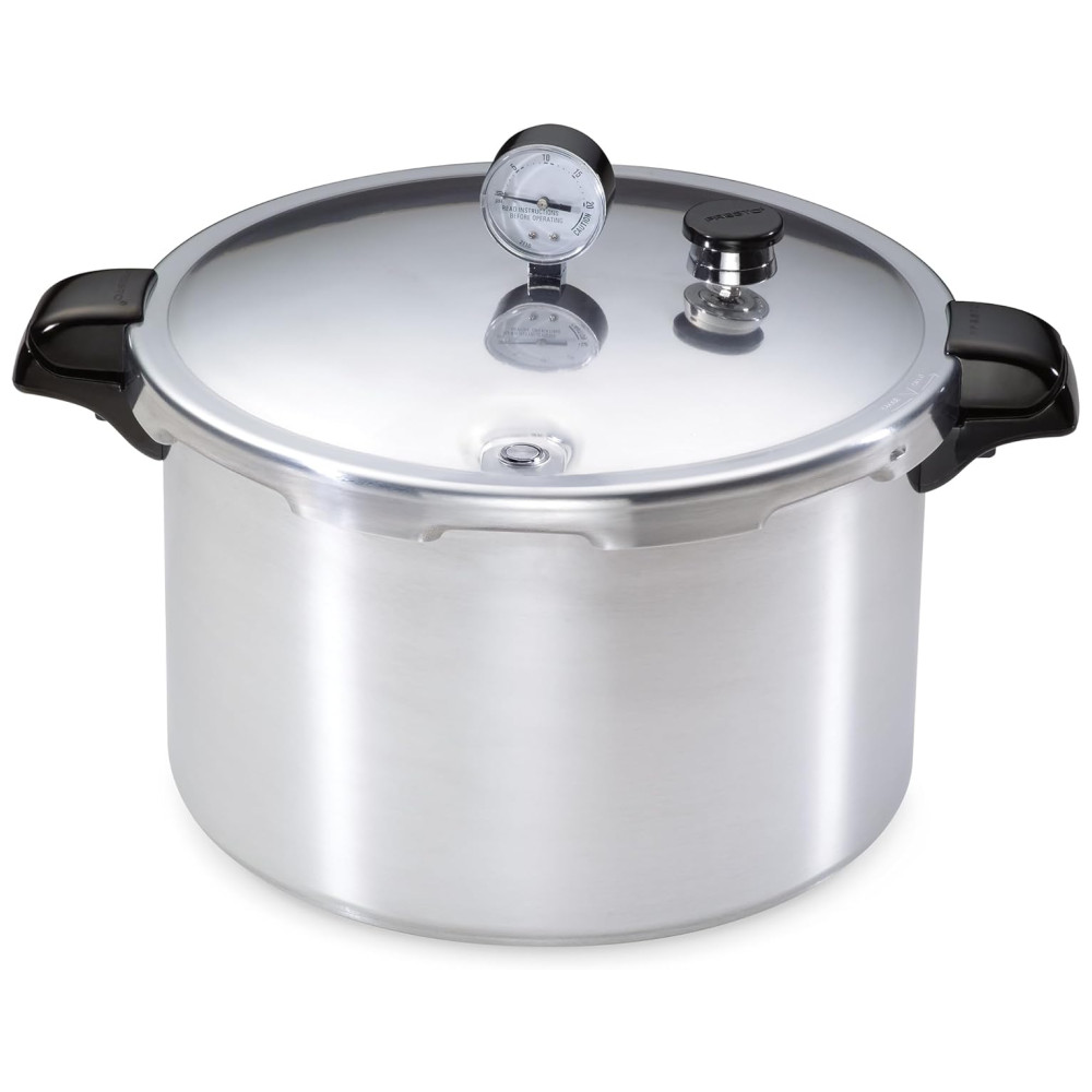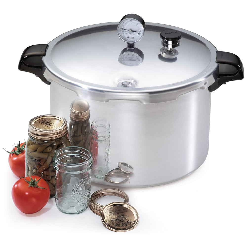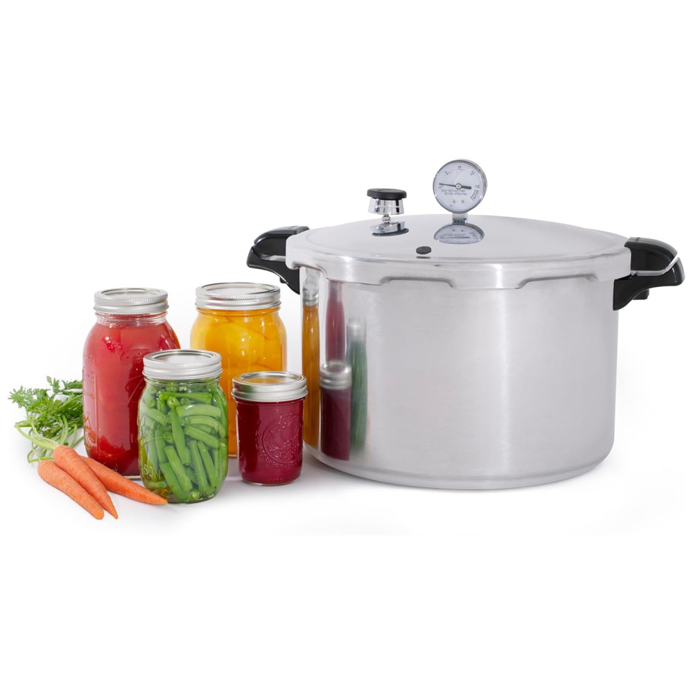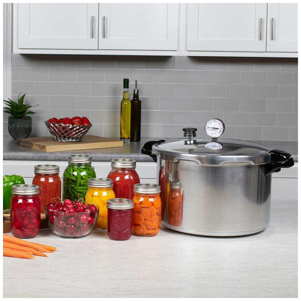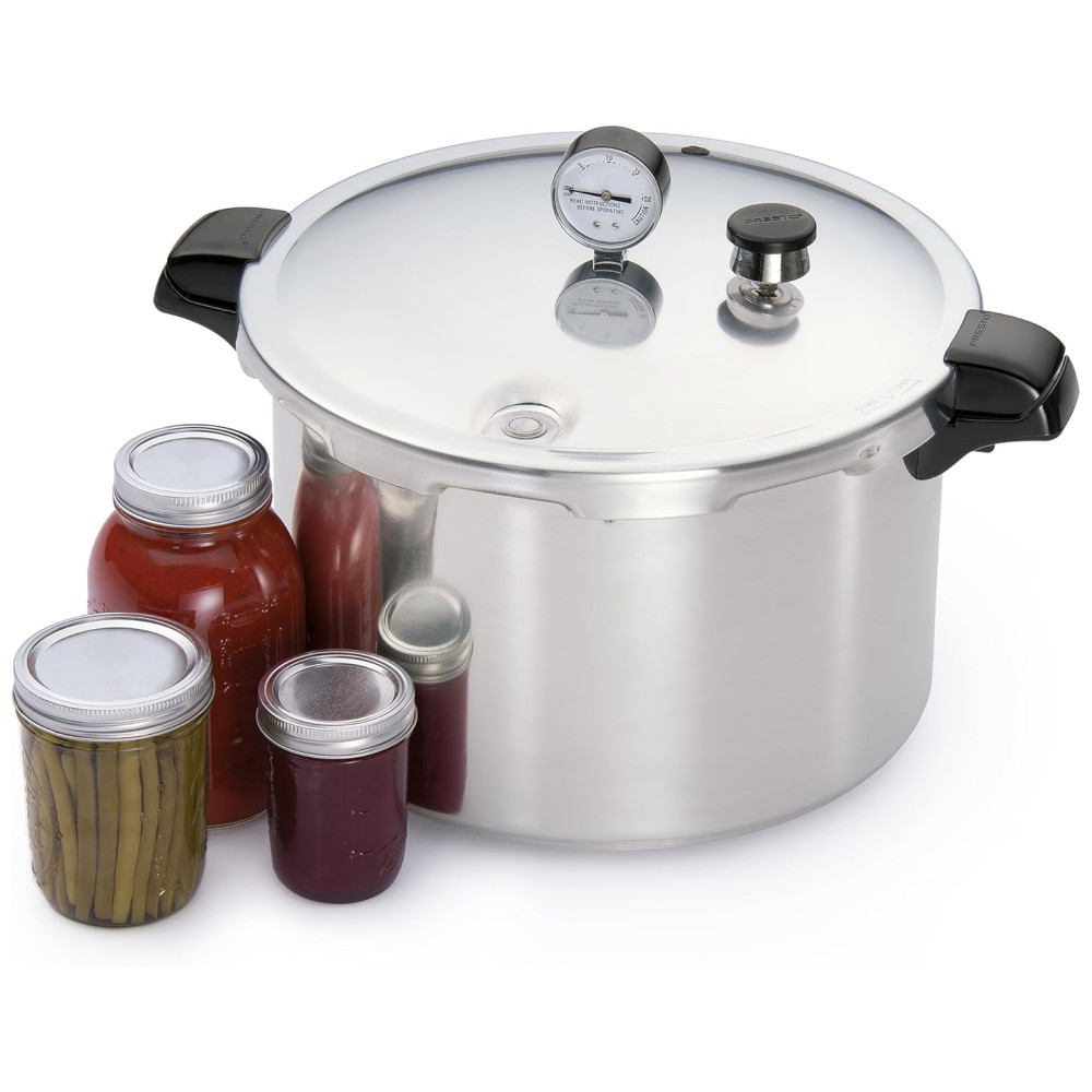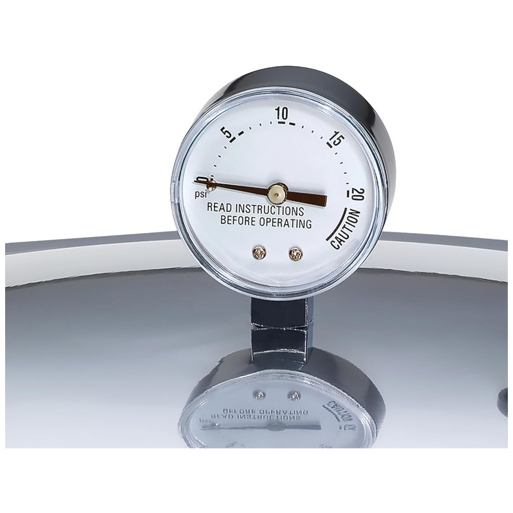 A enlatadora de pressão Presto de 15,1 litros é uma ferramenta de qualidade profissional feita de alumínio resistente e durável, projetada para enlatados de pressão domésticos fáceis e confiáveis. Funciona também como enlatador de água fervente para conservar frutas, geléias, picles e salsa em potes de meio litro e meio litro. Funciona em gamas a gás, elétrica e smoothtop. O manômetro de luxo registra pressões de processamento precisas, o que é especialmente importante em áreas de grande altitude.