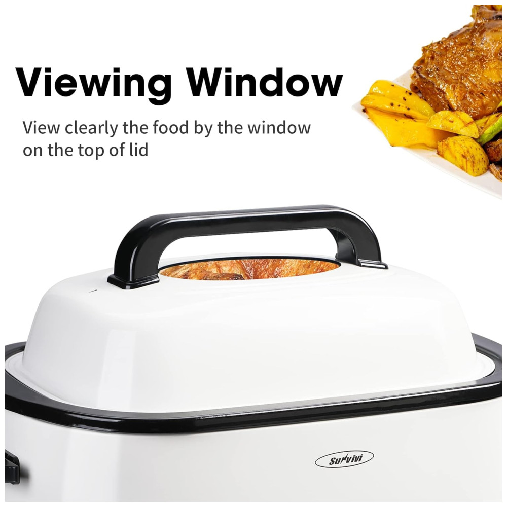 Tampa visível e auto regueada Equipada com tampa de vidro visível para um controle mais conveniente para peru, bifes ou outras carnes, criando perus com boa cor e sabor, cozinha uniformemente sem pontos quentes. A tampa auto alinhada recircula continuamente a umidade, torna a carne macia e suculenta e não gruda na panela.