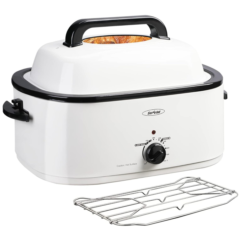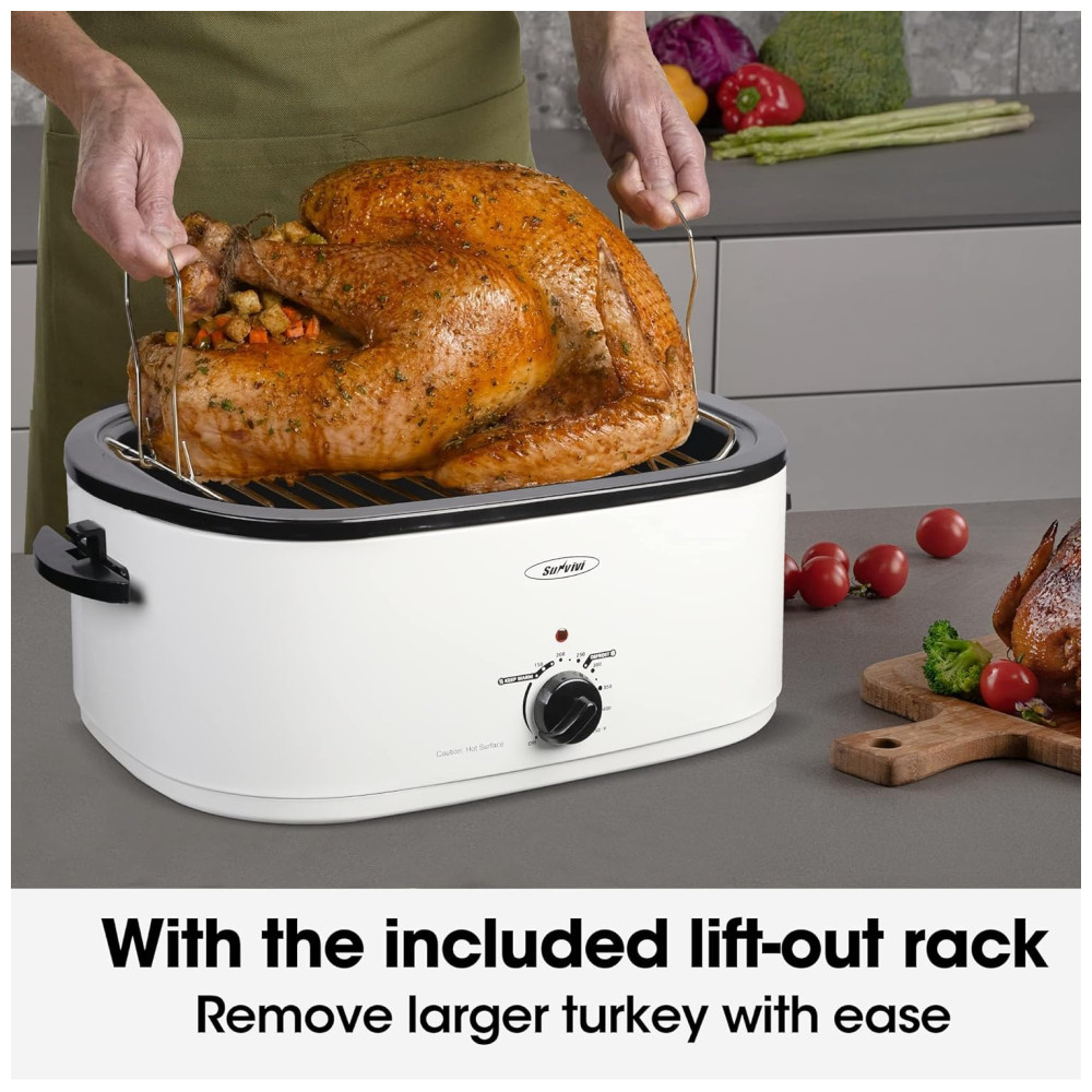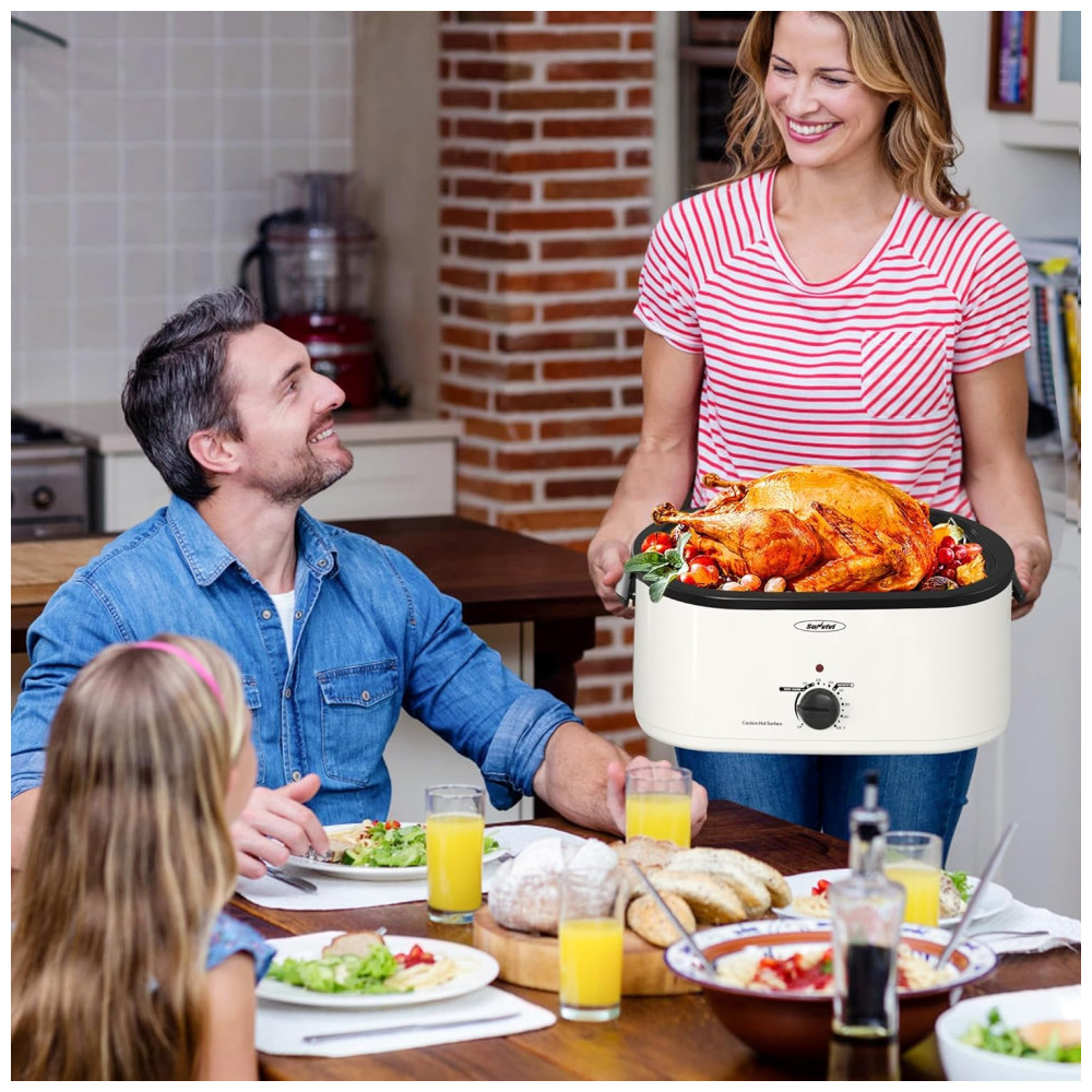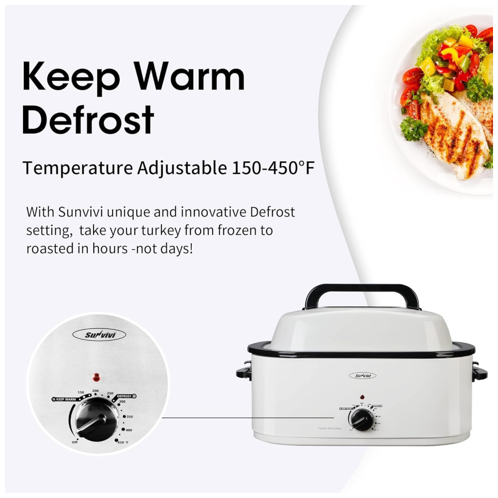 Configuração de aquecimento rápido e descongelamento, aquecimento O torrador elétrico leva menos tempo para cozinhar do que um forno. Torradeira de 1450W com luz vermelha, controle de temperatura, torna sua comida mais saborosa em diferentes temperaturas. O torrador elétrico de peru leva apenas algumas horas para descongelar o peru até que esteja assado. O torrador elétrico com configuração de aquecimento mantém o jantar na temperatura ideal para servir.
