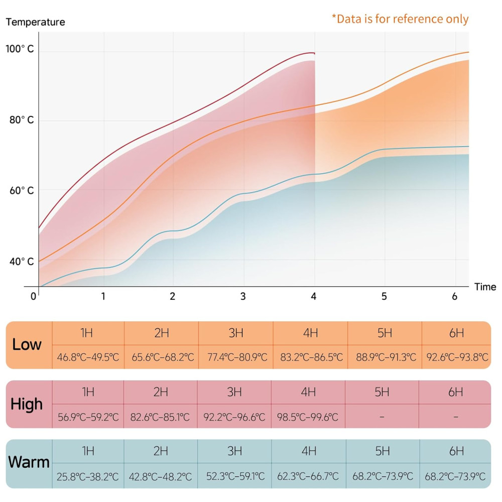 Três configurações de temperatura: Com as opções de Baixo, Alto e Manter Quente, você pode ajustar a temperatura conforme suas preferências culinárias ou o tipo de alimento que está cozinhando. Se tiver uma agenda cheia, basta selecionar a função “Manter Quente” após o cozimento para garantir que sua refeição esteja quente e deliciosa quando você voltar para casa.