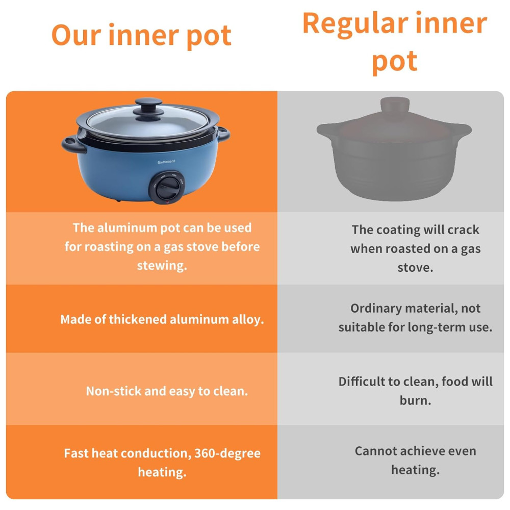 Quais são as vantagens da Panela de Cozimento Lento Eamoment? Certificada pela ETL para garantir sua segurança, a panela é livre de PFAS, Teflon, chumbo, cádmio e outras substâncias prejudiciais. A Eamoment se compromete a fornecer produtos de alta qualidade para seus clientes.