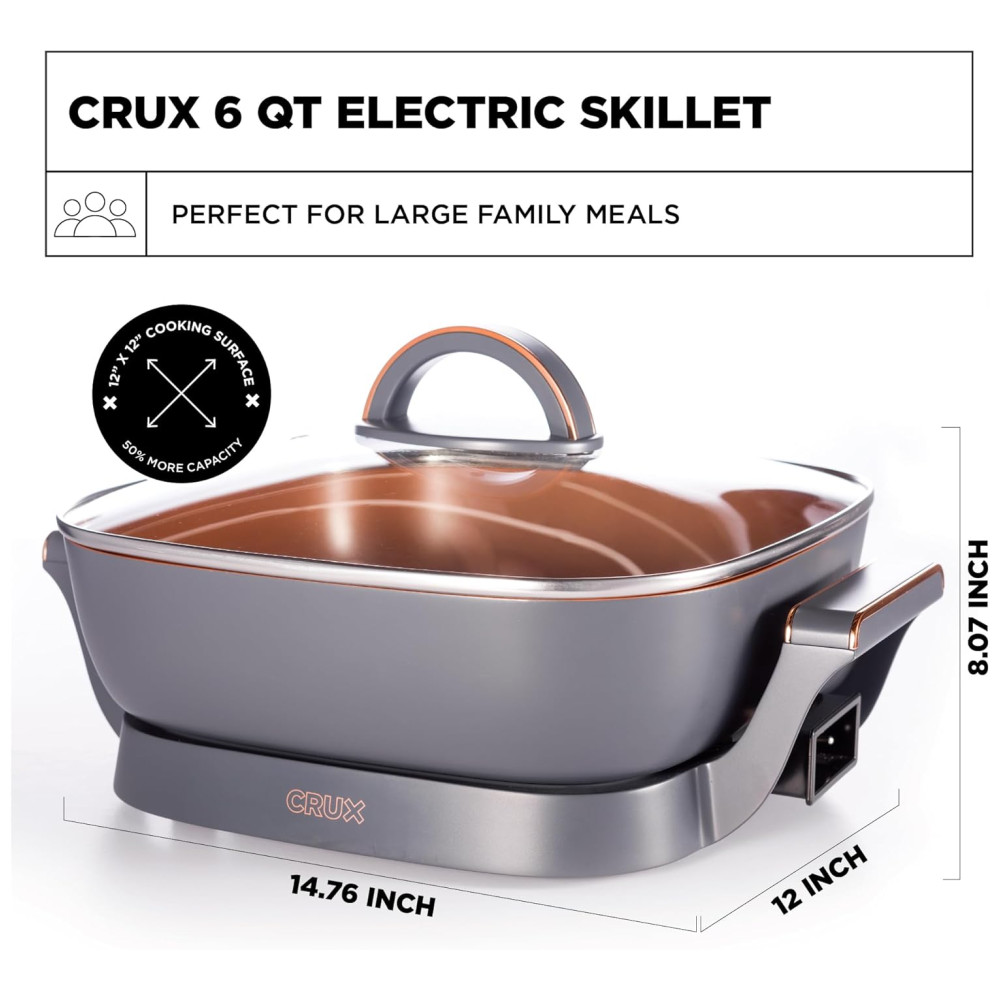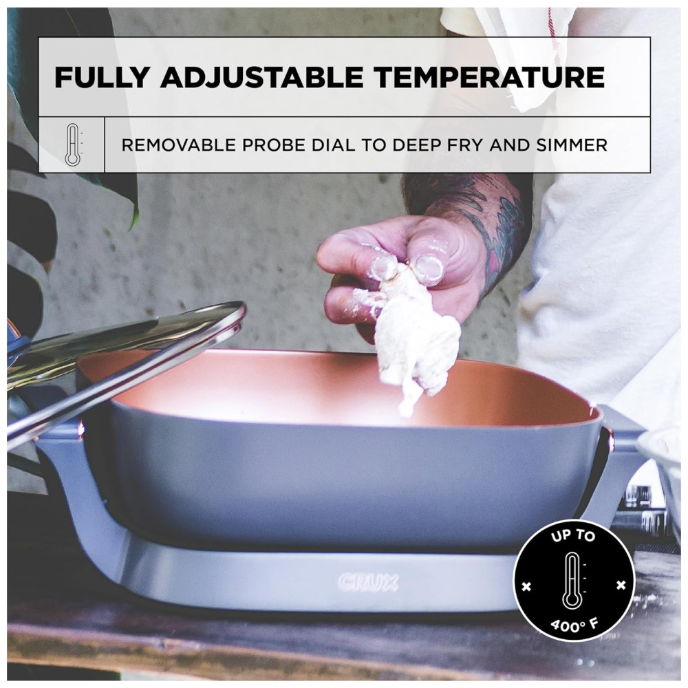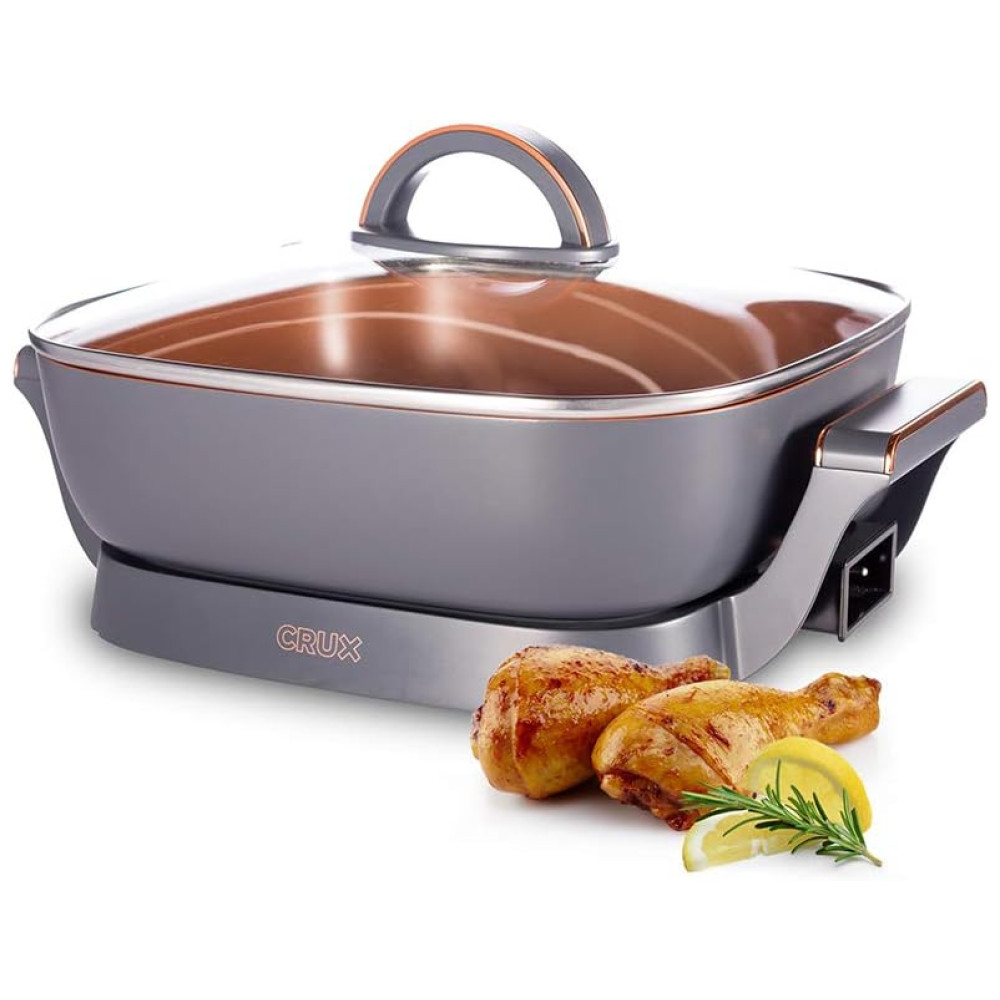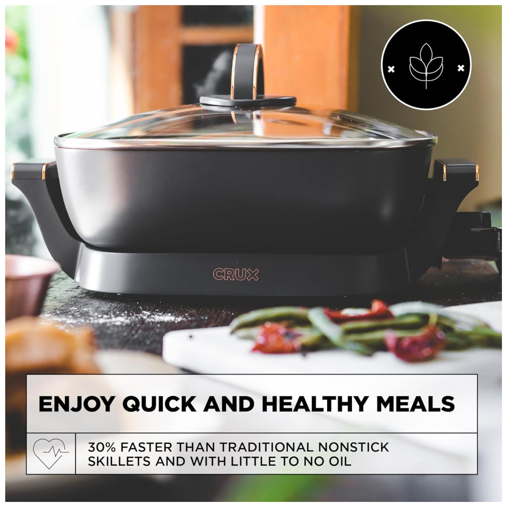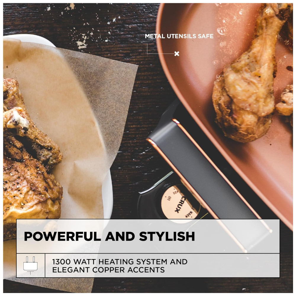 Para Lares Modernos: As frigideiras elétricas CRUX são fabricadas com materiais de alta qualidade e tecnologia de ponta. Com detalhes em cobre deslumbrantes, elas adicionam um toque de elegância à sua cozinha e são o presente perfeito para qualquer ocasião.