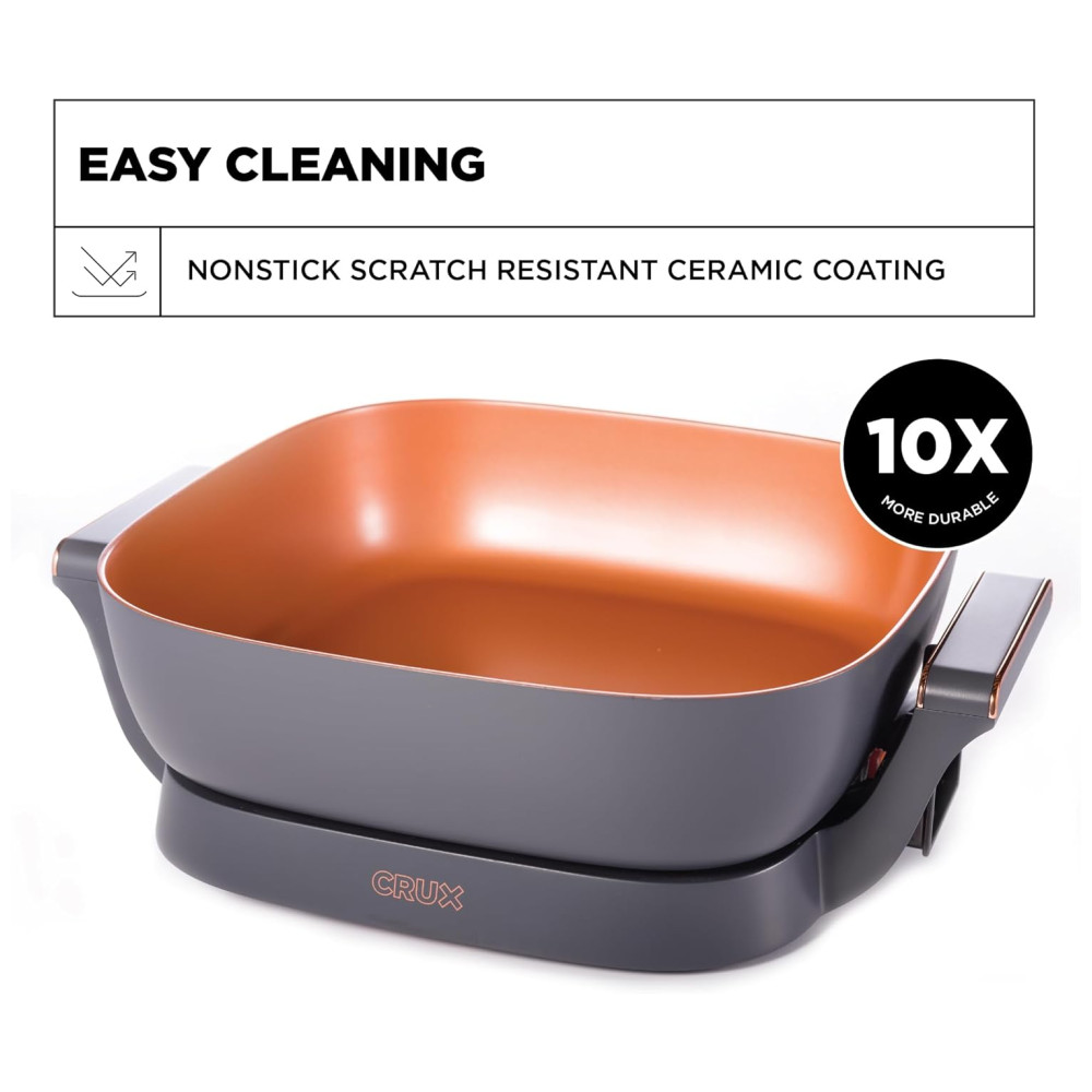 Cozinhe para Todos: Com um revestimento cerâmico de cobre antiaderente, 10 vezes mais durável que outros e seguro para utensílios de metal, a CRUX oferece uma superfície de 30 cm x 30 cm, ideal para grandes refeições e encontros familiares.