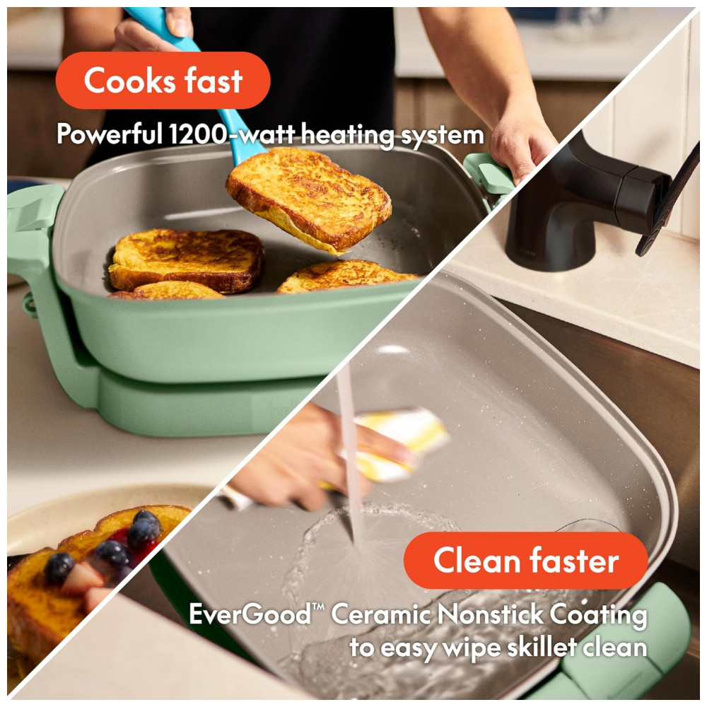 Frigideira elétrica retangular Bella Make & Take com superfície de 30,5 cm e profundidade de 7,6 cm, indicada para preparo de refeições em maior volume com aquecimento homogêneo. A base em alumínio fundido e o revestimento cerâmico EverGood proporcionam distribuição uniforme de calor e superfície antiaderente livre de PFAS, PFOA, PTFE, chumbo e cádmio.