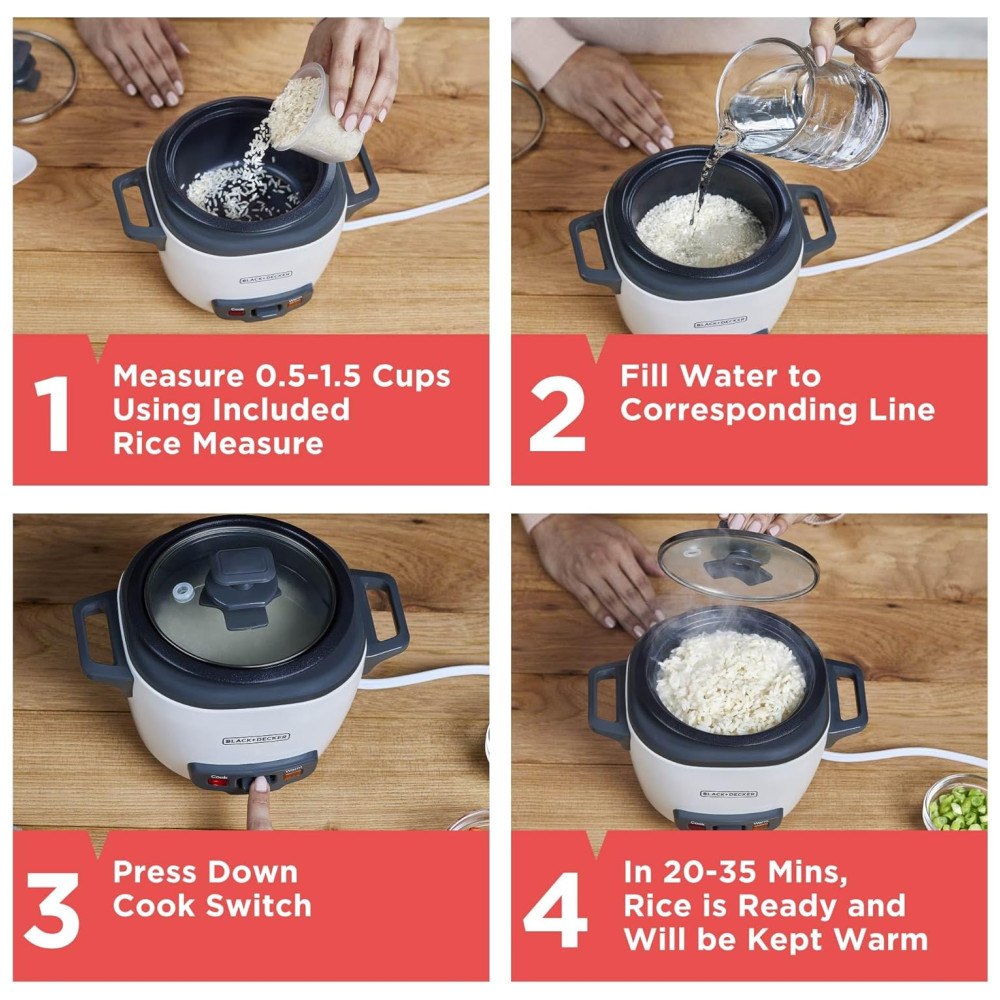 Preparar o jantar ficou mais fácil com a Panela Elétrica de Arroz BLACK+DECKER de 3 Copos. O cozimento leva apenas 20 a 30 minutos, e em seguida, a função automática de manter aquecido entra em ação para manter o arroz delicioso e fofinho pronto para servir mesmo após o cozimento. A limpeza é simples graças à panela de arroz antiaderente e a tampa de vidro temperado, que podem ir na lava-louças. Esta panela de arroz pessoal é perfeita para porções individuais ou jantar para dois, com capacidade de 1 a 3 copos. Além disso, pode ser usada para preparar quinua, risoto, arroz para sushi, sopas, ensopados e até mingau!