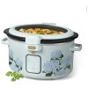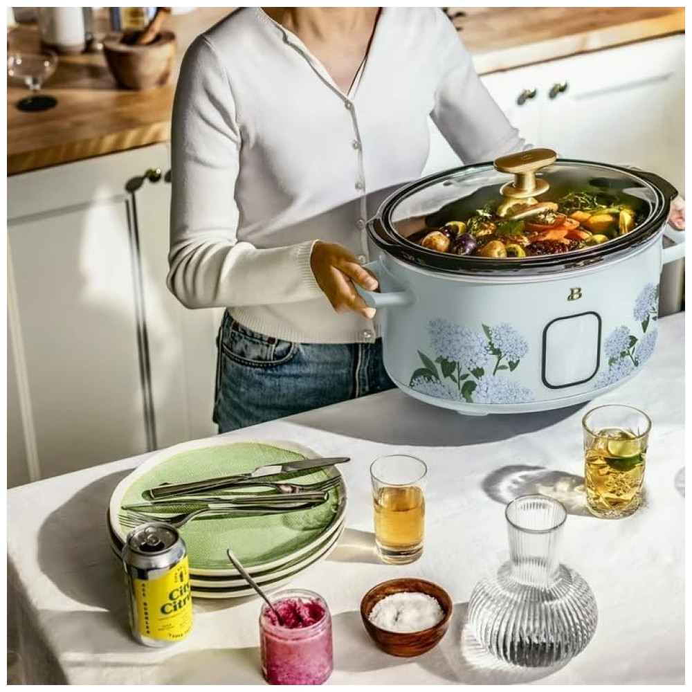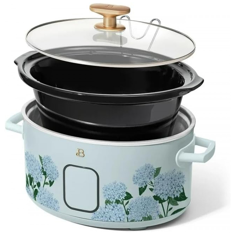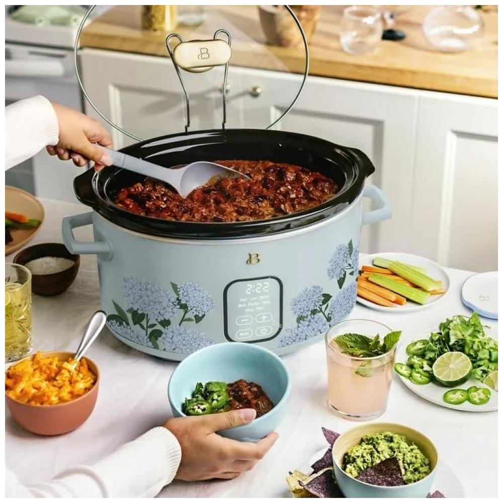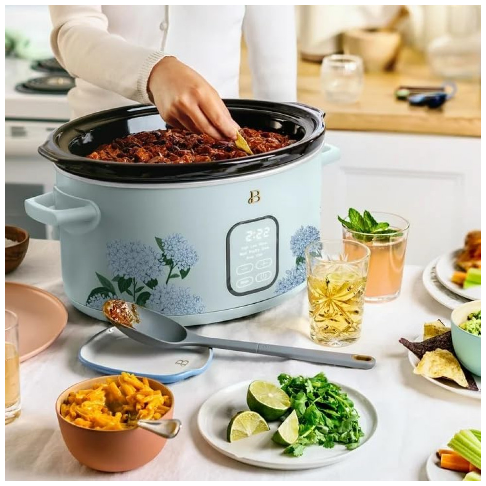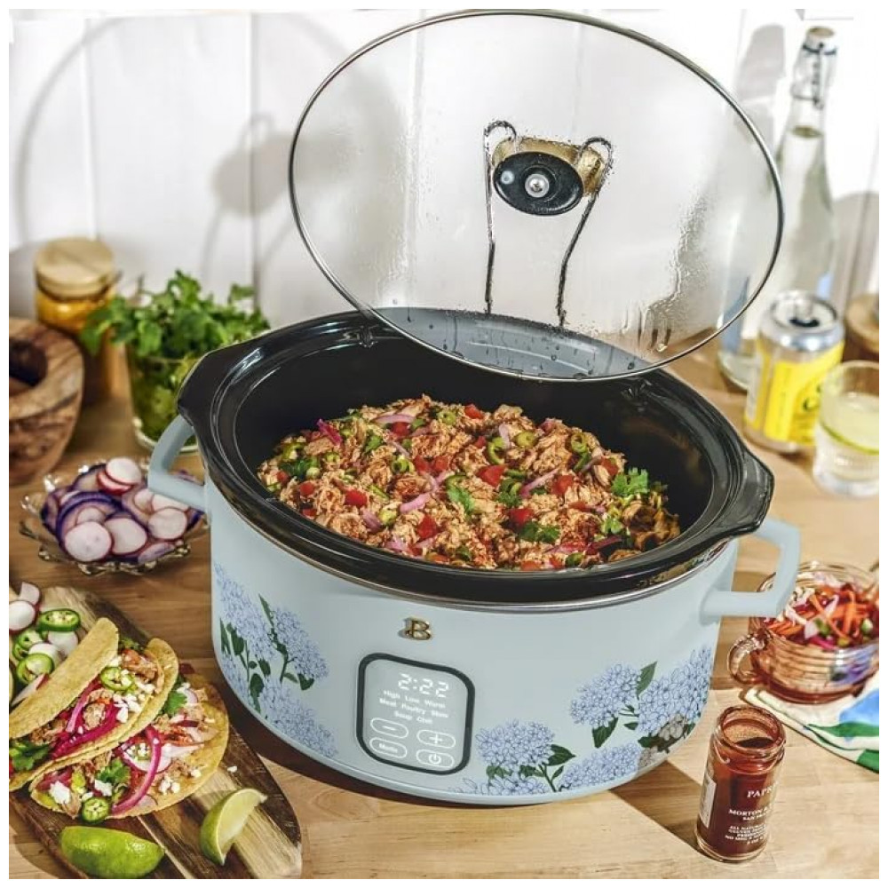 Panela elétrica Slow Cooker digital programável de 5,7 litros da linha Beautiful, com acabamento Hydrangea Floral, projetada para cozimento lento de porções familiares com controle eletrônico de tempo e aquecimento. A cuba interna em cerâmica e a tampa de vidro temperado proporcionam distribuição uniforme de calor, enquanto o painel com comando por toque permite selecionar funções e ajustes de forma prática.