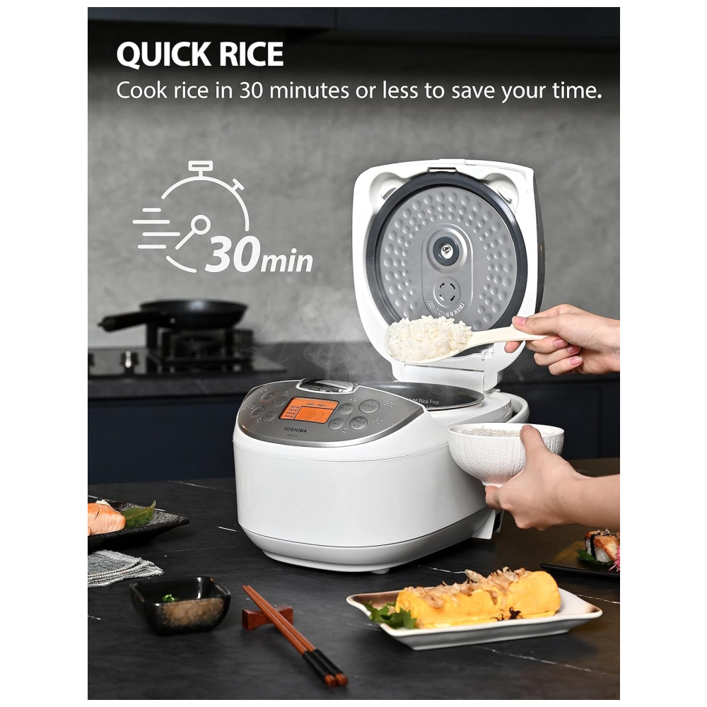 RECURSO DE ARROZ RÁPIDO A panela elétrica de arroz Toshiba possui um recurso de arroz rápido, o sensor especialmente projetado acelera o tempo de cozimento para 30 minutos, que é uma excelente opção para economizar tempo.