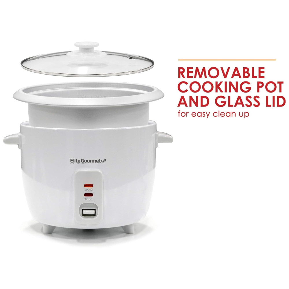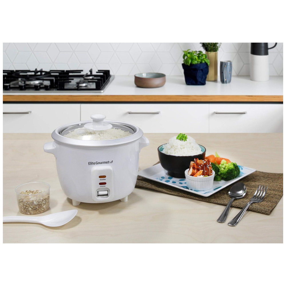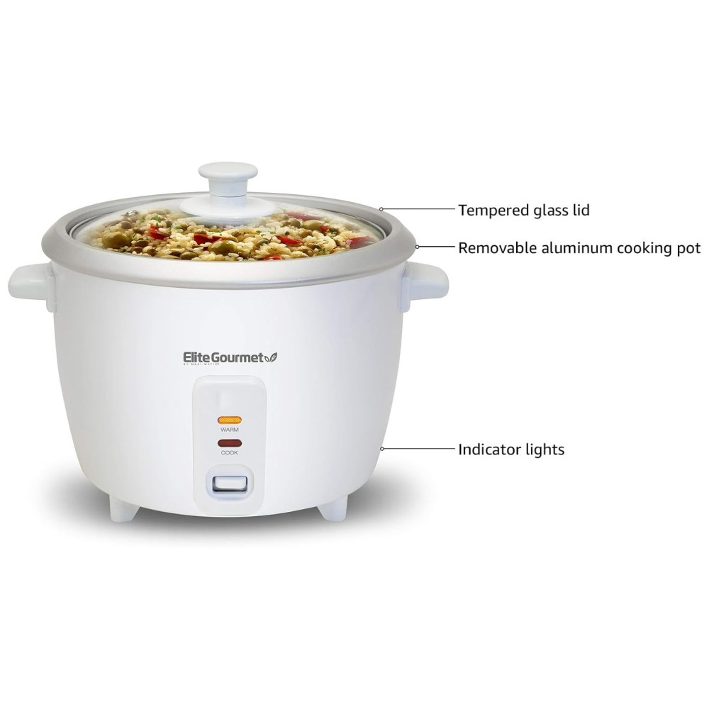 Cozinhe arroz perfeito e fofo hoje com a Panela de Arroz Elite Cozinha Deluxe 6 Cup. Faz até 6 xícaras 1,4 litros de arroz cozido usando 3 xícaras de arroz crua 709 mL. Esperar quando ferver a cozinha ou observar o fogão, esta cozinha irá automaticamente e mudará a comida para o calor quente, manterá quente e completa antes da água. Uma tampa de limpeza fácil de limpar, Inclui um copo de visualização e uma tampa de configuração de vidro temperado para uma visualização conveniente.
