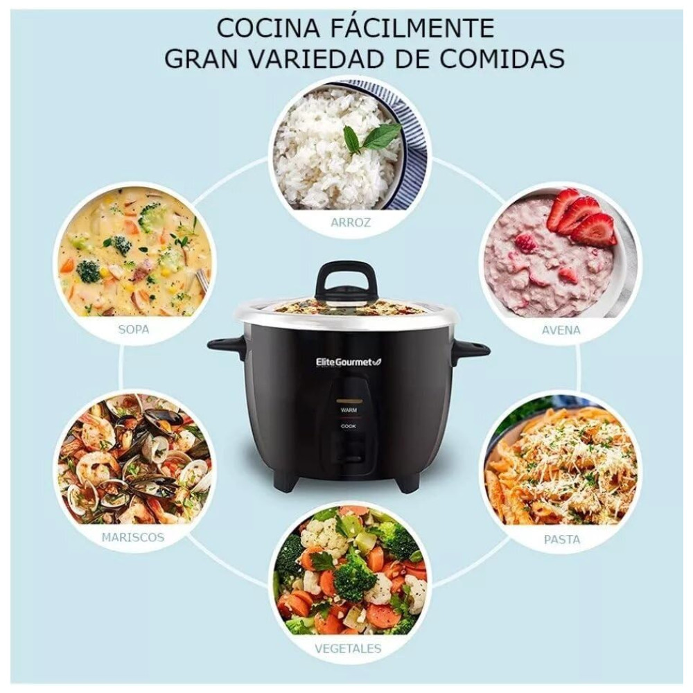 QUER ARROZ COZIDO PERFEITAMENTE BASTA DEFINI LO E ESQUECÊ LO Cansado de arroz mal cozido ou cozido demais A panela de arroz profissional Elite Gourmet cozinhará seu arroz uniformemente e, em seguida, mudará automaticamente para a função mantenha se quente, que garantirá que seu delicioso arroz esteja fresco e quente por horas antes de servir Tire toda a adivinhação de cozinhar seu sushi ou arroz preto e desfrute de suas receitas indianas ou chinesas favoritas sem esforço