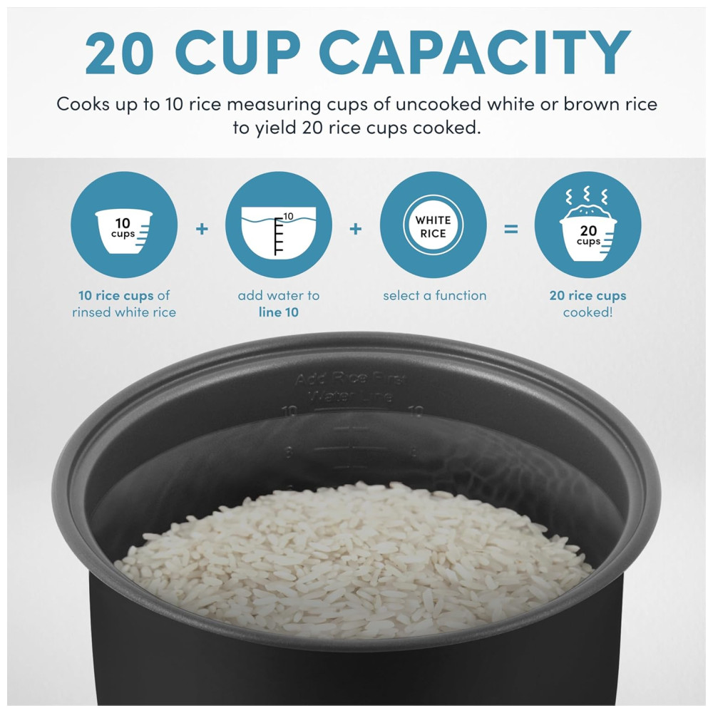 CAPACIDADE E DIMENSÕES até 20 xícaras 4,7 L de arroz cozido 10 xícaras cruas 2,3 L, 4QT 3,7 L, perfeito para uso individual e familiar. x x é fácil de manusear e zenar.