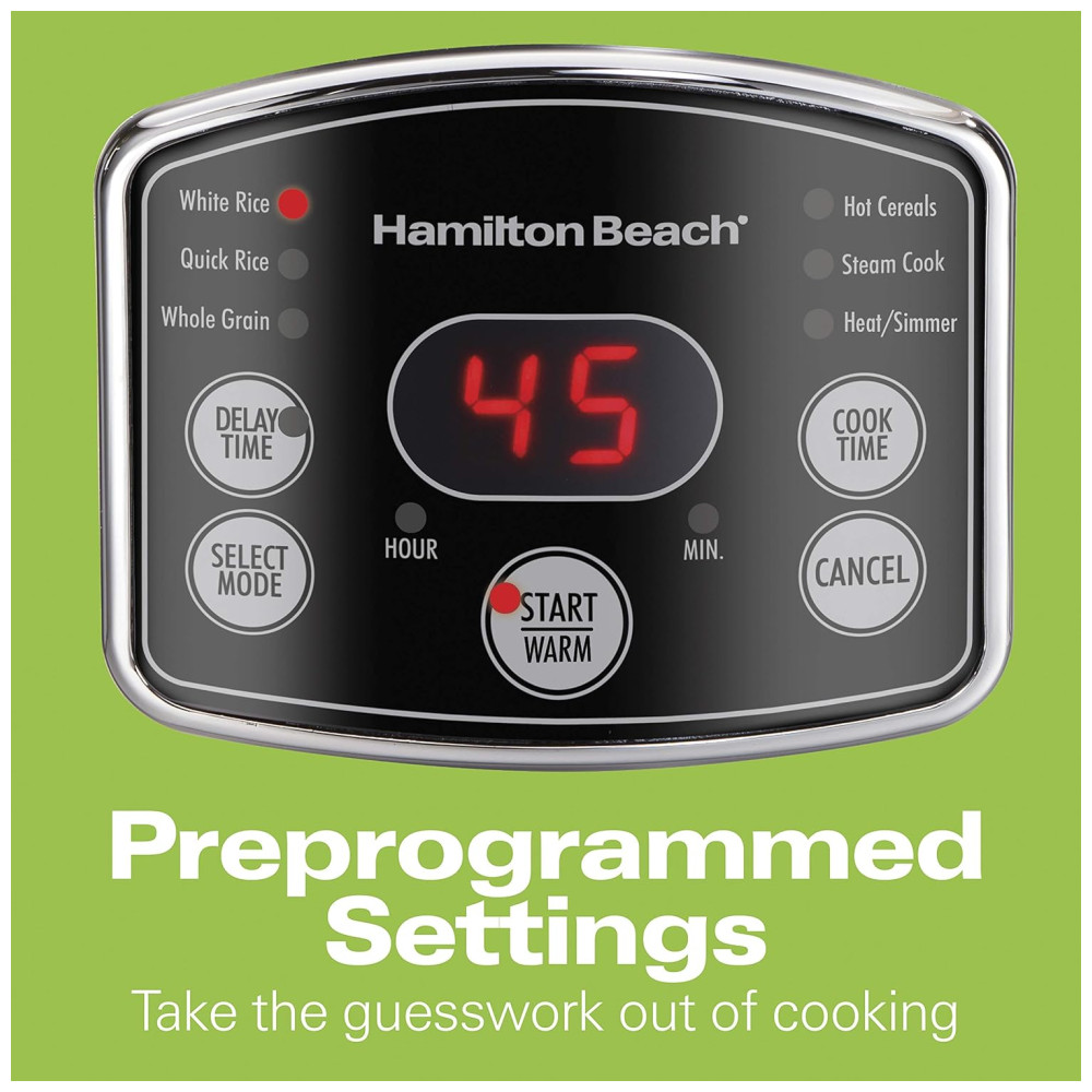 Configurações pré programadas São configurações diferentes nesta panela de arroz, cereal tiram a adivinhação do cozimento quente. Escolha entre arroz branco, arroz rápido, grão integral, calor, ferver, cozinheiro a vapor e grãos quentes.