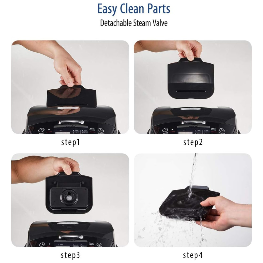 Fácil de limpar A limpeza da carcaça externa de aço inoxidável e da válvula de vapor removível é como uma brisa. A panela interna anti aderente e todos os acessórios de plástico BPA Free que vêm com o fogão podem ser lavados na máquina de lavar louça.