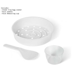 Componentes incluídos: Panela de arroz e grãos, cuba interna, copo medidor de arroz, colher/pá de arroz, bandeja de vapor/ovos