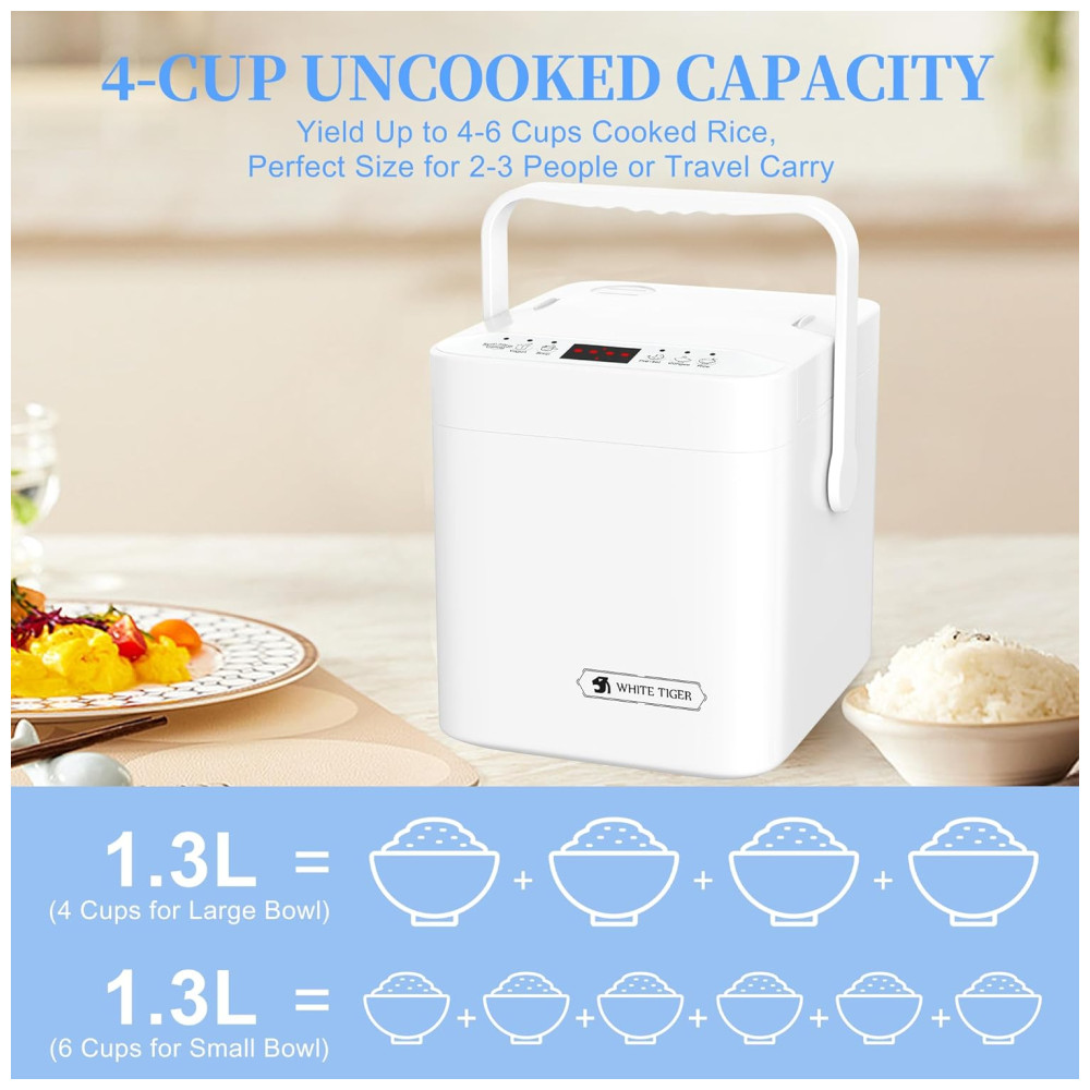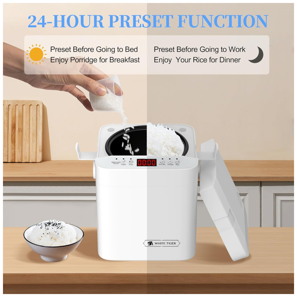 Panela Elétrica de Arroz Mini WHITE TIGER 13 Litros Cozinha 4 Copos de Arroz Timer 24h Compacta e Portátil Ideal para Pequenas Cozinhas