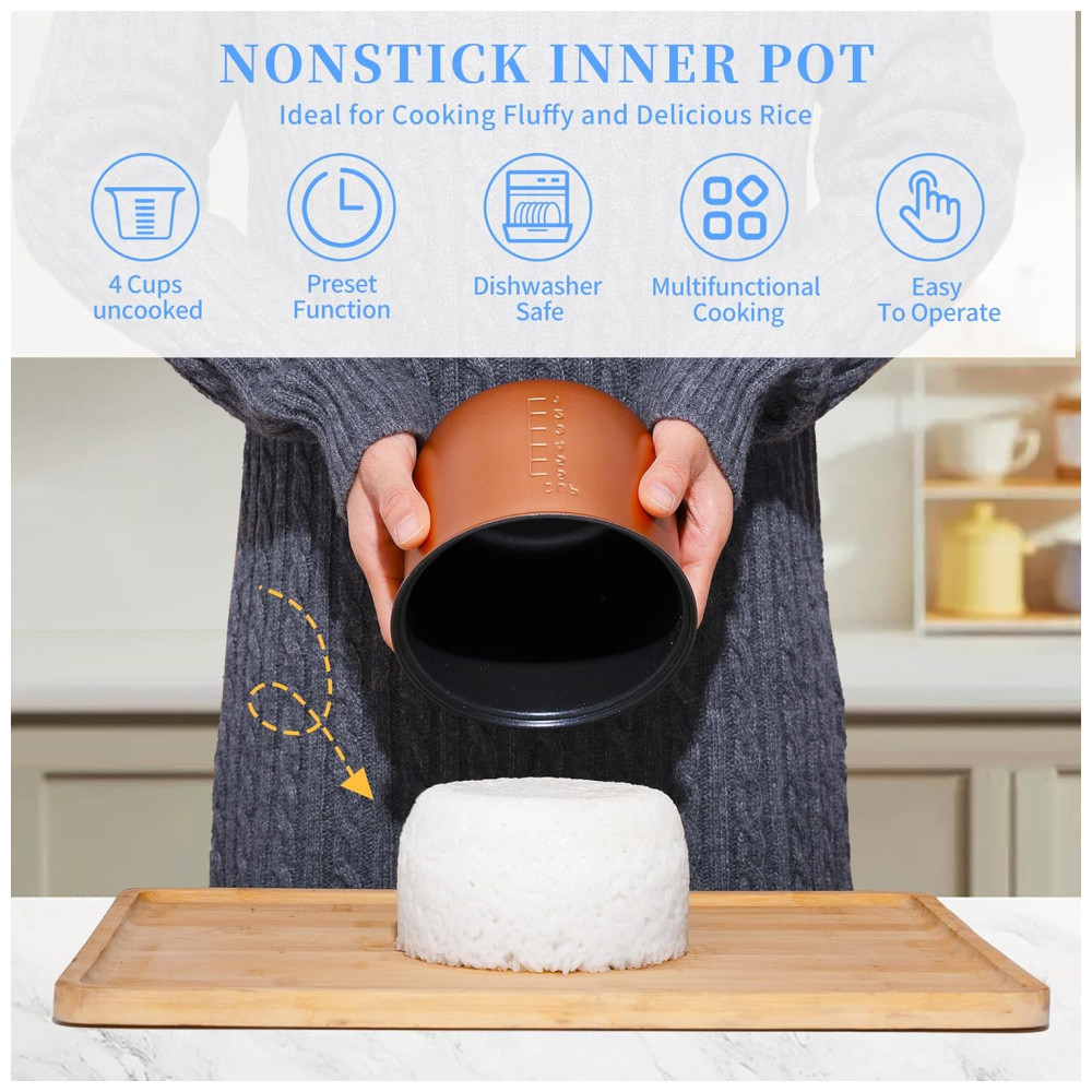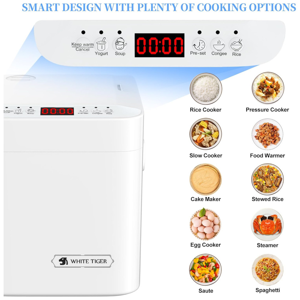 A Panela de Arroz Mini WHITE TIGER é uma solução inteligente para suas refeições. Com timer de 24 horas e função de manter aquecido, você pode programar o preparo do café da manhã e do jantar com antecedência, economizando tempo. Seu tamanho compacto permite cozinhar até 4 copos de arroz cru, rendendo até 46 copos de arroz, ideal para até 13 pessoas. Perfeita para dormitórios, escritórios, acampamentos e viagens. O painel de controle no topo torna a operação mais amigável, com indicadores LED para fácil acompanhamento. A panela interna antiaderente removível é segura para lava-louças e fácil de limpar, garantindo refeições saudáveis. Além disso, com essa panela multifuncional, você pode preparar arroz, sopas, mingau, bolos, iogurtes, massas e sobremesas com facilidade.