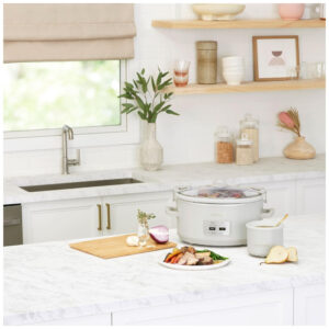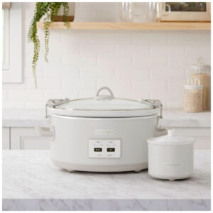 A Panela Elétrica de Cozimento Lento CrockPot faz com que a hora das refeições seja mais fácil para pessoas ocupadas que desejam refeições caseiras nutritivas. Inclui um aquecedor perfeito para molhos e patês. Com uma impressionante capacidade de 6,62 litros, projetada para atender às necessidades culinárias de 9 ou mais pessoas, é ideal para reuniões familiares, festas e entreter os convidados. Possui controle por toque com 4 configurações pré-programadas que oferecem flexibilidade para uma variedade de pratos. A função de aquecimento automático mantém a comida na temperatura ideal até que esteja pronta para servir, permitindo que você mantenha o sabor e a textura perfeitos sem pressa. Equipada com uma tampa travável à prova de vazamentos e alças resistentes que facilitam o transporte.