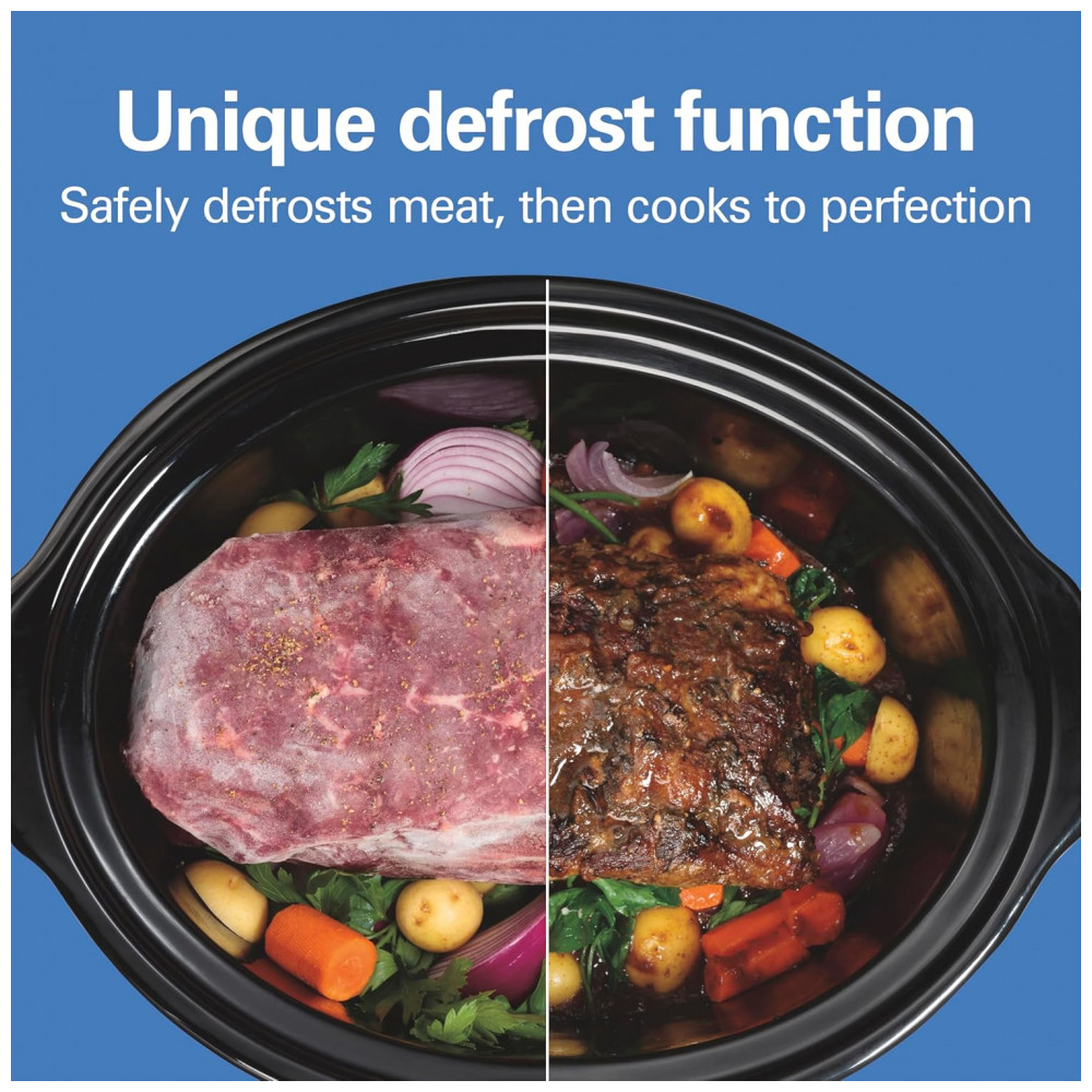 A inovadora capacidade de descongelamento e cozimento da Panela de Cozimento Lento Hamilton Beach Set Forget permite cozinhar carne congelada com segurança, sem deixá-la passar do ponto. Inclui sonda de temperatura, tampa com trava e opções de programação flexíveis. ÓTIMO PARA DESCONGELAR CARNE CONGELADA E COZINHAR PERFEITAMENTE. Esta panela de cozimento lento sabe como descongelar e cozinhar alimentos com segurança, sem passar do ponto. Basta pressionar descongelar, selecionar alta ou baixa e sua panela de cozimento lento fará o resto. GARANTA RESULTADOS PERFEITOS COM A SONDA DE TEMPERATURA. Cozinhe a carne até atingir a temperatura precisa sem passar do ponto. Configure esta panela de cozimento lento programável para a temperatura desejada, insira a sonda e ela mudará automaticamente para manter aquecido quando a comida estiver pronta. TAMPA COM TRAVA PARA VIAGENS SEM BAGUNÇA. Leve esta panela de cozimento lento portátil para festas ou viagens sem se preocupar com derramamentos. A tampa com trava se encaixa perfeitamente para melhorar a portabilidade e ajudar a evitar derramamentos. SERVE 7 PESSOAS COM CAPACIDADE DE 6 QUARTOS. O tamanho desta panela de cozimento lento de 6 quartos é perfeito para preparar pratos de uma panela só, refeições familiares ou aperitivos para agradar a multidão, e cabe um frango de 6 libras ou um assado de 4 libras. OPÇÕES FLEXÍVEIS DE TEMPO E TEMPERATURA. Escolha alta, baixa ou manter aquecido e defina o temporizador de cozimento entre 30 minutos e 24 horas – o temporizador exibirá o tempo restante. Para cozinhar sem definir um tempo, use o modo manual e ajuste a temperatura desejada.