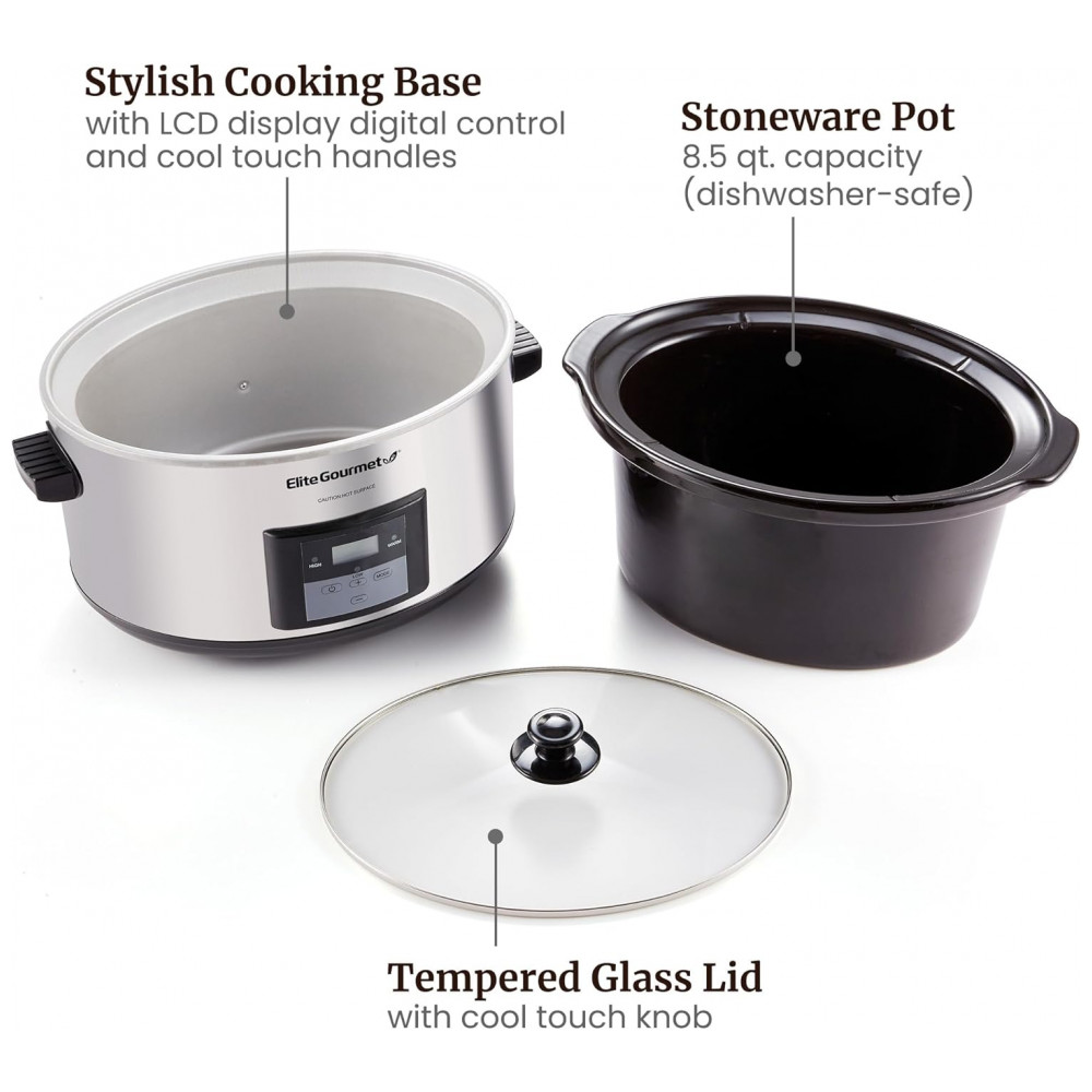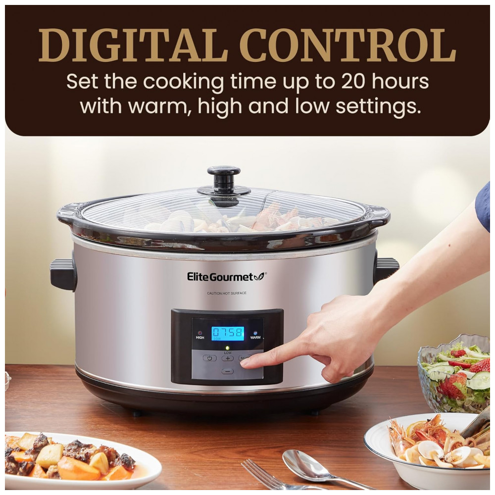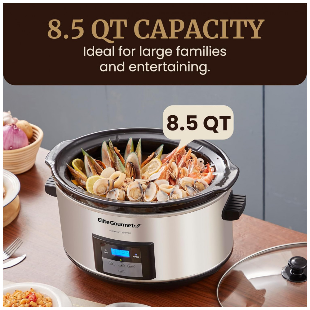 Apresentando a Panela de Cozimento Lento Digital Programável Elite Gourmet MST-900D, com 8 litros de capacidade, perfeita para alimentar toda a família com praticidade e sabor.