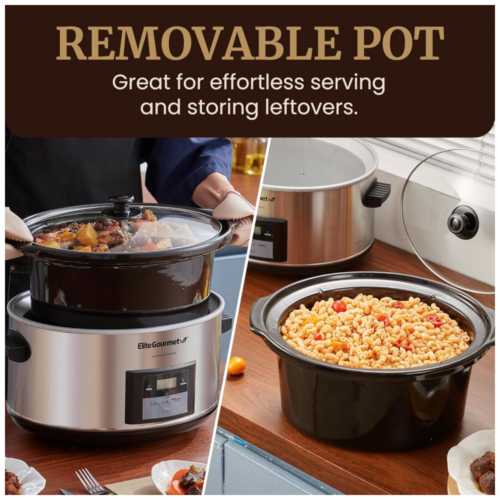 Com a Panela de Cozimento Lento Elite Gourmet, você pode preparar refeições deliciosas, com toda a conveniência de um aparelho programável e fácil de limpar!