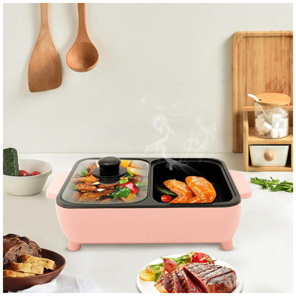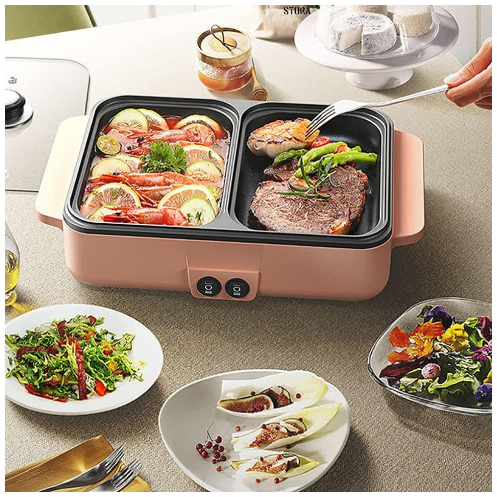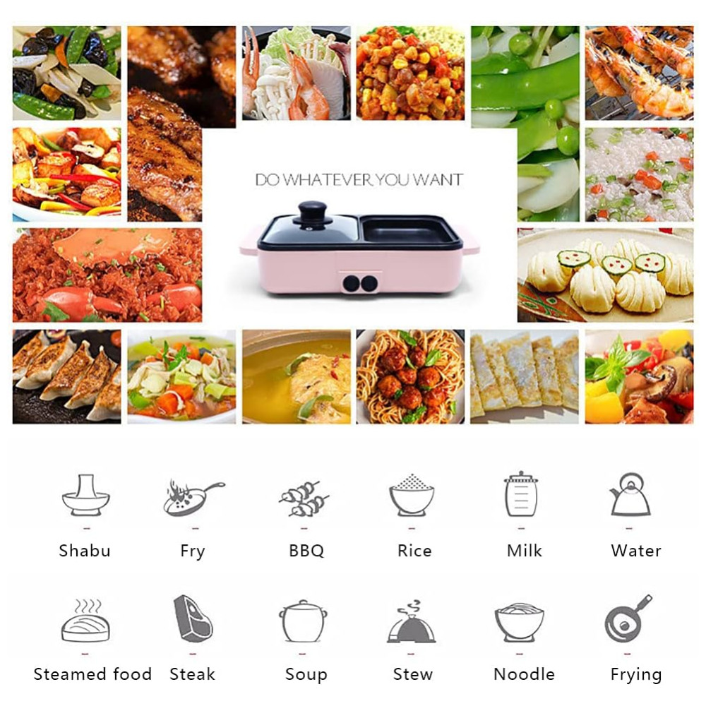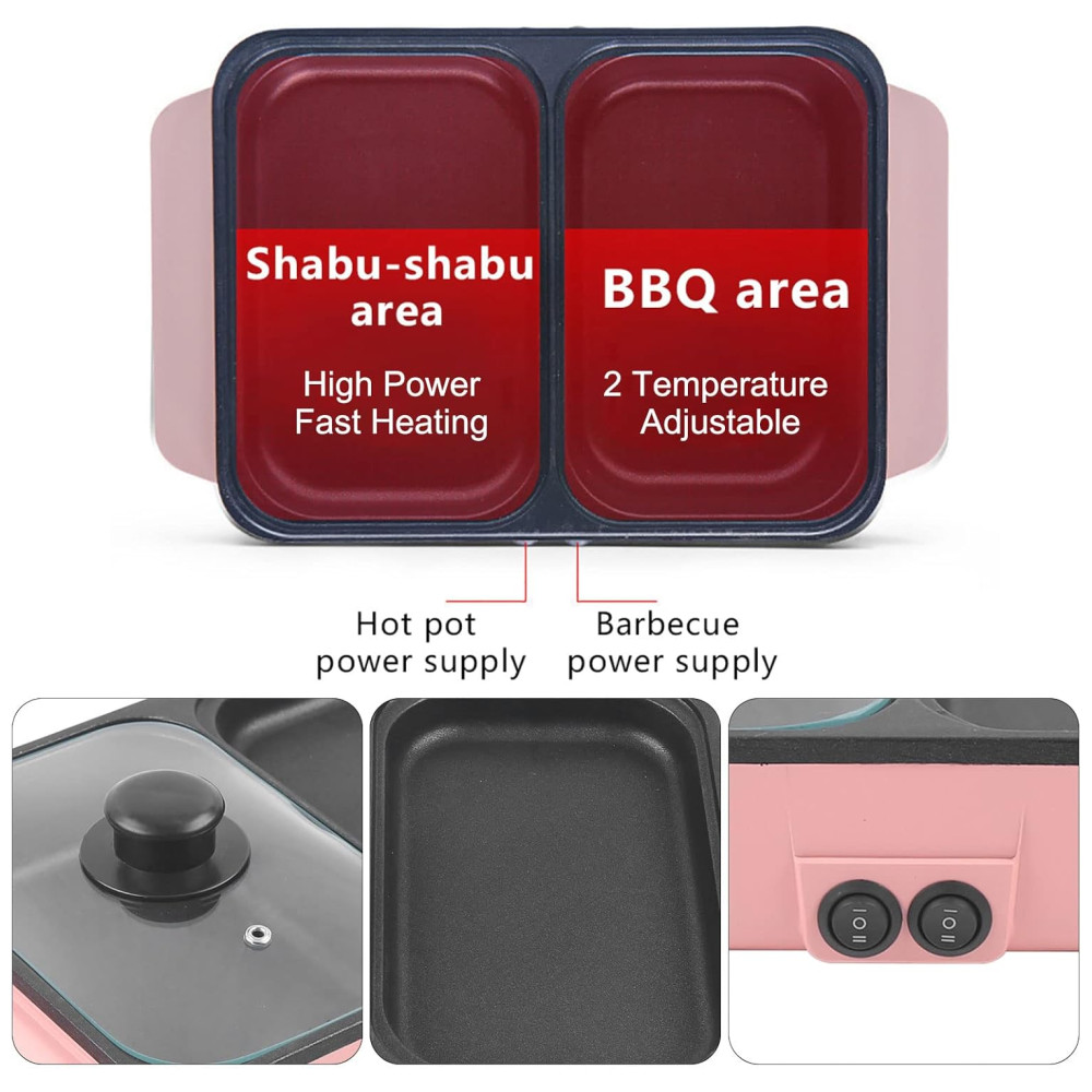 Panela quente para churrasco multifuncional 2 em 1, pode atender às suas necessidades de panela quente e churrasco ao mesmo tempo, controle de temperatura independente, aquecimento rápido, você pode usar esta panela elétrica para cozinhar legumes ou carne, você também pode usar a churrasqueira interna para grelhar, fritar bife, asas de frango grelhadas ou ovos fritos. Aproveite o momento que a comida traz para você e compartilhe os bons momentos com seus amigos e familiares.