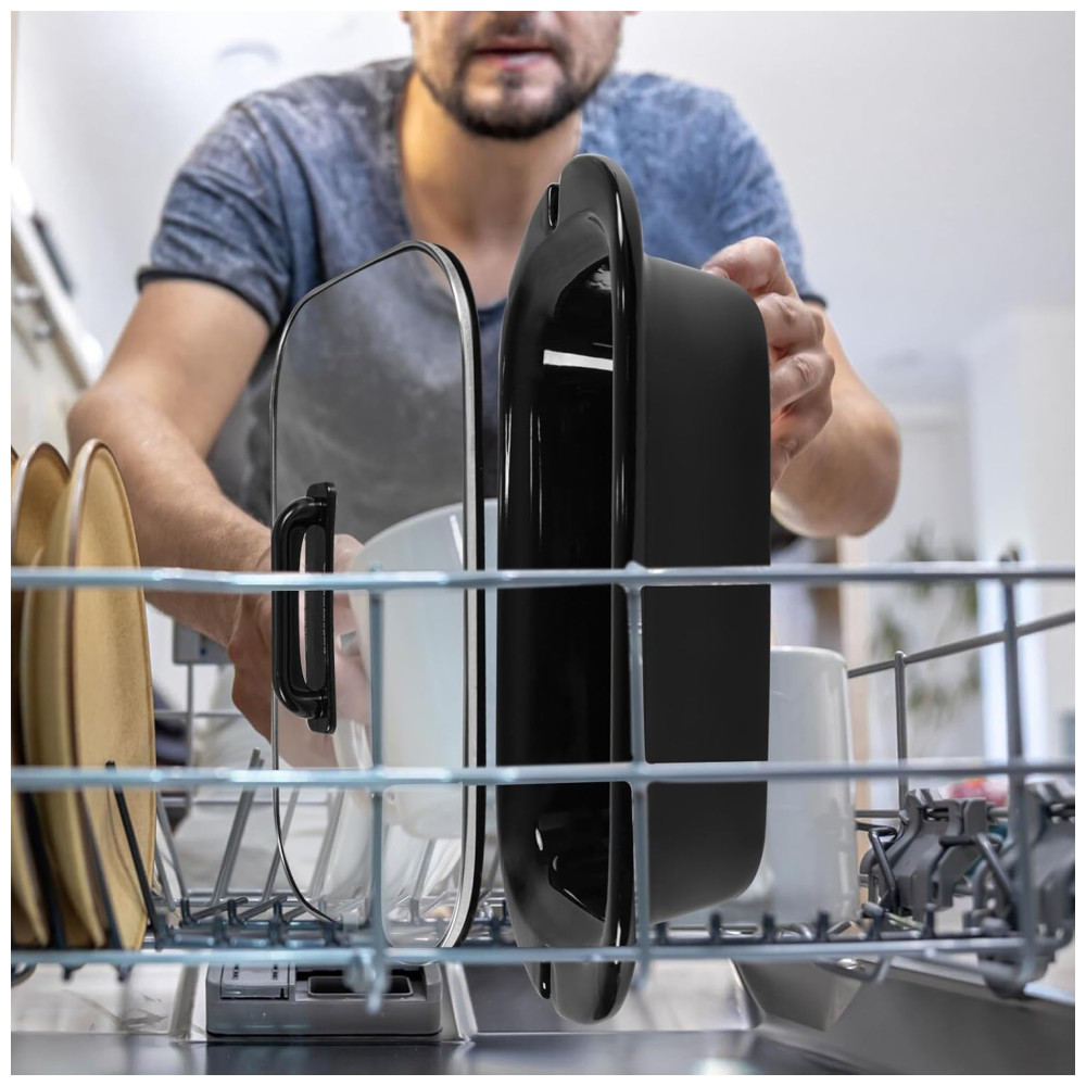 A tampa de vidro temperado Fullview com alças de toque gelado permite que você monitore os alimentos enquanto cozinha. A tampa de vidro de inserção de panela é segura para lavar louça e o esmalte fácil de limpar e durável resiste ao embotamento, manchas, lascas e rachaduras.