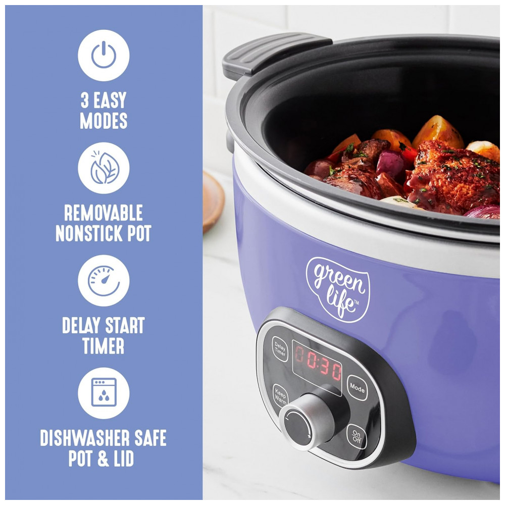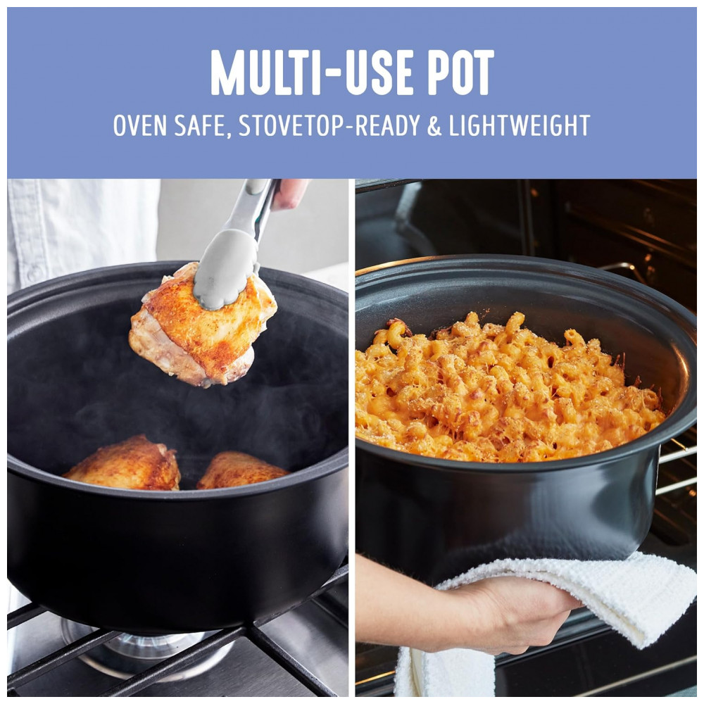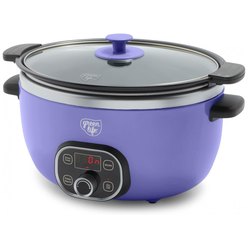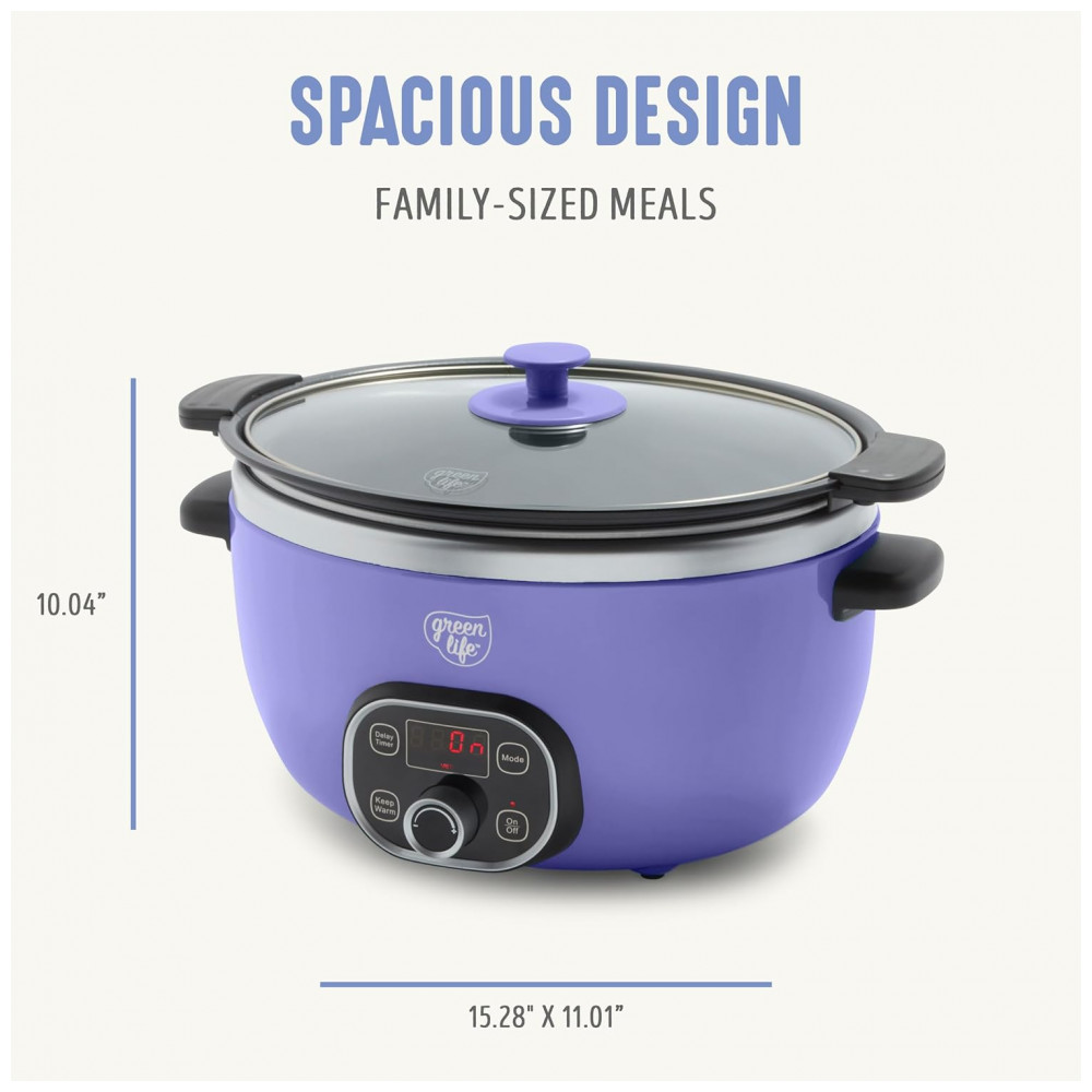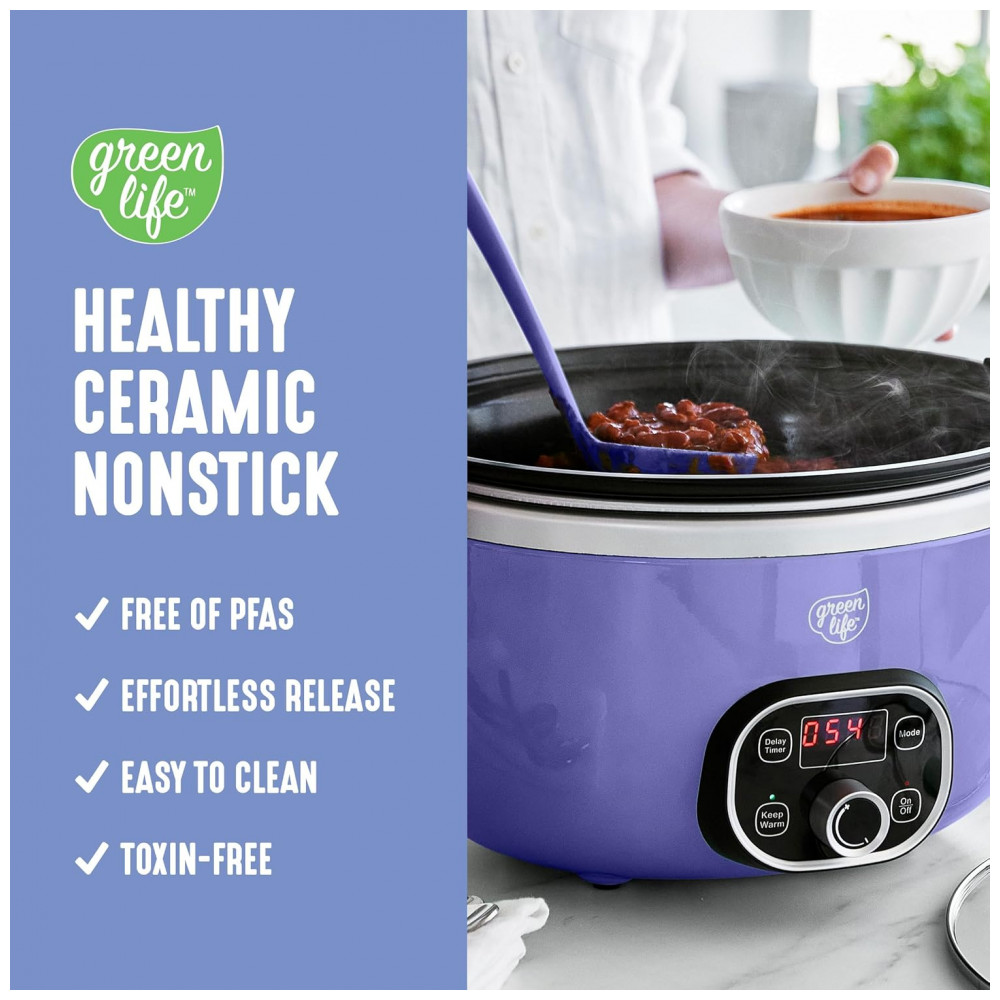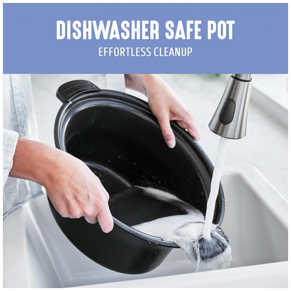 Esta panela elétrica multiuso possui uma panela antiaderente fácil de usar, que pode ser removida rapidamente para dourar e refogar, e depois retornada à base para cozinhar em fogo baixo e lento. É a maneira perfeita de infundir qualquer refeição com sabor irresistível. A panela extra profunda de 5,68 litros apresenta nosso revestimento de cerâmica antiaderente saudável para uma limpeza sem esforço e um desempenho fantástico. Além disso, é livre de PFAS, PFOA, chumbo e cádmio, para que tudo o que você preparar seja um pouco mais saudável. O painel de controle fácil de usar possui cinco funções de cozimento para aprimorar sua refeição, seja para atrasar o início por algumas horas ou programar a Panela Saudável por até 10 horas. Uma vez que sua refeição estiver pronta, esta panela elétrica muda para o modo de aquecimento para manter sua comida pronta por até 4 horas. A tampa e a panela podem ser lavadas na lava-louças para facilitar a limpeza. CAPACIDADE EXTRA-LARGA DE 5,68 LITROS A espaçosa panela de 5,68 litros comporta um frango de 2,7 kg, um assado de 1,8 kg ou o suficiente para servir 7 pessoas – ideal para jantares em família, preparação de refeições ou alimentar uma multidão. INTERIOR ANTIADERENTE DE CERÂMICA LIVRE DE TOXINAS Nosso revestimento é livre de PFAS, PFOA, chumbo e cádmio para que você possa tornar cada refeição mais saudável. Seu revestimento antiaderente de cerâmica saudável e fácil de limpar é derivado de areia e proporciona liberação sem esforço com limpeza rápida. PAINEL DE CONTROLE FÁCIL DE USAR Escolha entre 3 modos Baixo-Médio-Alto, use o Temporizador de Atraso e conte com o Manter Aquecido para servir quando estiver pronto. PERFEITO PARA PREPARAÇÃO DE REFEIÇÕES Cozinhe de 30 minutos a 20 horas, programe com até 10 horas de antecedência e mantenha aquecido por 4 horas – ideal para refeições adiantadas, manhãs agitadas ou preparar grandes lotes. PANELA PRONTA PARA O FOGÃO A panela é leve e removível para uso na boca do fogão e no forno, para que você possa começar com um dourar, terminar lentamente e obter mais sabor. TAMPA DE VIDRO TRANSPARENTE Uma tampa de vidro transparente permite que você acompanhe sua refeição. COMPONENTES LAVÁVEIS NA LAVA-LOUÇAS Panela interna removível e tampa para manutenção sem complicações e limpeza fácil.