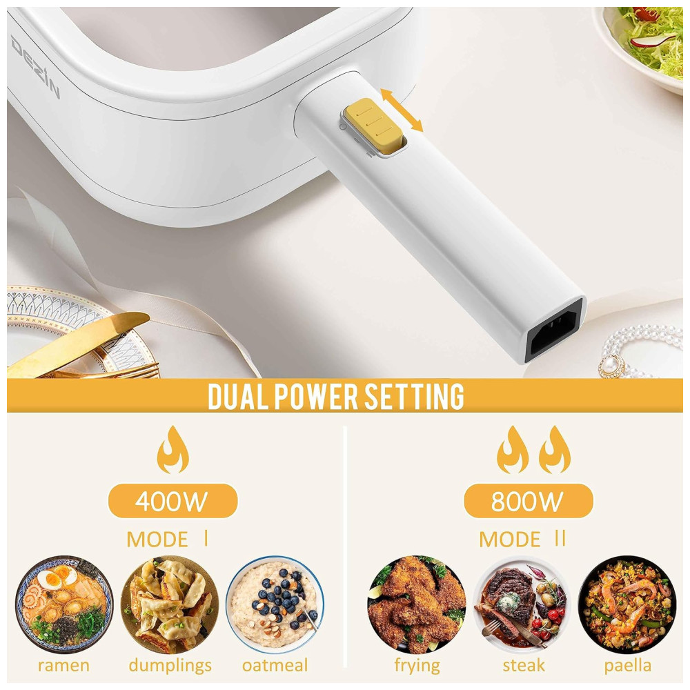 Ajuste Duplo de Potência – A panela elétrica Dezin conta com duas opções de potência (400W e 800W) para atender diferentes necessidades culinárias, aquecendo os alimentos de forma rápida e uniforme. No modo “I”, você pode usá-la para preparar ramen, bolinhos, aveia, legumes ou massas. No modo “II”, ela é ideal para fritar, cozinhar bifes, paella, fondue e muito mais.