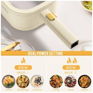 Ajuste Duplo de Potência – A panela elétrica com vaporizador Dezin oferece duas opções de potência (400W e 800W) para atender a diferentes necessidades culinárias, aquecendo os alimentos de maneira rápida e uniforme. No modo “I”, você pode cozinhar ramen, bolinhos, aveia, legumes ou massas; já no modo “II”, ela é perfeita para fritar, preparar bifes, paella, fondue e muito mais.