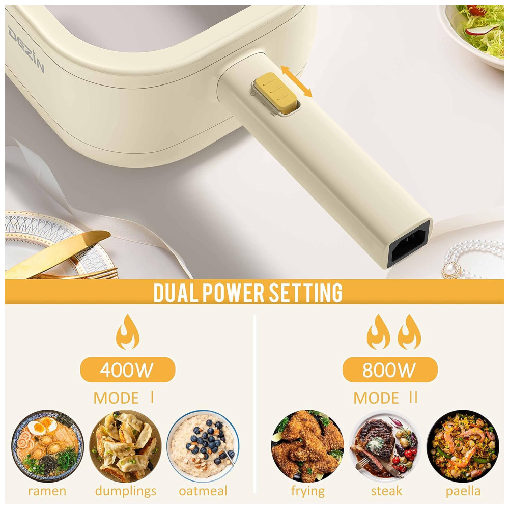 Ajuste Duplo de Potência – Esta panela elétrica com vaporizador oferece duas opções de potência (400W e 800W), atendendo às diversas necessidades culinárias e aquecendo os alimentos de forma rápida e uniforme. No modo “I”, você pode cozinhar ramen, bolinhos, aveia, legumes ou massas. No modo “II”, a panela é perfeita para fritar, preparar bifes, paella, fondue e muito mais.