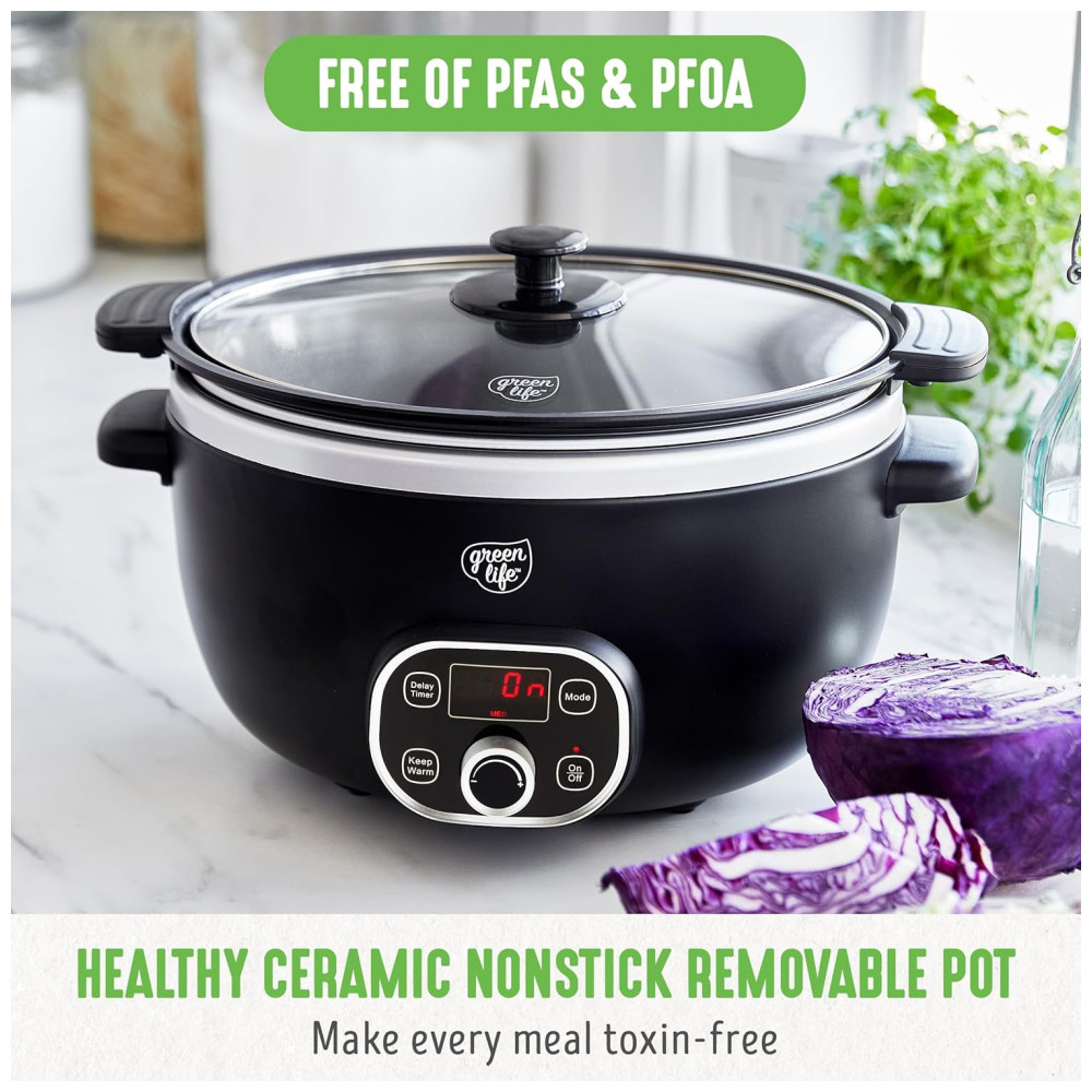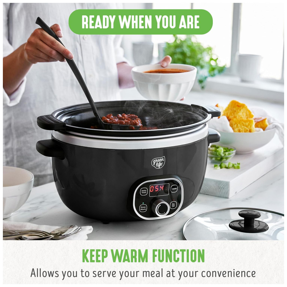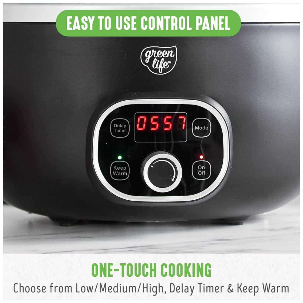 Panela Slow Cooker GreenLife 6QT Preta Cerâmica Antiaderente PFAS-Free Programável Bowl Removível Timer Lava-louças 110V