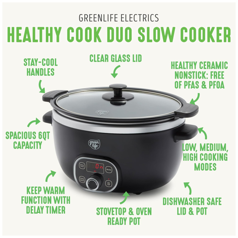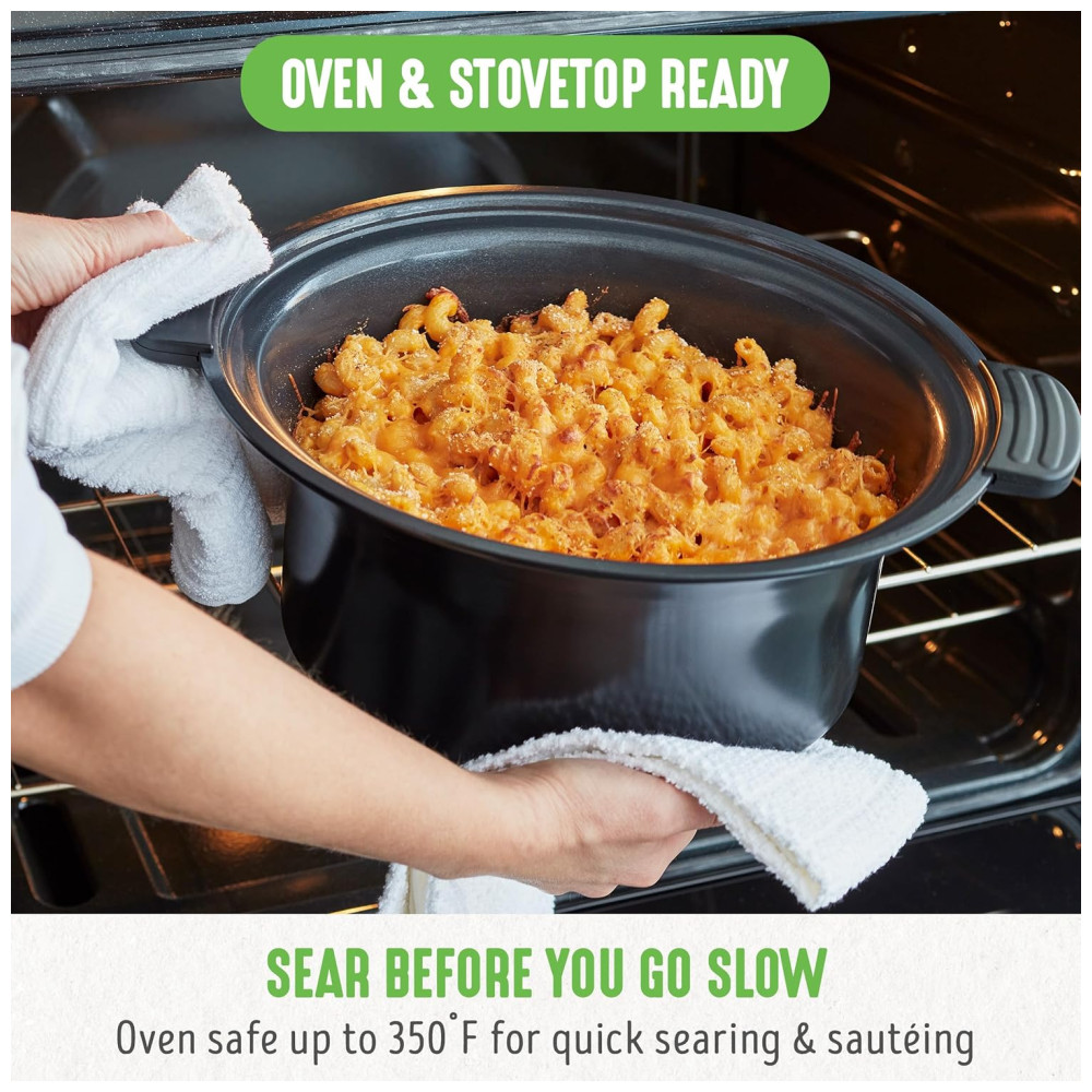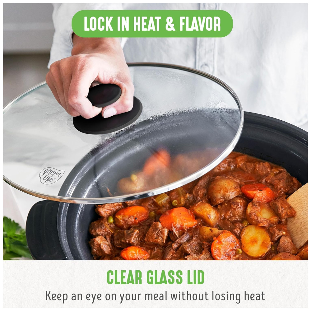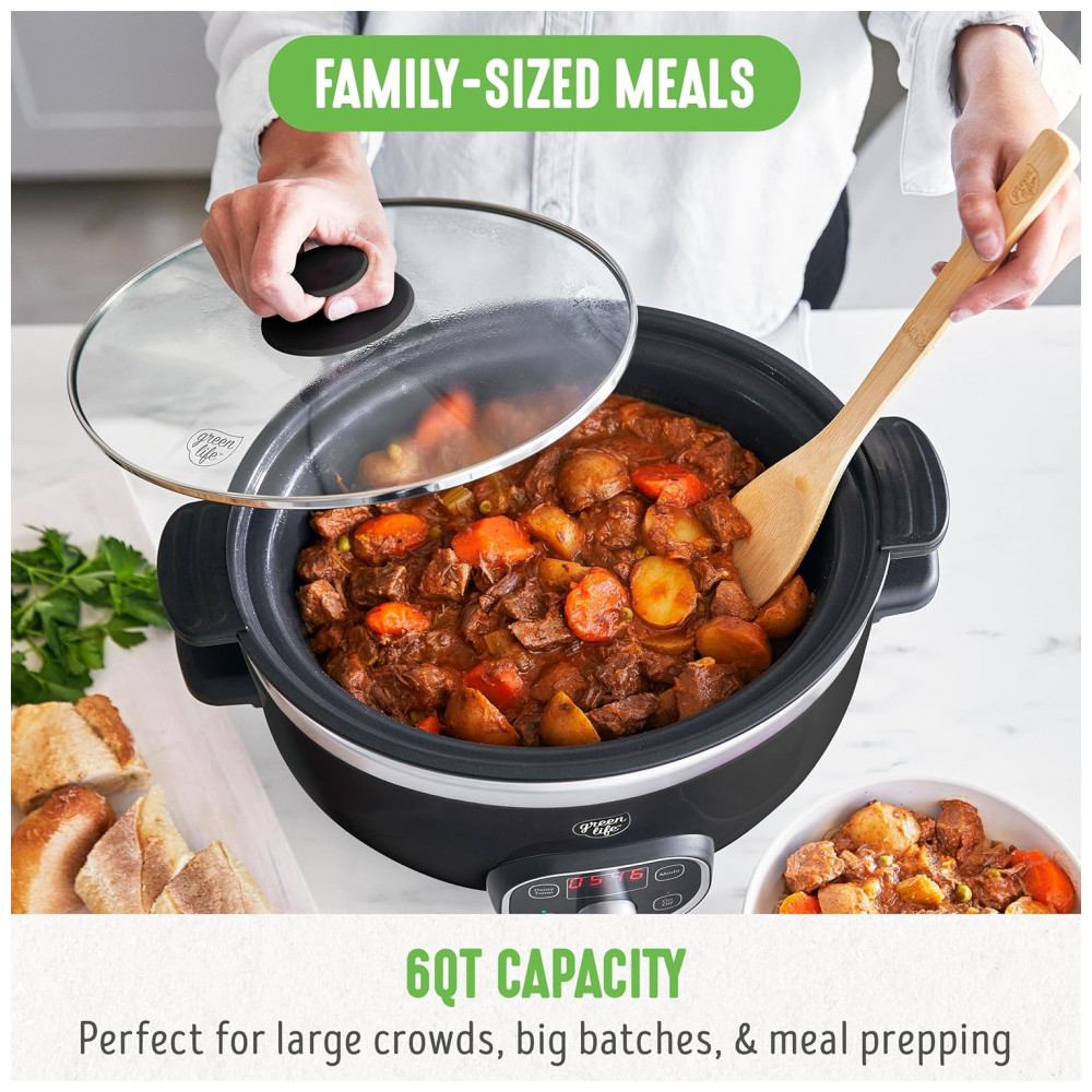 Panela Slow Cooker GreenLife 6QT Preta Cerâmica Antiaderente PFAS-Free Programável Bowl Removível Timer Lava-louças 110V