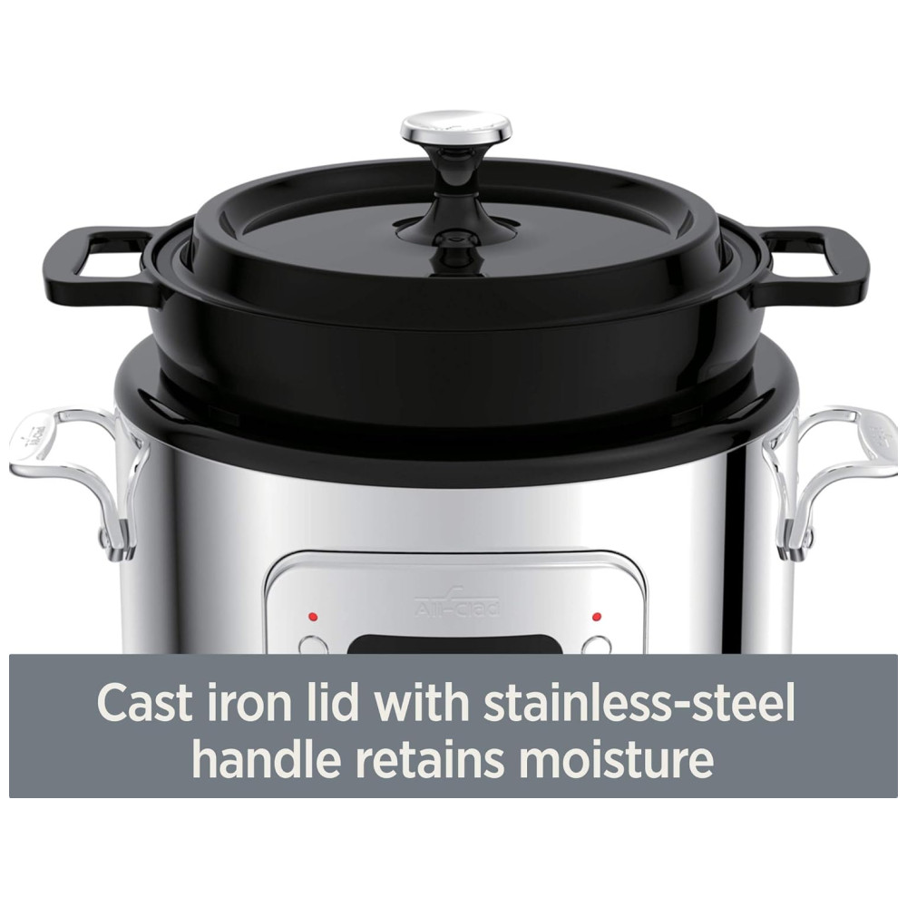 Conveniência e Estilo: Exterior de aço inoxidável premium com o clássico design All-Clad, com alça e logotipo. A panela, além de funcional, tem uma estética elegante para servir à mesa. O visor LCD exibe o modo de cozimento e o tempo, facilitando o acompanhamento. A panela removível é fácil de limpar e segura para lava-louças.