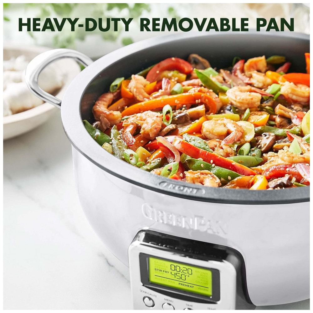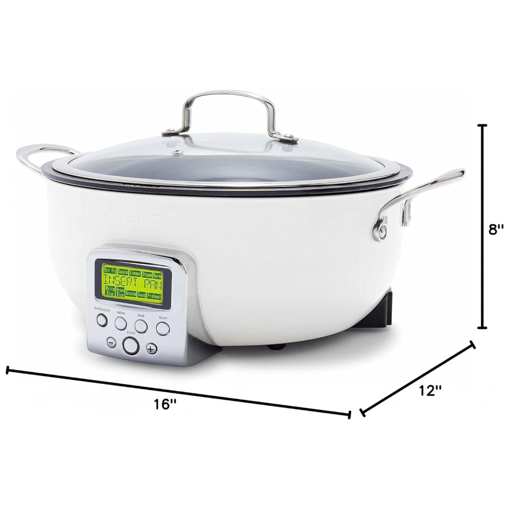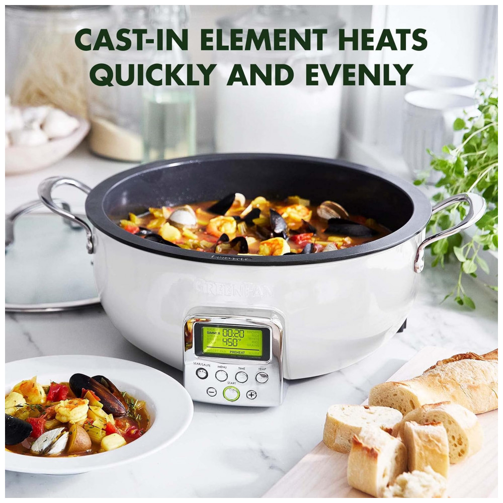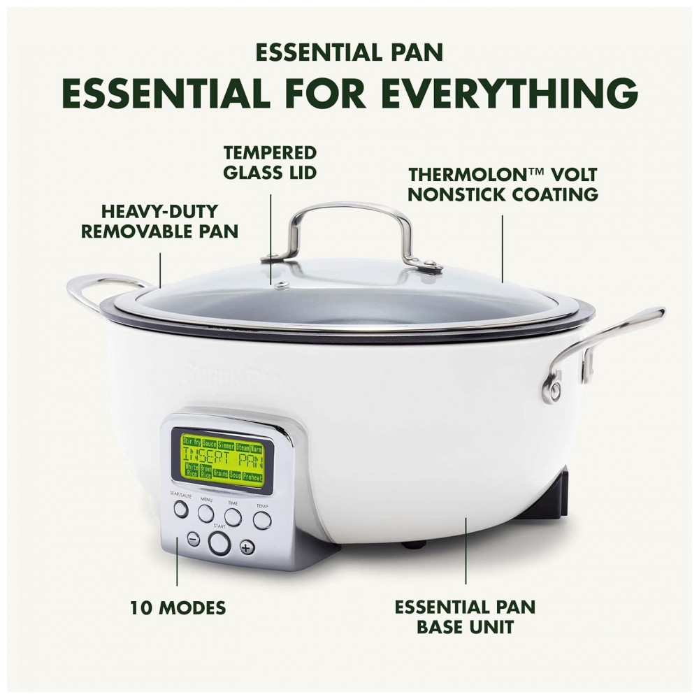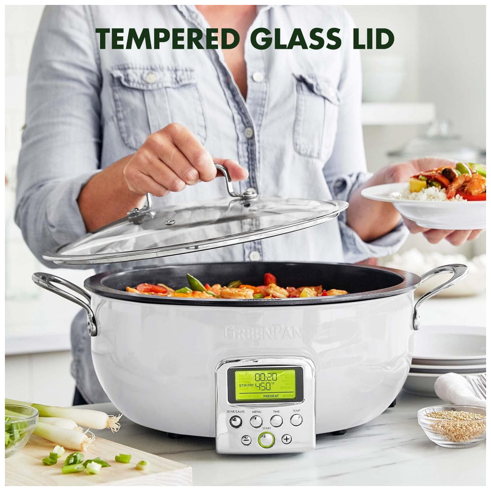 Panela Elétrica GreenPan Essential Smart 6QT 120V Revestimento Cerâmico Antiadherente Display LCD Tampa de Vidro Temperado Cor Cream White
