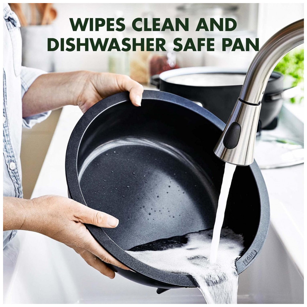 A Panela Elétrica GreenPan Essential Smart 6QT é um equipamento multifuncional desenvolvido para otimizar o preparo de diversas receitas em capacidade familiar. Com 10 modos programáveis, permite cozinhar arroz branco e integral, sopas, molhos, refogados, vaporizar e manter alimentos aquecidos. Sua estrutura conta com revestimento cerâmico Thermolon Volt, reforçado com partículas de diamante para maior resistência, livre de substâncias como PFAS, PFOA, chumbo e cádmio. O elemento de aquecimento integrado oferece distribuição rápida e uniforme de calor, eliminando pontos quentes.