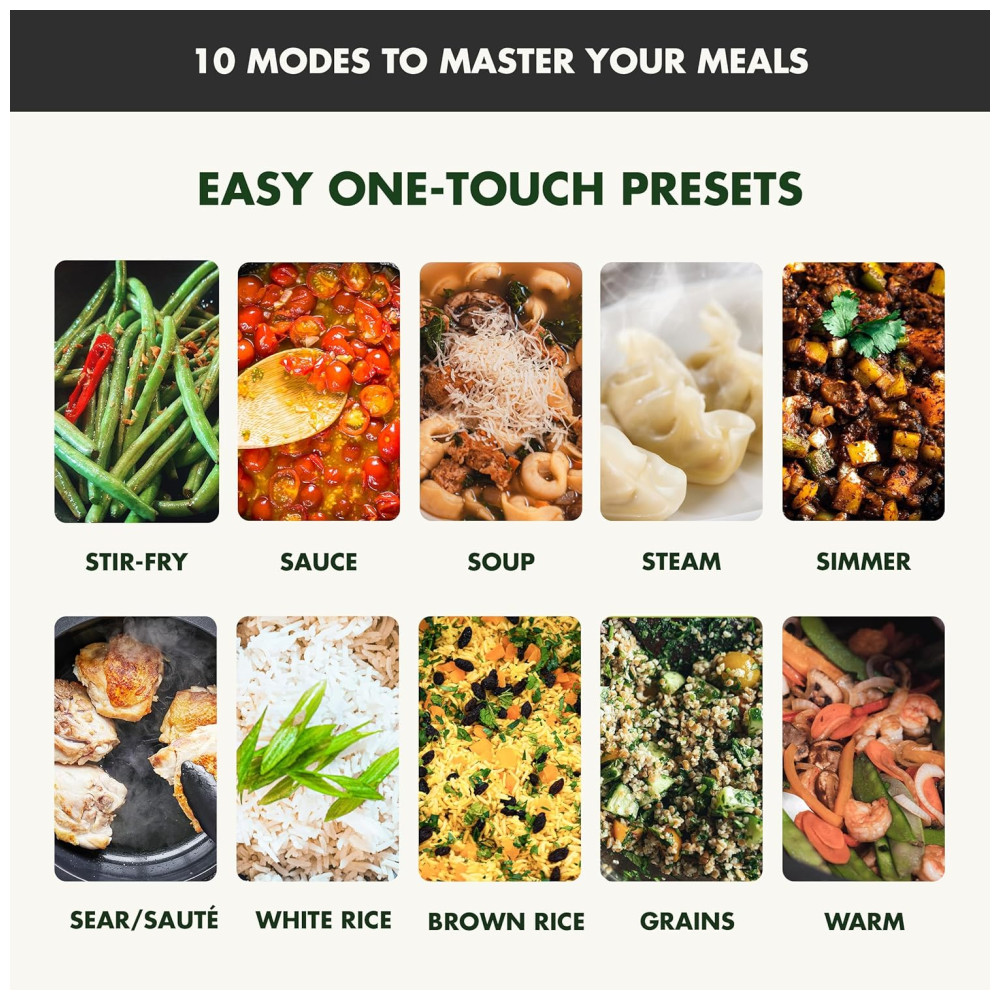 10 Funções em 1: Prepare uma grande variedade de pratos com as opções Stir-Fry, Molho, Sopa, Vapor, Simmer, Manter Quente, Sear/Sauté, Arroz Branco, Arroz Integral e Grãos.