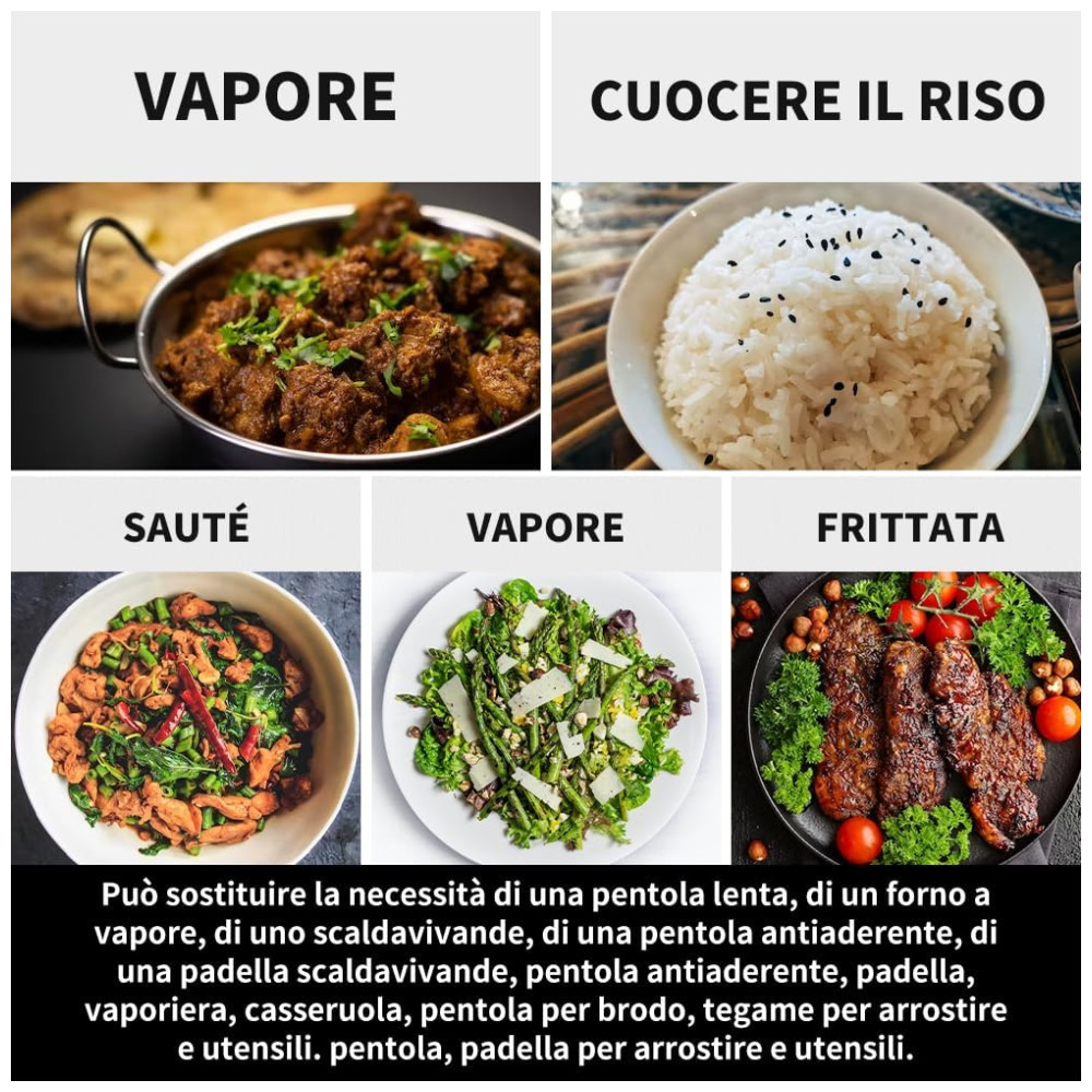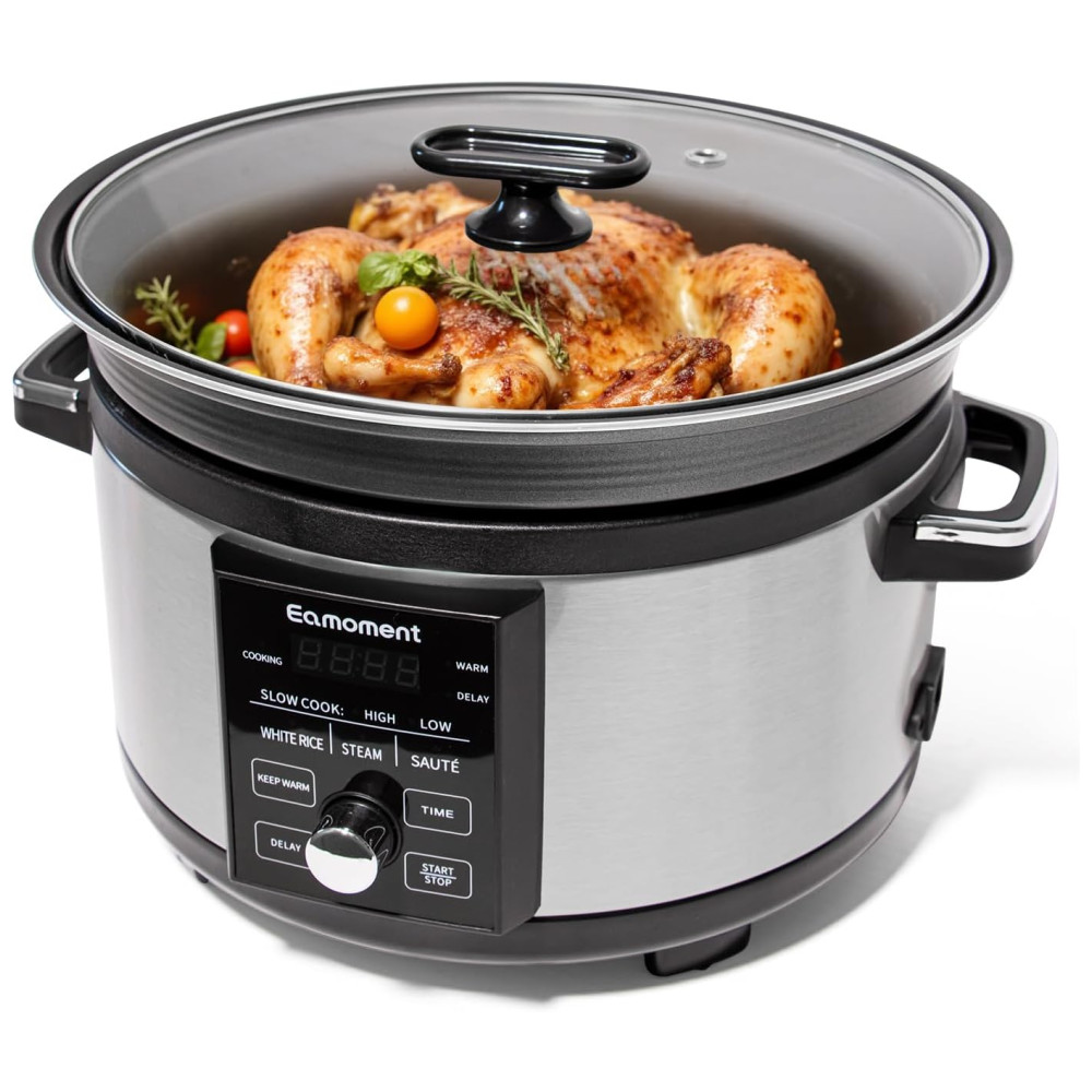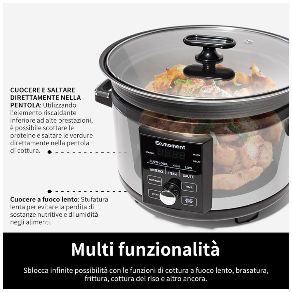 Funções Multifunção: A panela multifuncional Eamoment oferece diversos modos práticos, como Cozimento Lento Alto/Baixo, Arroz Branco, Cozimento a Vapor, Refogar, Manter Quente e Atraso. Com essas funções, você pode preparar facilmente refeições saborosas.