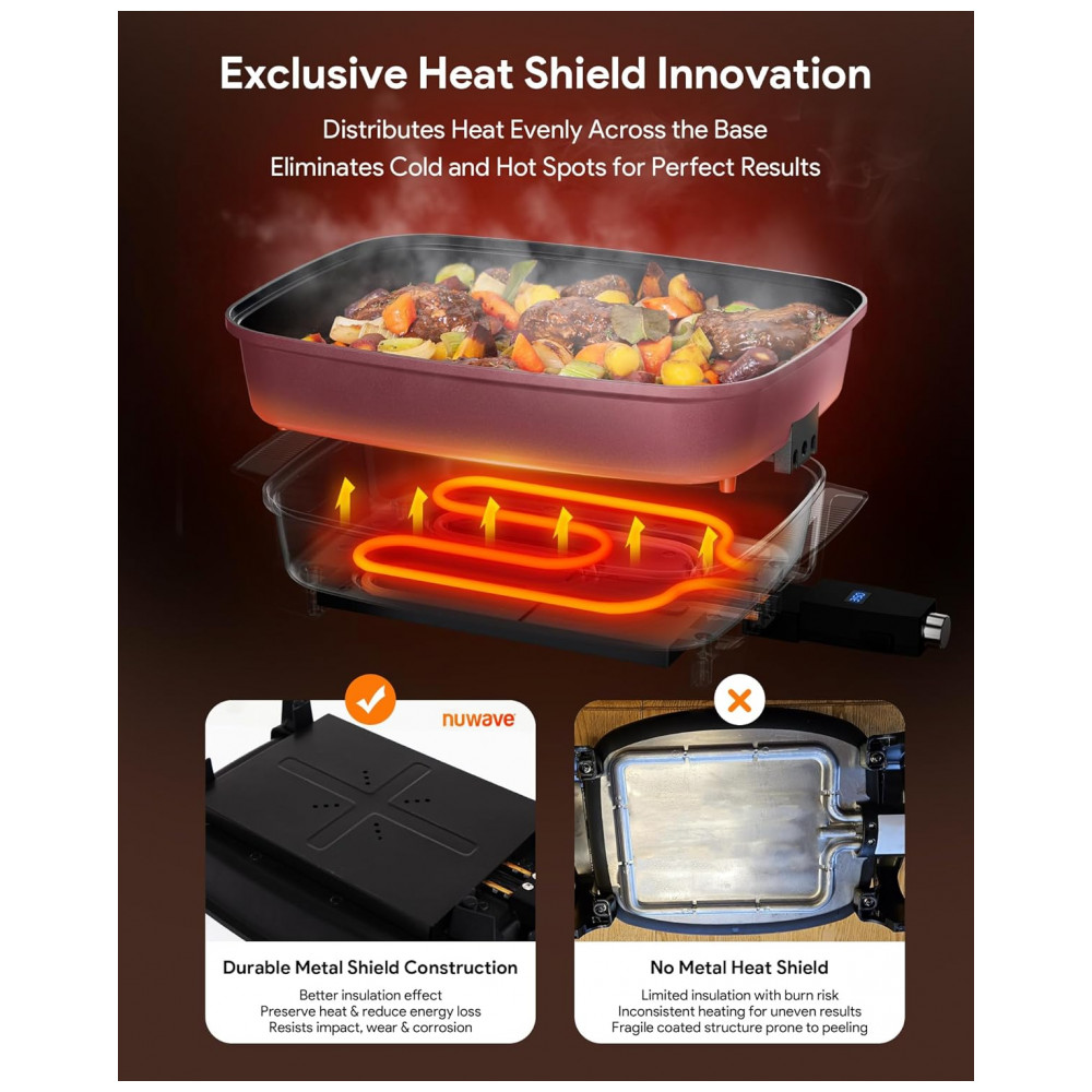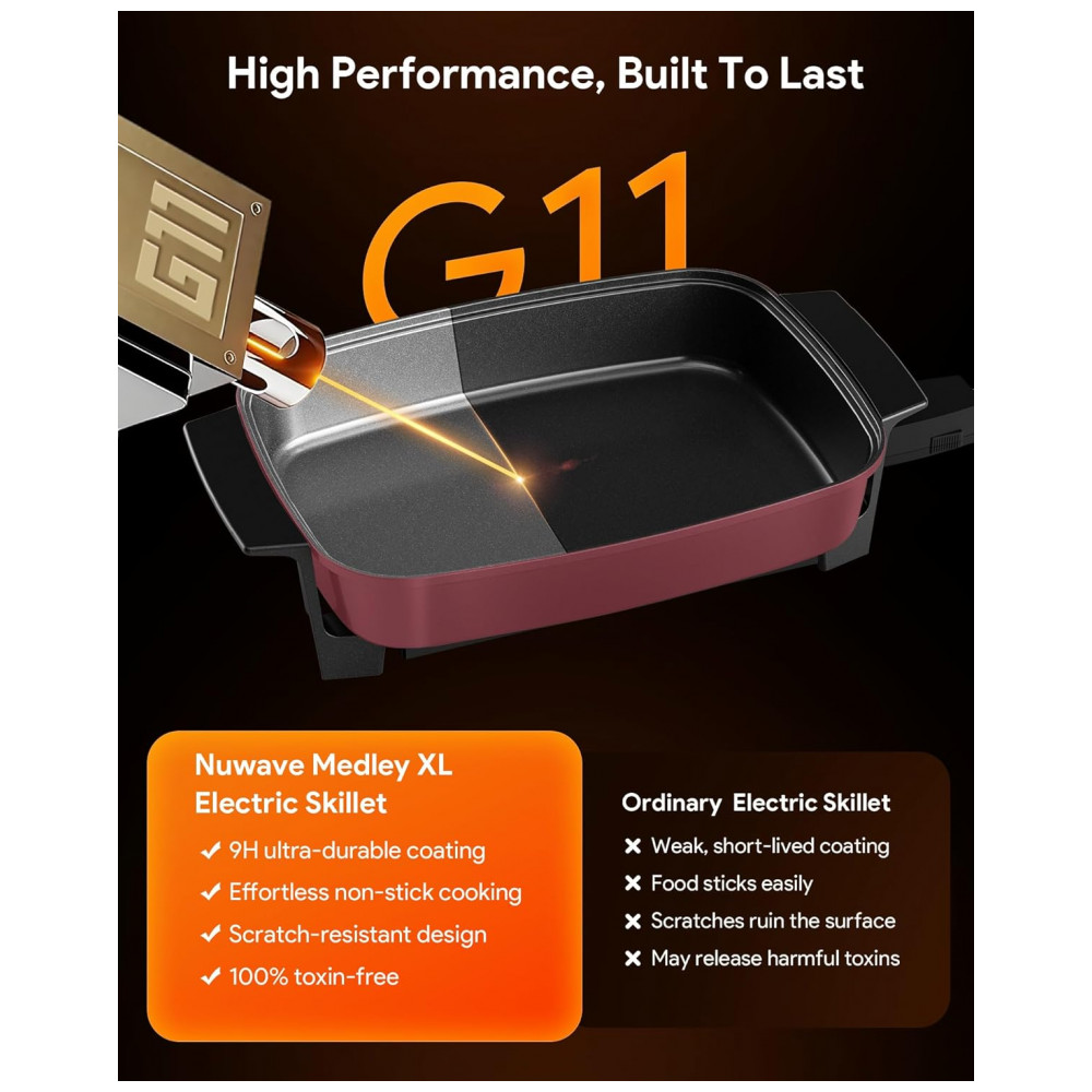 A panela elétrica Medley XL da Nuwave é uma skillet retangular com capacidade de 7 litros, projetada para preparo de refeições em família em diversas superfícies planas com acesso à tomada. Sua estrutura incorpora elementos de aquecimento em formato M e escudos térmicos que direcionam o calor para o interior da cuba, favorecendo distribuição uniforme e reduzindo pontos frios. O controle digital removível permite ajuste de temperatura em incrementos de 5 °C, em uma faixa contínua aproximada de 38 °C a 218 °C, adequada tanto para manutenção de aquecimento quanto para cocção.
