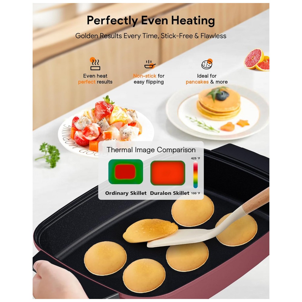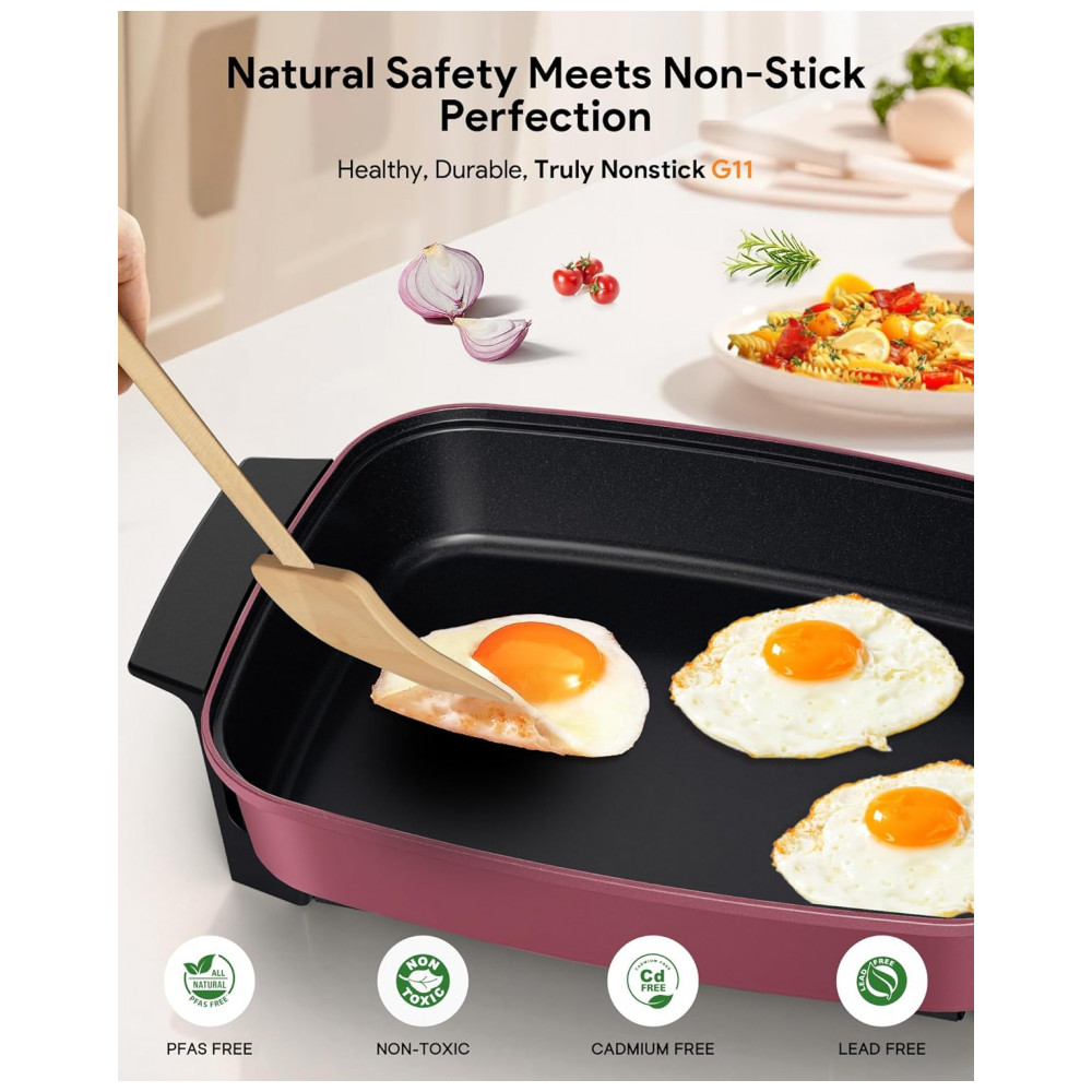 A superfície de cocção utiliza revestimento cerâmico G11 Duralon livre de PFAS, com propriedades antiaderentes e alta resistência a riscos, diminuindo a necessidade de uso de gordura e facilitando a limpeza manual. As laterais altas ampliam o volume útil interno, permitindo preparo de pratos como massas, refogados, ensopados, paella e grelhados em uma única peça. A tampa de vidro temperado ventilada, fabricada em vidro reforçado, foi testada para suportar calor, vapor e respingos gerados durante diferentes modos de cocção.