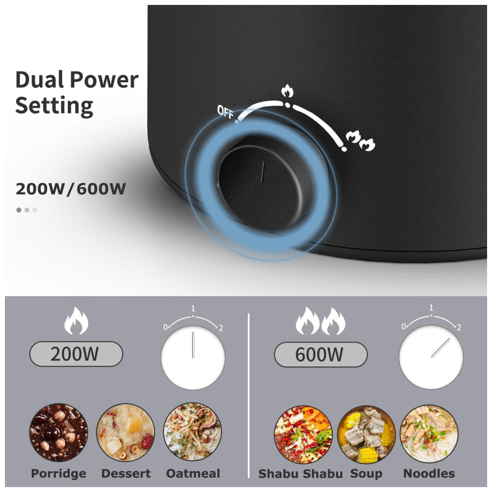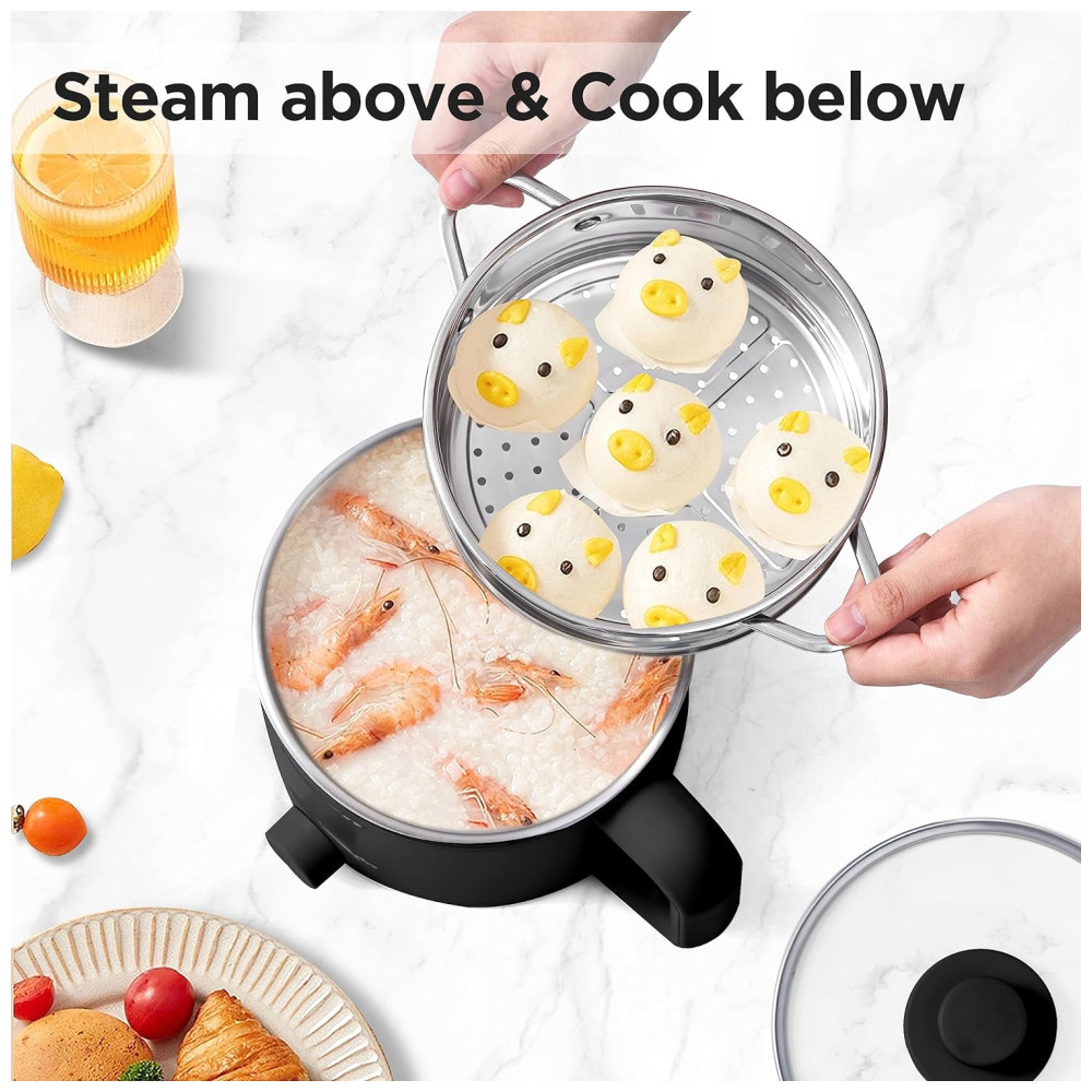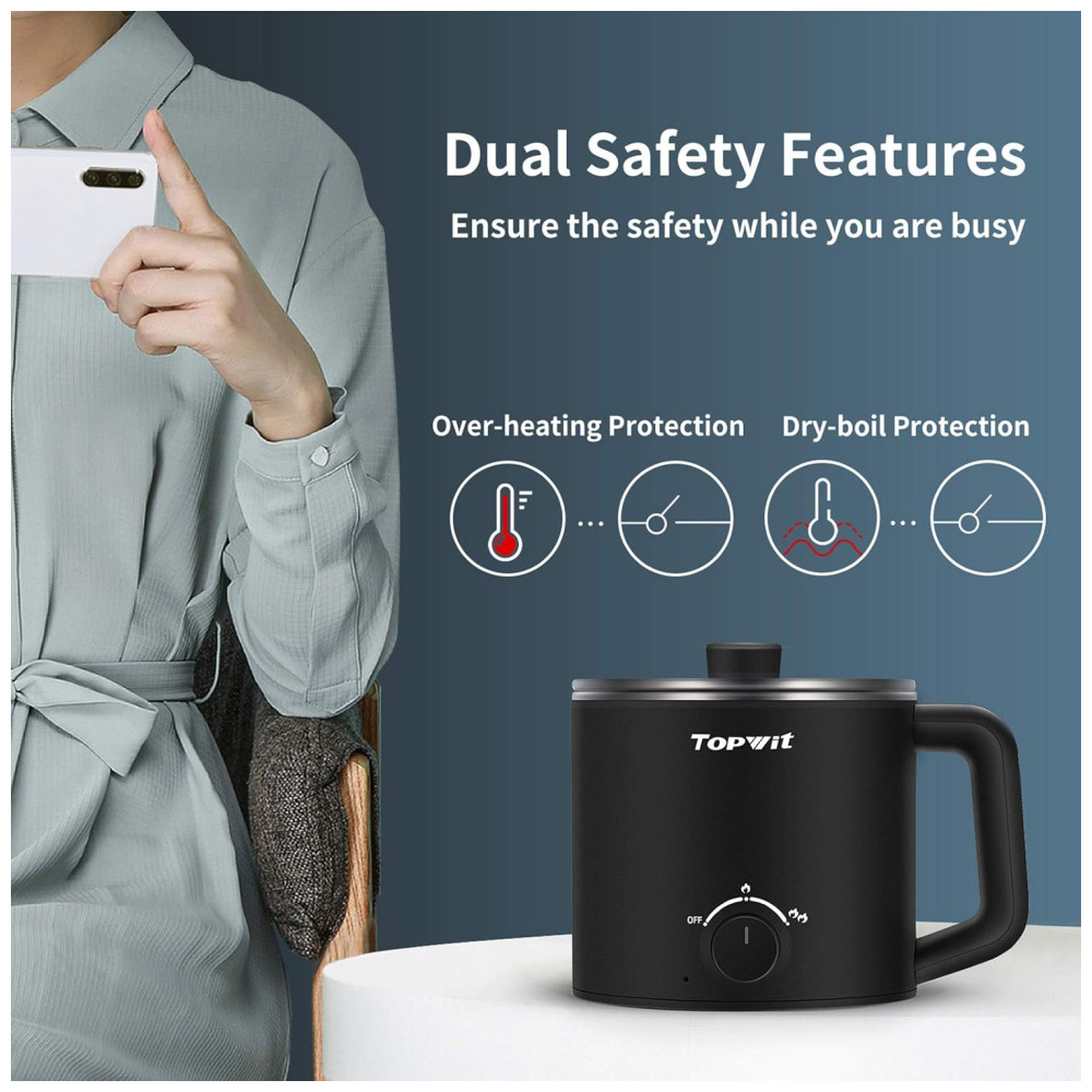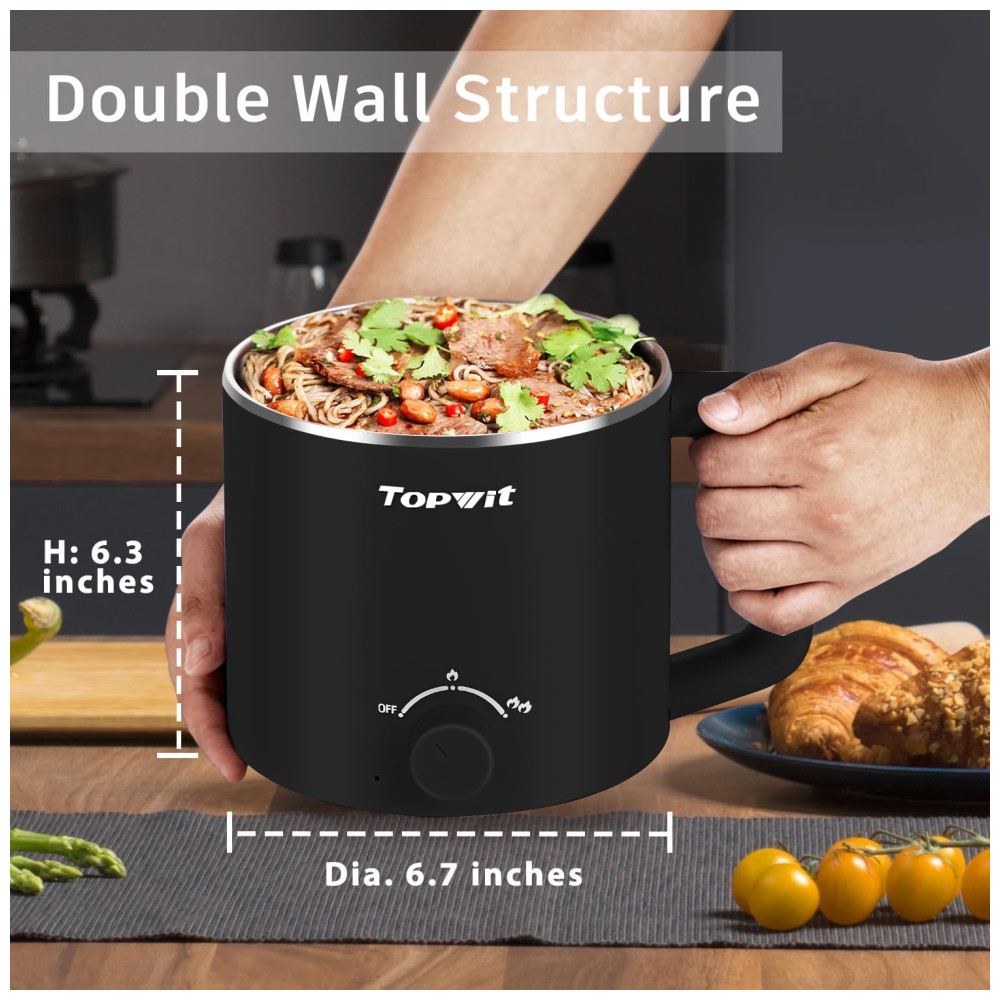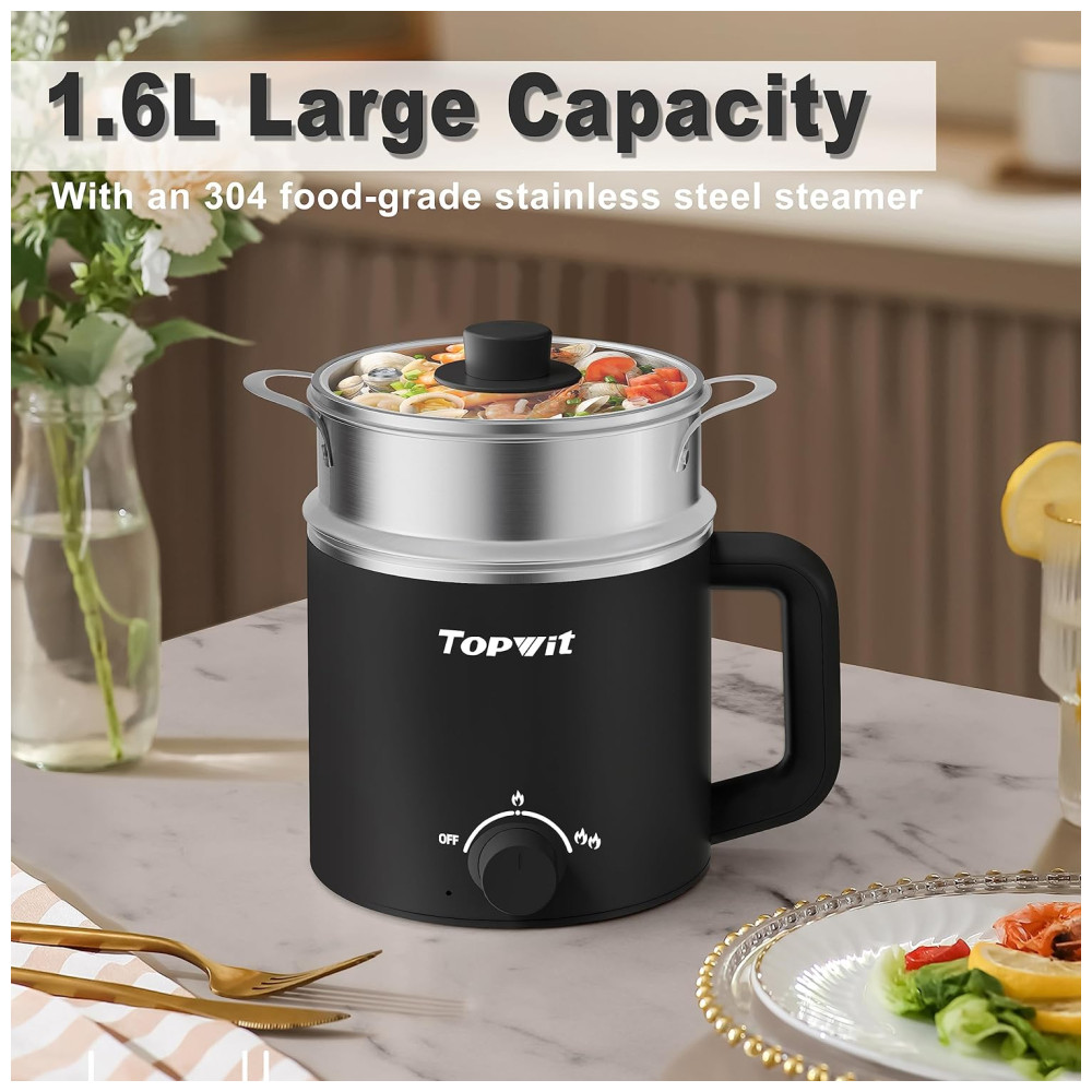 A panela elétrica Topwit possui capacidade de 1,6 litros, ideal para preparo rápido de sopas, massas, ovos, oatmeal e hot pot. Conta com ajuste dual power (200W/600W), que possibilita aquecimento suave ou rápido conforme a receita. O cesto de vapor é fabricado em aço inox 304 de grau alimentício, permitindo o cozimento simultâneo de diferentes alimentos com preservação das propriedades nutricionais.