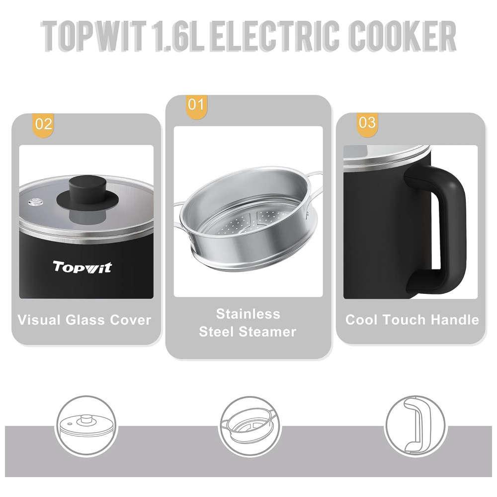 Panela Elétrica Topwit Preta 16L Inox Dual Power 200W/600W Com Cesto Vapor Vidro Temperado Proteção Superaquecimento Portátil 110V