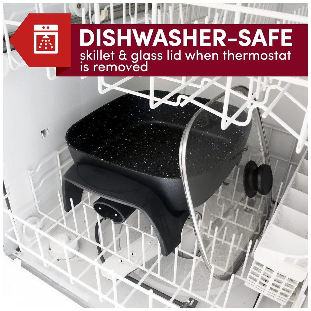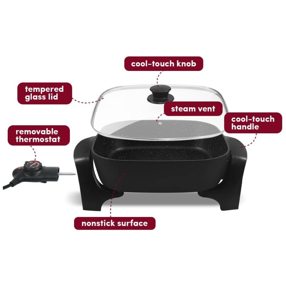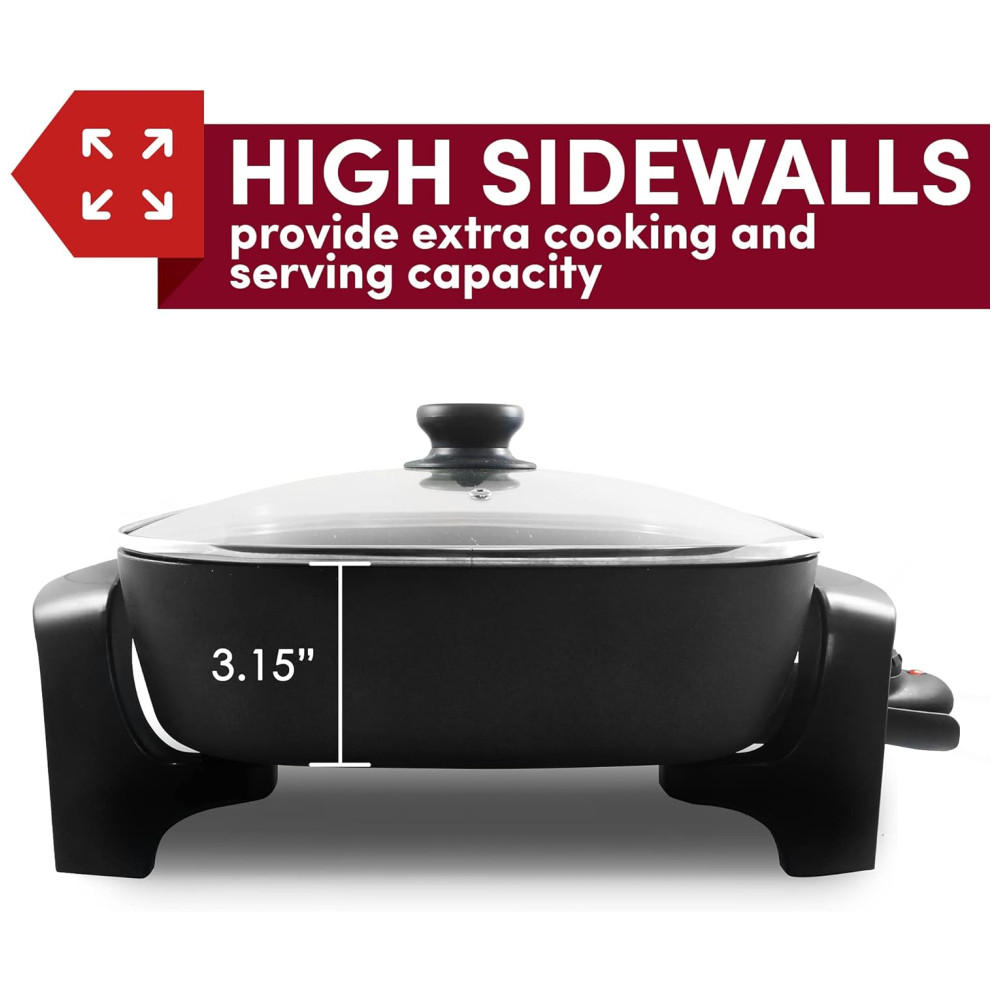Testada e Segura: Com potência de 1200 watts e voltagem de 110V, esta frigideira elétrica é ideal para uso doméstico, com paredes resistentes a respingos de 8 cm e alças com toque frio, tornando-se um presente essencial e prático para inauguração de casas ou casamentos.