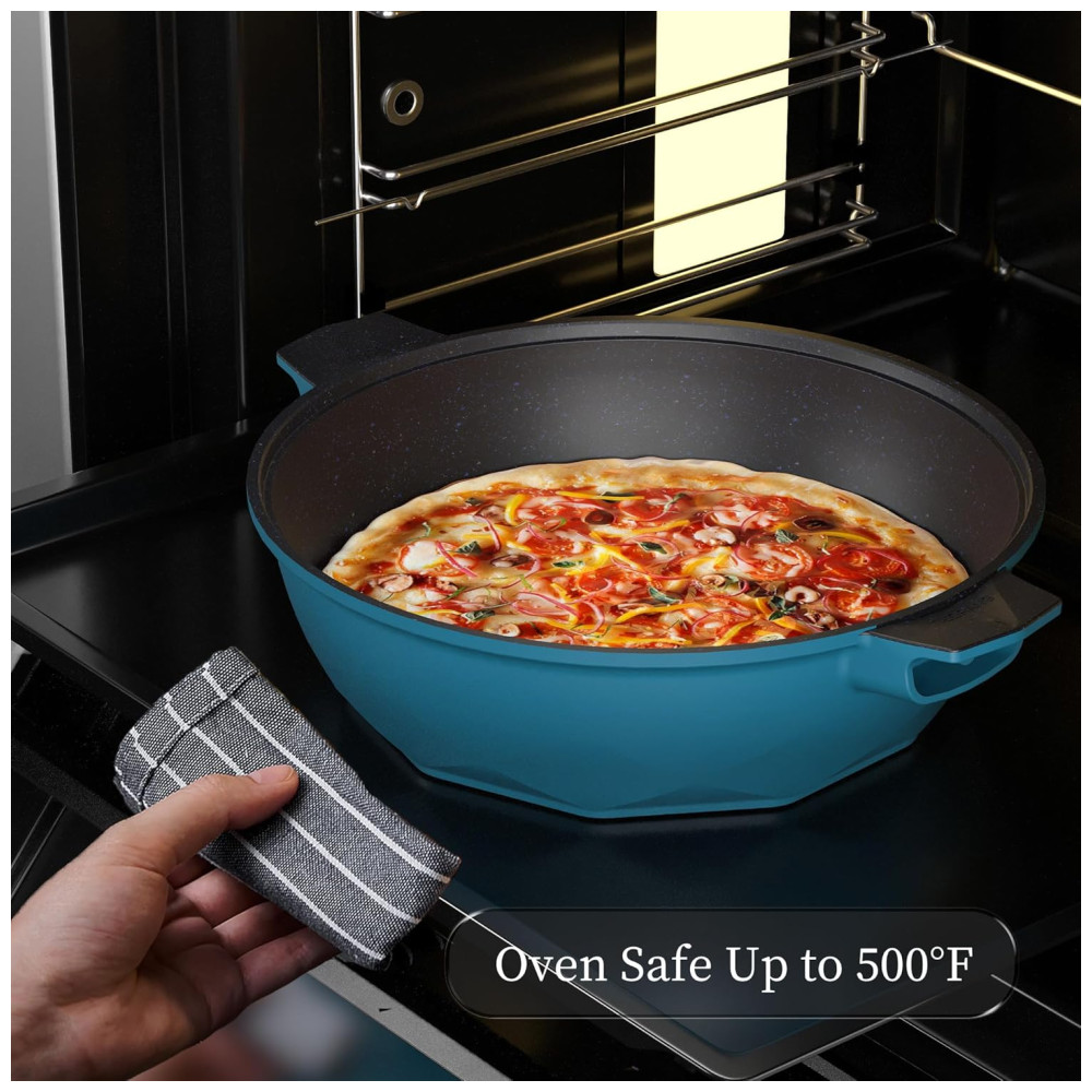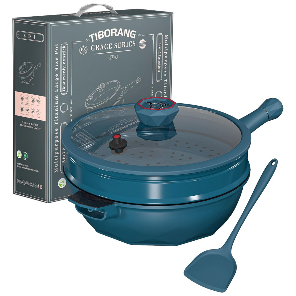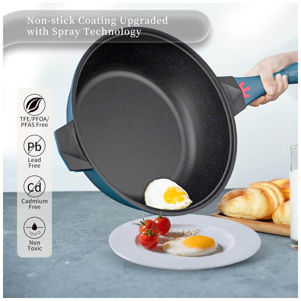 Panela Funda Antiaderente com Indicador de Calor Tampa de Vidro Grelha a Vapor Livre de PFOASegura para Lava-louças e FornoTIBORANG Azul Escuro