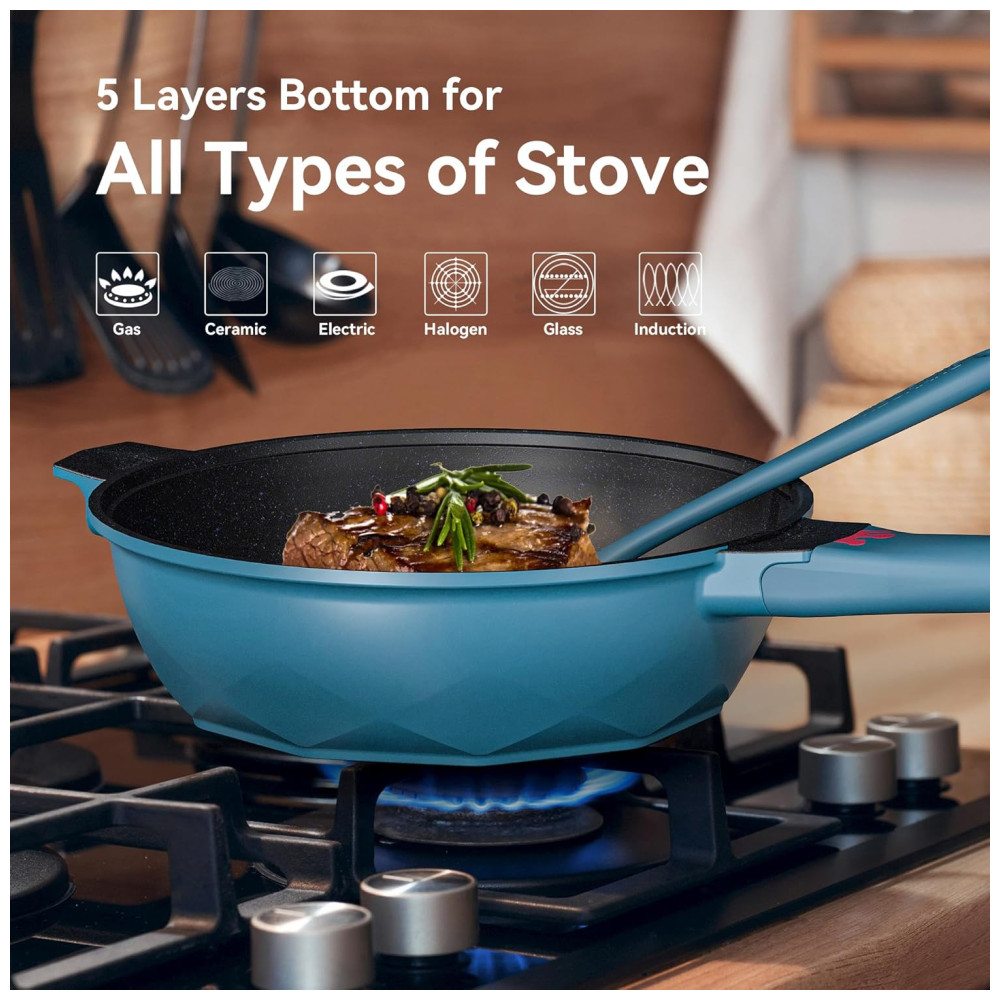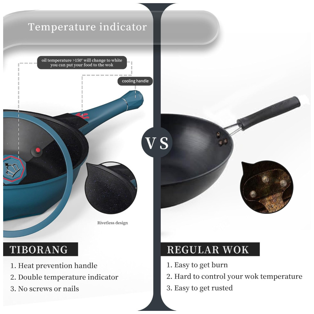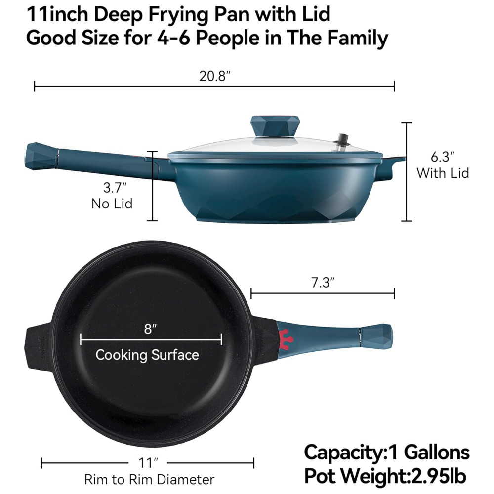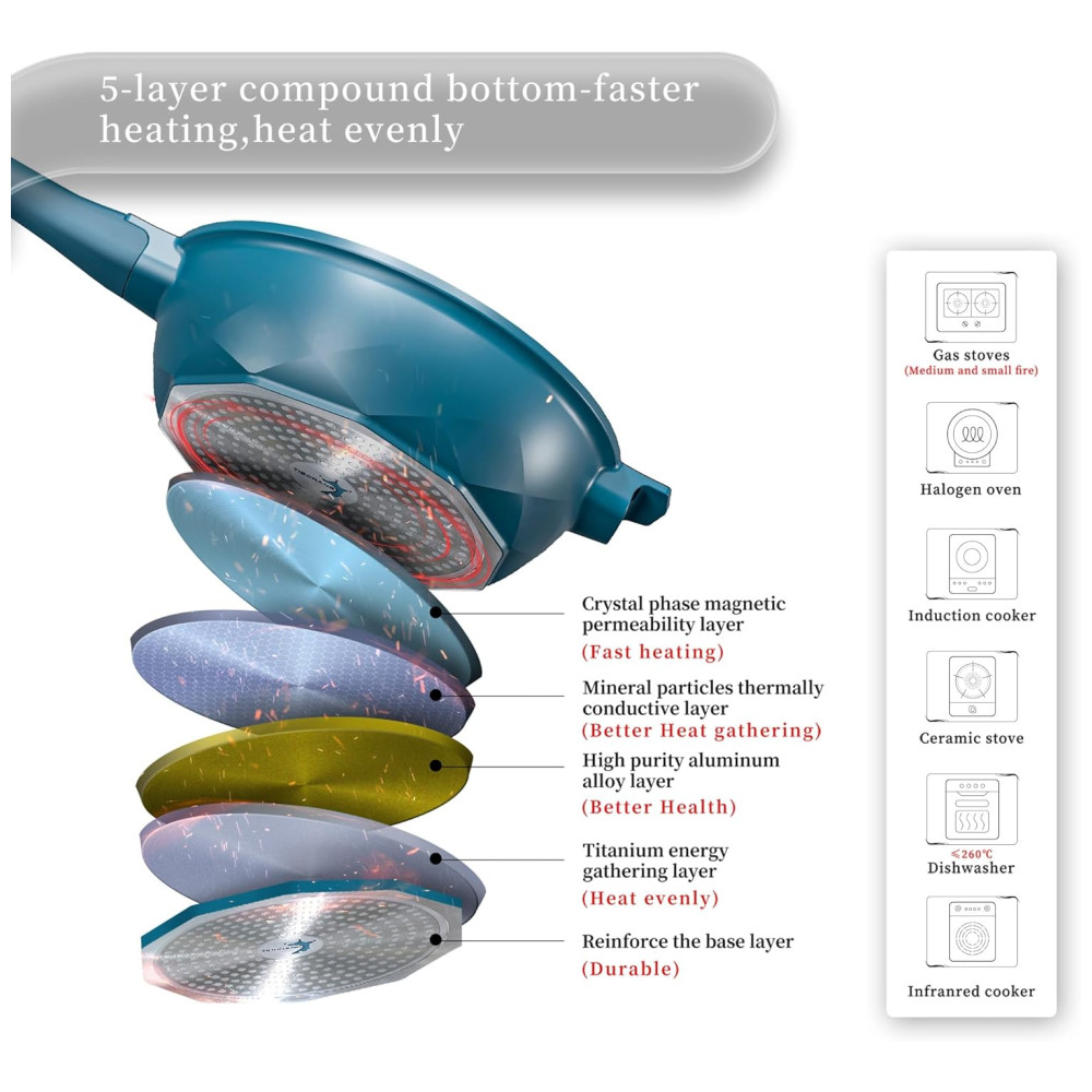 Panela Funda Antiaderente com Indicador de Calor Tampa de Vidro Grelha a Vapor Livre de PFOASegura para Lava-louças e FornoTIBORANG Azul Escuro