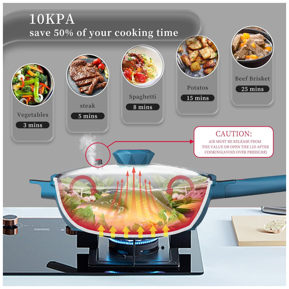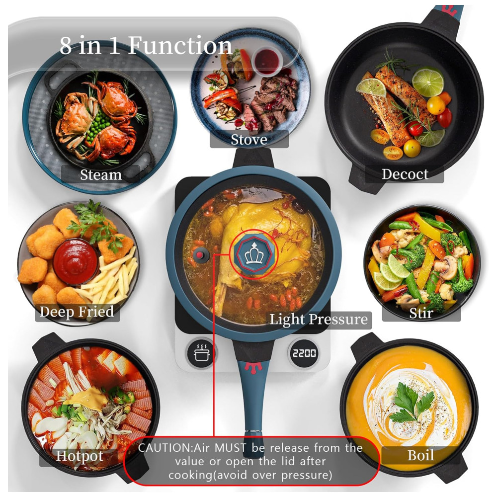 Esta panela antiaderente versátil é perfeita para frituras, cozimento sob pressão leve, vapor, ensopado, fervura, decocção, cozimento, mexer e ensopado quente. Além disso, você também pode usá-la para fazer arroz. Ela pode substituir fritadeira, vaporizador, frigideira, panela de pressão leve, frigideira, caçarola e assadeira, sendo adequada para uma cozinha minimalista de uma panela. O revestimento antiaderente é definitivamente não tóxico e a superfície da panela é revestida de titânio, permitindo que você cozinhe sem óleo ou manteiga. A panela é fácil de lavar, podendo ser limpa com um pano úmido com sabão ou na máquina de lavar louça. Ela possui 5 camadas de placa de aço de indução para distribuição rápida e uniforme do calor de ponta a ponta, funcionando em todos os cooktops, incluindo fogões de indução, e é segura para forno até 260C. A frigideira woks tem um design de patente exclusivo, com padrão de diamante e uma coroa linda na tampa, enfeitando a decoração da sua cozinha. A panela do chef tem uma alça removível, a extremidade frontal da alça é um indicador de temperatura, mudando de vermelho para branco após aquecimento quando a temperatura do óleo é 150, permitindo que você saiba exatamente quando o wok está pronto. A panela é resistente ao calor e a quebras, o que evita respingos, e a junta de borracha na tampa tem um bom ajuste de segurança e não escorrega quando transferida, selando o sabor e os nutrientes para uma comida mais saudável e saborosa. A panela tem 4,66 litros, é muito funda, então você não precisa se preocupar com respingos de óleo em todos os lugares, sendo um bom tamanho para 4,6 pessoas na família. O pacote inclui 1 x 4,66 litros All In One Pan, 1 x caixa de embalagem, 1 x tampa da panela, 1 x espátula de silicone, 1 x grade antiaderente para vapor wok, 1 x almofada de silicone antiaderente e 1 x guias de receitas do usuário. Algumas dicas importantes são evitar cozinhar em fogo alto, não cozinhar a seco por longo prazo, verificar os alimentos na panela a tempo e limpar a panela com óleo após a limpeza inicial com água morna, evitando usar bolas de limpeza de aço inoxidável.