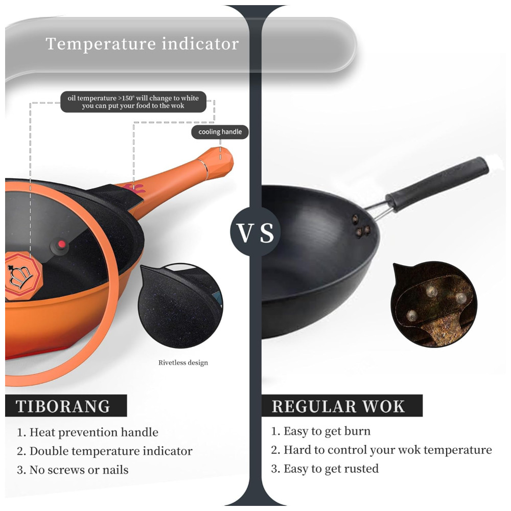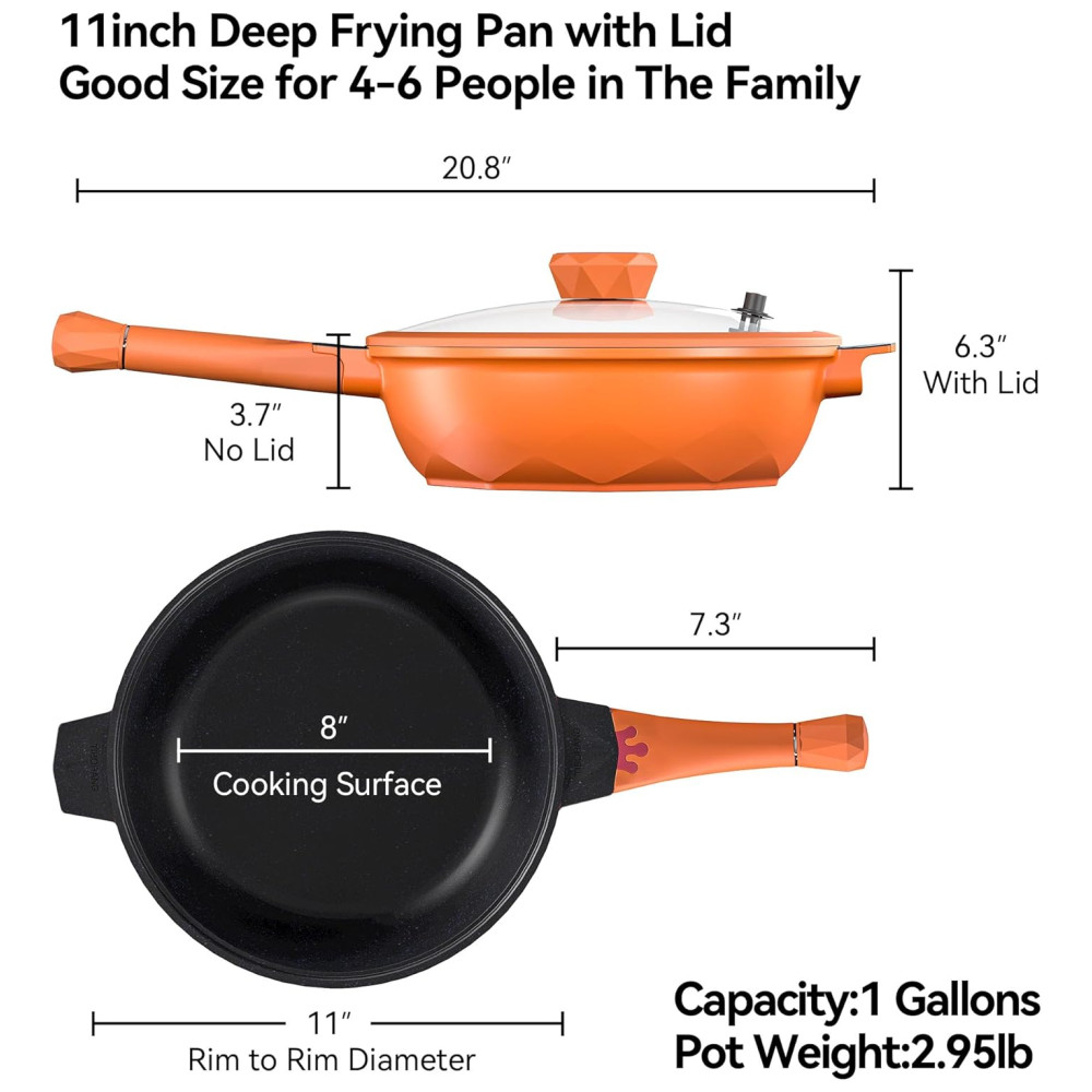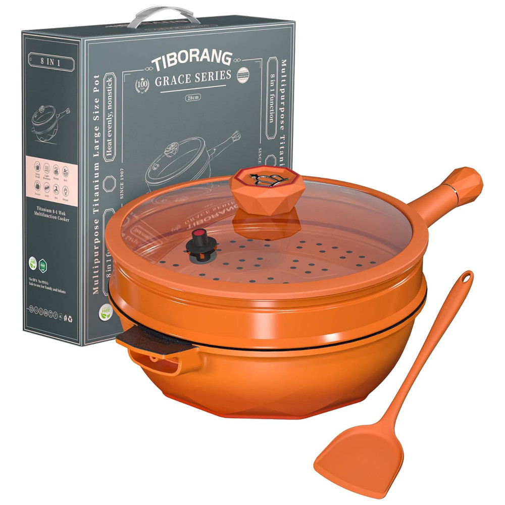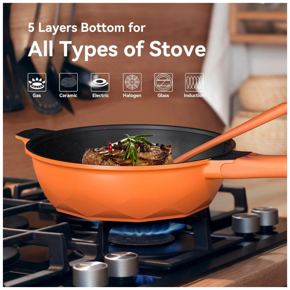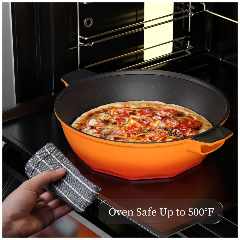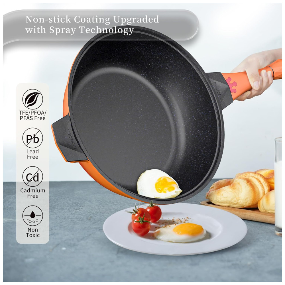 Panela Funda Antiaderente com Indicador de Calor Tampa de VidroCabo Frio Grelha a Vapor Livre de PFOA Segura para Lava-louçasTIBORANGLaranja